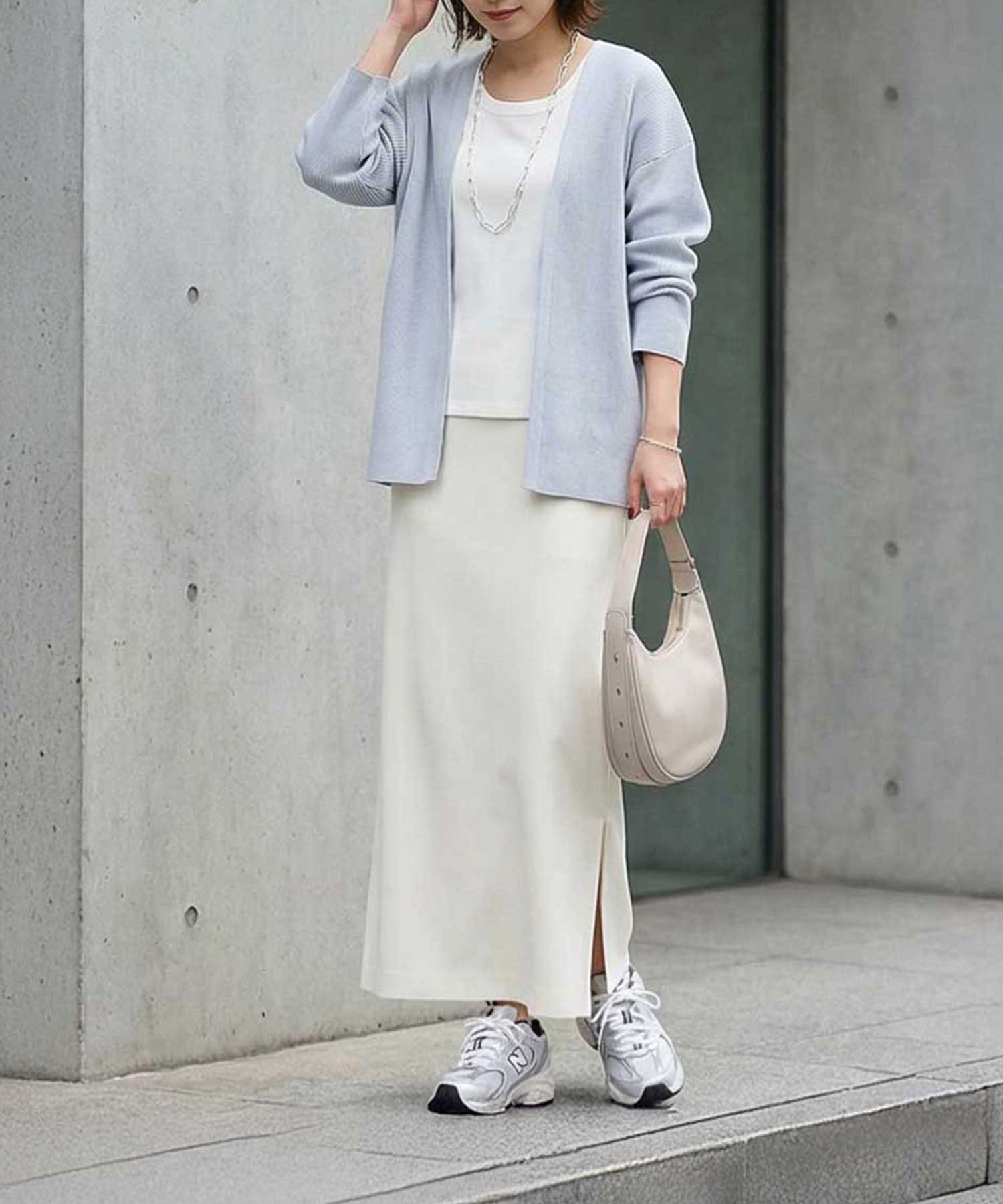 ◆裾にすぼまりの無いストレートフォルム。ボトムスの形を潰さず、スッキリとしたシルエットを作ります。パンツスタイルやIラインワンピース、スカートなら広がりが少なめなものと好相性です。