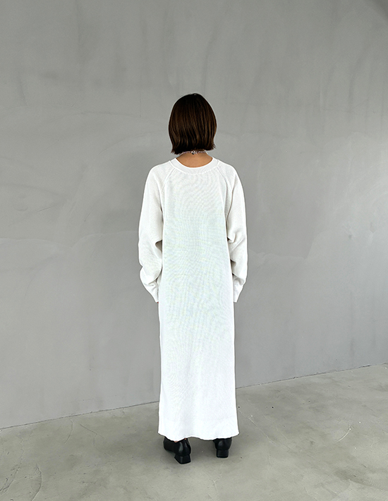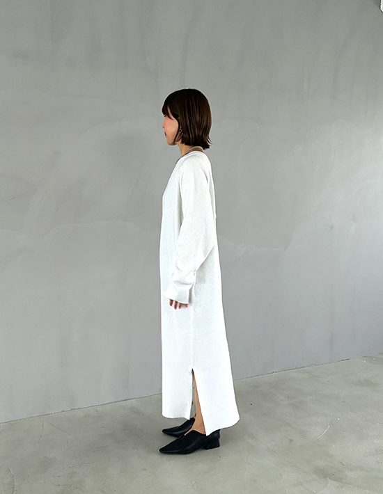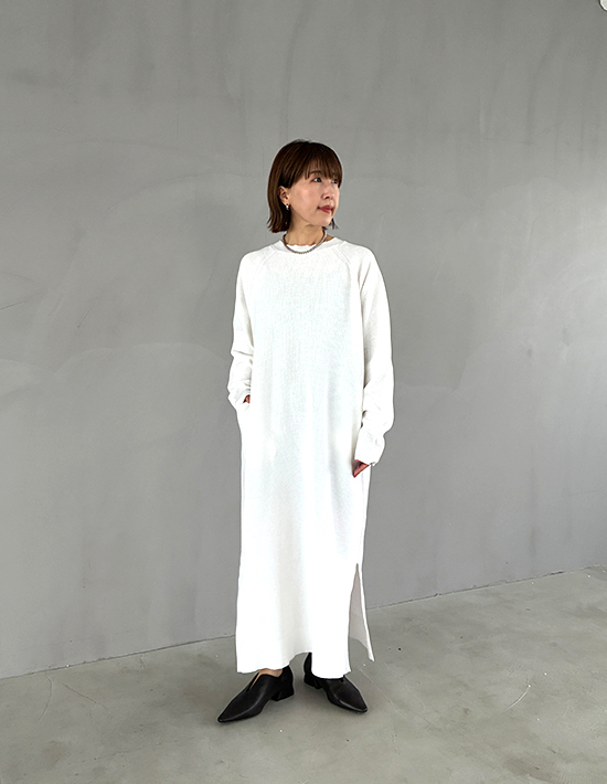 ほど良くキレイめ、ほど良くカジュアルニットをサーマルカットソーに近付けた、質感を楽しむラクちんシンプルワンピース【この商品の特徴】◆サーマルカットソーの質感をニットで表現◆カットソーよりも品のある雰囲気になる大人仕様◆表面凹凸のあるカワイイ編み地◆サラッとして軽くラクな着心地◆どのような丈感で着ても素敵なワンピース◆顔周りがスッキリと見える特殊クルーネック◆カジュアル過ぎないヌケ感のあるデザイン◆ポケットで腹部や腰周りをカバー◆スニーカー合わせもカワイイ◆同じ素材でVネックタイプもあり【この商品の詳細】サーマル編みならではの可愛さをニットで表現すべく、工夫を凝らした春夏素材ワンピース。何故ニットかというと、カットソーの場合は質感がカジュアルに寄るため大人にとっては人やシーンを選ぶ傾向にあり、それを解決するのにキレイめ感を両立させたかったからです。結果、キレイめ感がありつつほど良くカジュアルで、今の気分にピッタリな大人のワンピースが完成。シンプルなので小物次第でキレイめ寄りにしたり、カジュアル感を強めたりと雰囲気が調節できます。◆サイズ感:適度にゆったりとしており、ヒップラインなどが目立たないゆとりを付けています。ゆとりが足りない場合は生地を横方向にグイグイと引っ張り、編み目の詰まり感を緩めるとゆとりがプラスされます。※引っ張った後は返品・交換の対象外となりますので、ご使用が決定してから行うようにしてください。◆丈感:着用すると重力により、平置き寸法よりも5cm程度長くなります。ニットなので若干の個体差があり、体型によっても差が出ますが、基本的には着丈125-127cm程度の着用感になります。普通身長の場合、ふくらはぎが完全に隠れて足首が出るような丈感です。◆厚み:ニットとしての厚み自体はやや薄手寄り。表面に凹凸を付けて編んでいるため、実際の厚みよりもしっかりと感じるような編み地です。◆肌触り:サラッとしていて肌離れが良く、着心地はサッパリとして気持ちが良いと思います。カラッと乾いている系ではなく、適度な柔らかさもある優しい肌触りです。◆比較:姉妹商品のVネックタイプの方が、こちらよりキレイめ感があります。サイズ感等は同じですので、雰囲気やデザインのお好みでお選びください。【デザインの補足事項】◆首元:通常はカジュアル感が出て『似合わない現象』を生みがちな首元リブも、特殊な形状と質感で難なくクリア。糸の細さを利用した薄くスッキリとした襟ぐりで厚みが出ず、逆に良い効果を生みます。適度な開き感もあるため首や顔がシュッとして見え、髪の毛を下ろしていても重たくなりません。◆裾スリット:両サイドにヌケ感を作ることで、視覚的な軽さによる着痩せ効果をプラス。抵抗が無ければ素脚を見せるとオシャレですし、隠したい場合はレギンスなどを合わせても良いと思います。【着方のポイント】このワンピースは両サイドのポケットにボリュームを出すことで、生地を浮かせて腹部や腰周りをカバーする効果があります。お届け時は編み目が詰まっていますので、ポケットが出っ張り気味に見えます。ご使用が決定しましたらポケットの上下部分の生地をグイグイと横に引っ張り、編み目を緩めてポケット部分と高さ(=出っ張り具合)を揃えてください。それでもポケットの出っ張りが過剰な場合は、ポケット部分をスチーマーやアイロン(当て布使用)で潰すようにしてください。多少は盛り上がっている状態が正解で、その方が離れて全身で見た際、ウエストがくびれて全体のバランスが良く見えます。さらにそこが出ていることで、腰張りもナチュラルにカバーしてくれます。ポケットに手を入れて動かしていると、形がどんどん馴染んでいきます。【さらにプラス情報】◆季節感:春夏用素材ですが見た目はとくに季節感を問わず、ご自身の体感温度にマッチすればいつでもご使用いただけます。◆暖かさ:しっかりとしたカットソー素材のワンピースと同程度(基本的に真冬には寒い感じ)です。◆丈伸び:ハンガーに掛けておけば多少は伸びると思います。◆重ね着:首開きの詰まり感がないため、下に首詰まり型のクルーネックカットソーなどを着て『首元からチラ見せ』コーデをすることもできます。◆ボトムスの重ね着:スリットがあるので、お似合いになればお好みでワイドパンツやロングスカートを重ねてみるのもいいかもしれません。そのバランスが良いか悪いかはその方の個性に左右されますので、ご自身でご判断いただければと思います。◆羽織り:一枚で着ることを想定したゆったり感ですが、雰囲気が合えばお好みでジャケットなどを重ねてもいいので、お好きに合わせてみてください。アウター系はなんでも羽織れますので、一枚で着るのに抵抗がある場合は、一案として室内OKの薄手のブルゾンやシャツ型ジャケットなど、どこかアウター味のあるものを着ても素敵だと思います。◆