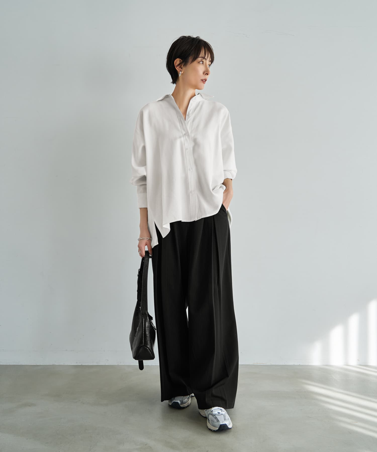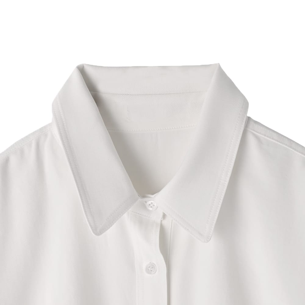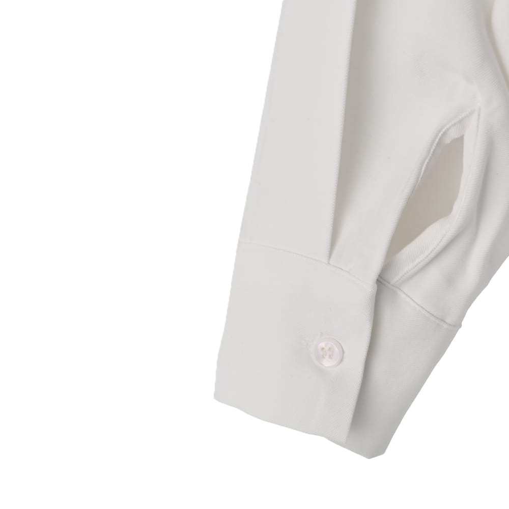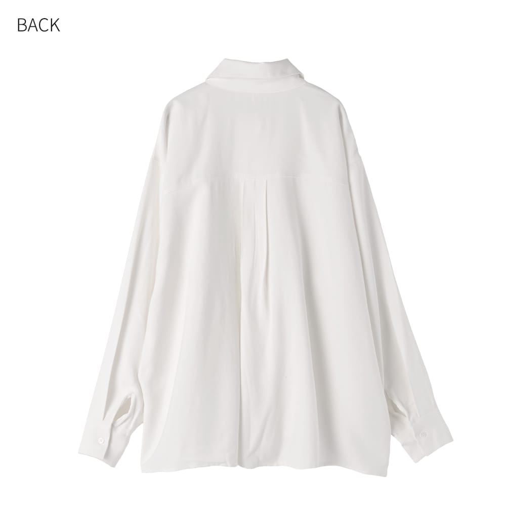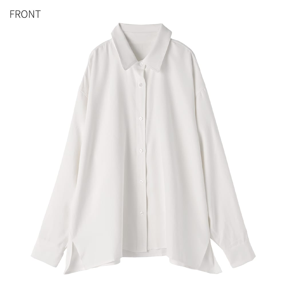 一枚で着てカッコ良くオシャレな形の白シャツスタイルを作るならコレが◎湿度のある質感も素敵なホワイトシャツ ◆1/29インスタライブご紹介商品◆アーカイブのご視聴はこちらから→【2026/1/29ライブ】ーいつものデリより生地やデザインに凝った、ワンランク上のLUXE(ラグゼ)ライン。【この商品の特徴】◆しっとりとした独特の質感が素敵な生地◆白シャツとしては透け感がほぼ無い◆一枚で着るシャツとしてカッコよく完成された形◆前後左右どの角度から見てもカワイイ◆中に薄手のインナートップスを着る重ね着も◎◆ゆったりとしたサイズ感◆こなれ感のある雰囲気◆寒い時期から着やすいしっかり感あり◆基本的にアイロンは不要【この商品の詳細】着たときの立体的なフォルムがとても素敵な、一枚でキマるオシャレ白シャツ。湿度のようなしっとりとした触感にサラッとしたハリ感が共存した、表現のし難い、だけどオシャレでお薦めな生地を使用しています。この生地は2016年に大ヒットを記録した『しっとり厚生地プルオーバーシャツ』の生地と似ており、その際もお客様から「生地がとてもいい!オシャレ」と大好評をいただいたお墨付きの質感。しなやかですがハリ感もあり、普通の白シャツとはひと味違った雰囲気が楽しめる一枚です。※そして当時の生地よりもシワが気にならなくなっている、というバージョンUPタイプです◎◆身幅が大きくゆったりとした構造。その生地量とハリ感が生む動きや立体的なフォルムが魅力。そのへんの白シャツとは一線を画すような、着たときのオシャレさや形の美しさがあります。◆シャツ生地としてはしっかり感があり、寒い時期に着ていても寒々しさが無いタイプ。中に薄手のタートルを入れるなどインナー合わせをすれば、寒い時期から活用できます。◆他のシャツとの違いは、まずシャツとしての生地が変わっているところ。そして何か(ニットなど)の下に着ることは想定しておらず、これを主役として着こなすことにフォーカスしている点、裾をアウトで着るのが基本のデザインになっている点が異なります。◆生地にハリ感があるため、首元のボタンを開けた着こなしもカッコよくキマります。襟もキレイに立ちます。◆白シャツとしては透け感がほぼ無く、ベージュや薄いブラウン系など、透けにくい色の場合は皆無。黒などの場合はなんとなくわかるかどうか…という、気軽に着やすい感じもポイントです。◆素材の雰囲気と合わせた『真っ白ではない白さ』もコダワリの特徴。これによりオフィス感や真面目感あるいはコンサバ要素がなく、カジュアルアイテムとの相性も高まる振り幅の広さが生まれます。キレイめコーデに使用する場合は、こなれた雰囲気をプラスできます。※見た目は普通の白シャツですが、真っ白なものと並べれば違いがわかります。【さらにプラス情報】◆暖かさ:一般的な白シャツよりは若干暖かいかな、という程度です。◆ボトムス:スカートでもパンツでも合います。◆裾:前後の丈感に差を付け、背面のタックを使い、(横から見ると)少しテントラインのような立体感が出るよう設計されています。裾をアウトで着ることでその可愛さが活かされますので基本的にはアウトで着ますが、お好みで裾インも可能です。◆羽織り使用:前を開けて羽織りのように着ることを考えたデザインではありませんが、構造的には可能です。お好みでお試しください。◆シワ:多少はできますが気になるほどではなく、もしも気になる場合は霧吹きをかけて手指で軽くシワを伸ばし、ハンガーに掛けておけばOKです。洗い後に干す際は、なるべくシワを伸ばして干すようにしてください。◆手洗い:洗う際は柔軟剤をきもち多めに使うのがこの質感には向き、お薦めです。柔軟剤を省くと→おそらく不要にシワが生じると思います。◆静電気:とくに発生しやすい生地ではありませんが、おきるか否かはその方の帯電体質具合や合わせアイテムなどにもよりますのと、冬場は乾燥でどうしても…という可能性的なところはありますので、もしも気になる場合はエレガードなどの静電気防止スプレー等でご対処ください。【その他の仕様などの情報】◆着用時期:10-5月頃が目安◆サイズ感:ゆったりとしたサイズ感(Lサイズ体型にも対応)◆丈感:前は太もも上部にかかる丈感/背面はヒップが隠れる程度の長さ◆シルエット:身幅がワイドなストレート◆首元:シャツ襟◆肩幅:問わないタイプ(ドロップショルダー)◆アームホール:広い◆袖幅:広い◆袖丈:長袖(指先がちょこんと出る長さ)◆袖口:カフス+ボタン1個あり◆袖のたくし上げ:少しは可能。しっかりと上げる場合はボタンを外す必要あり。◆厚み:シャツとしてはしっかりめ◆柔らかさ:ハリ感としなやかさが共存◆肌触り:しっとり感+サラサラ感◆毛羽立ち:できない◆伸縮性:なし◆光沢感:なし◆透け感:ほとんど無し◆スリット:両サイド裾にあり◆着脱:前開きボタンタイプ◆ボタン:白蝶貝パール風ボタ
