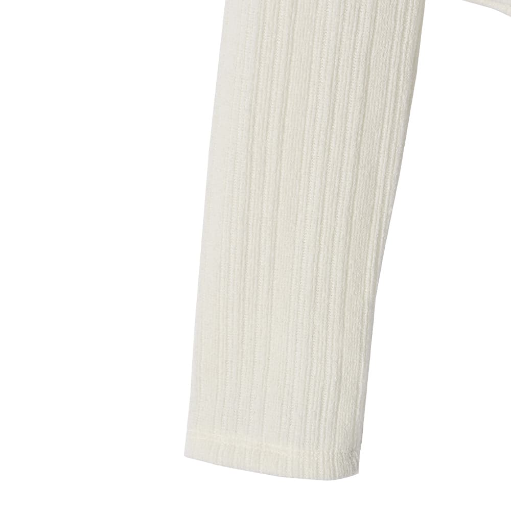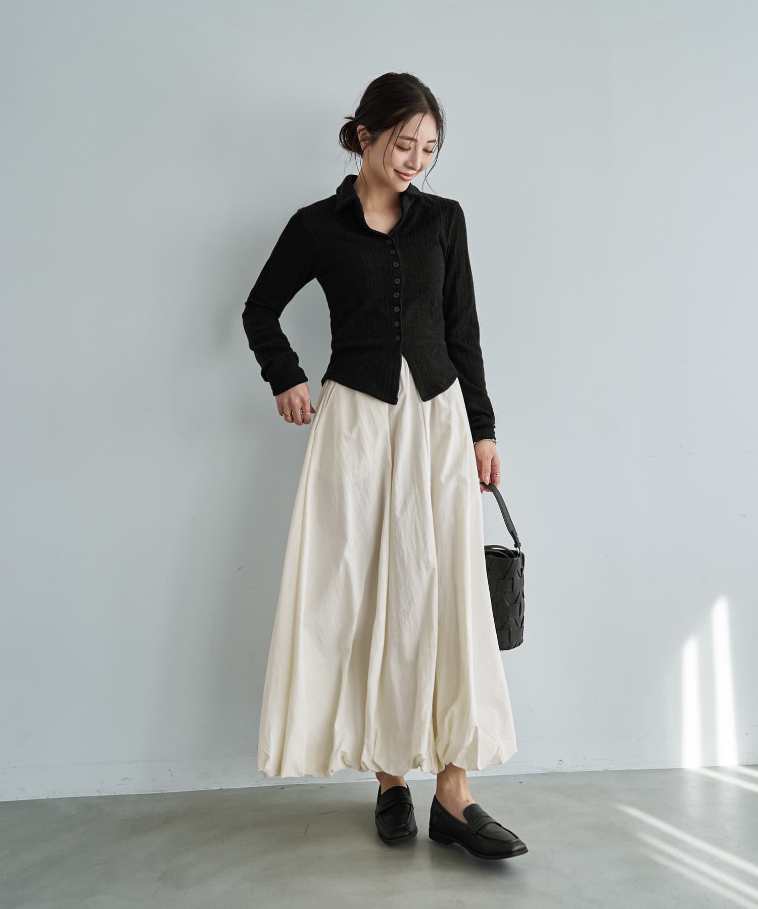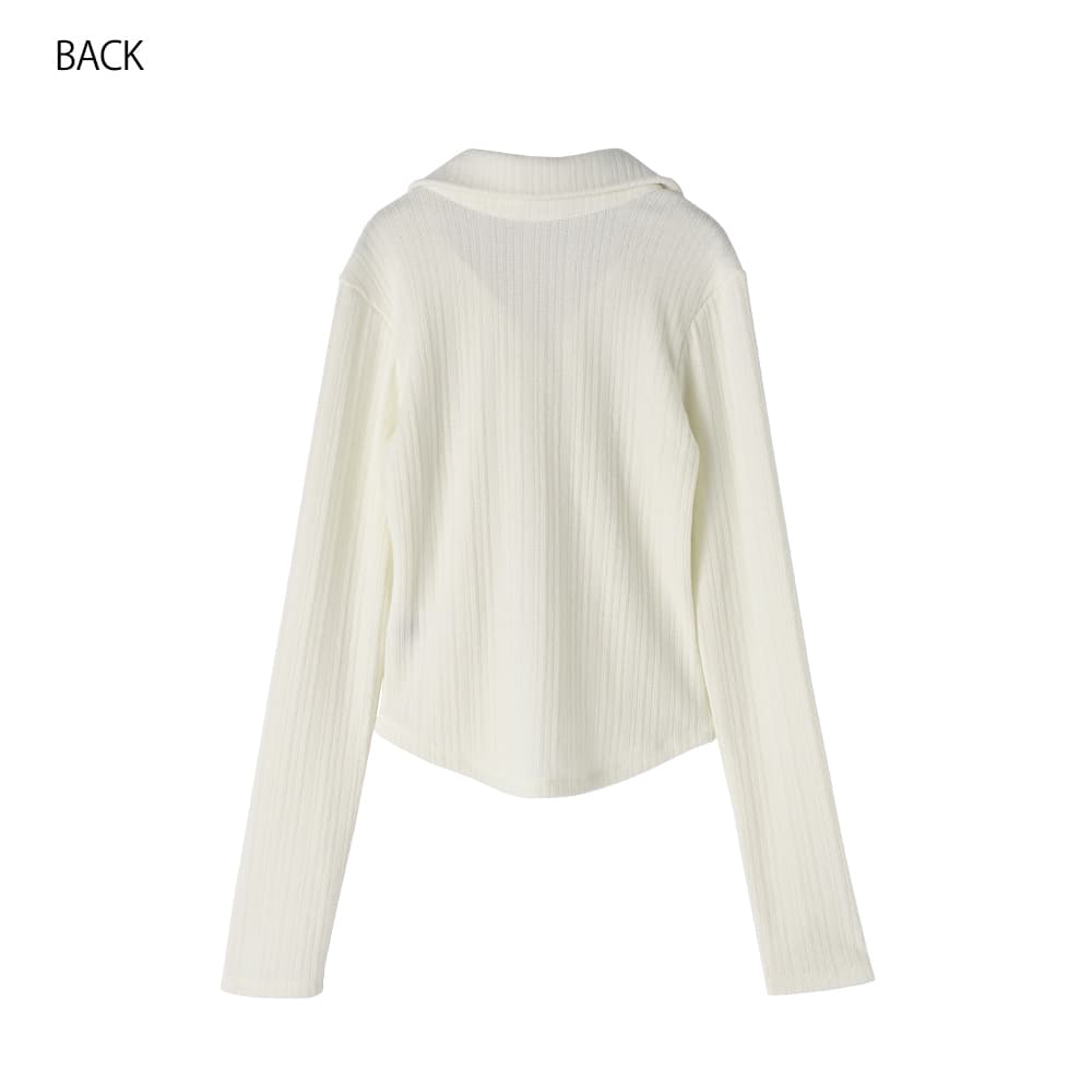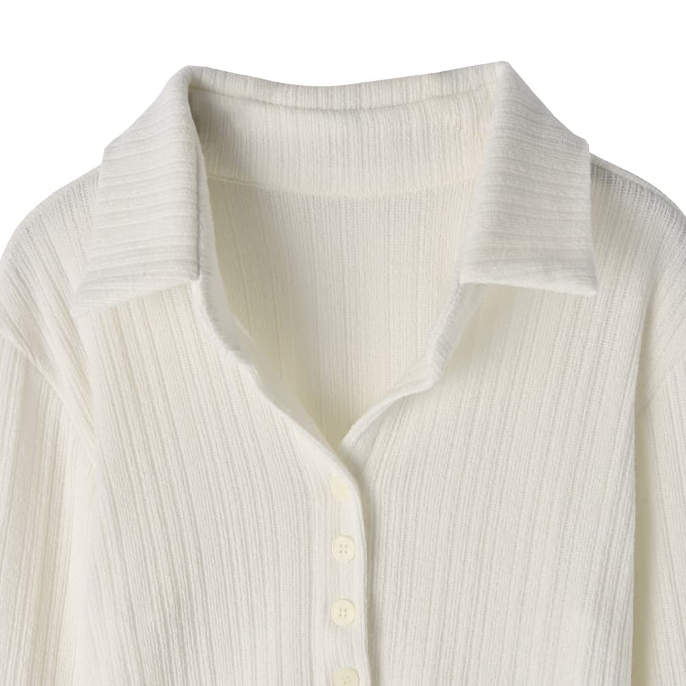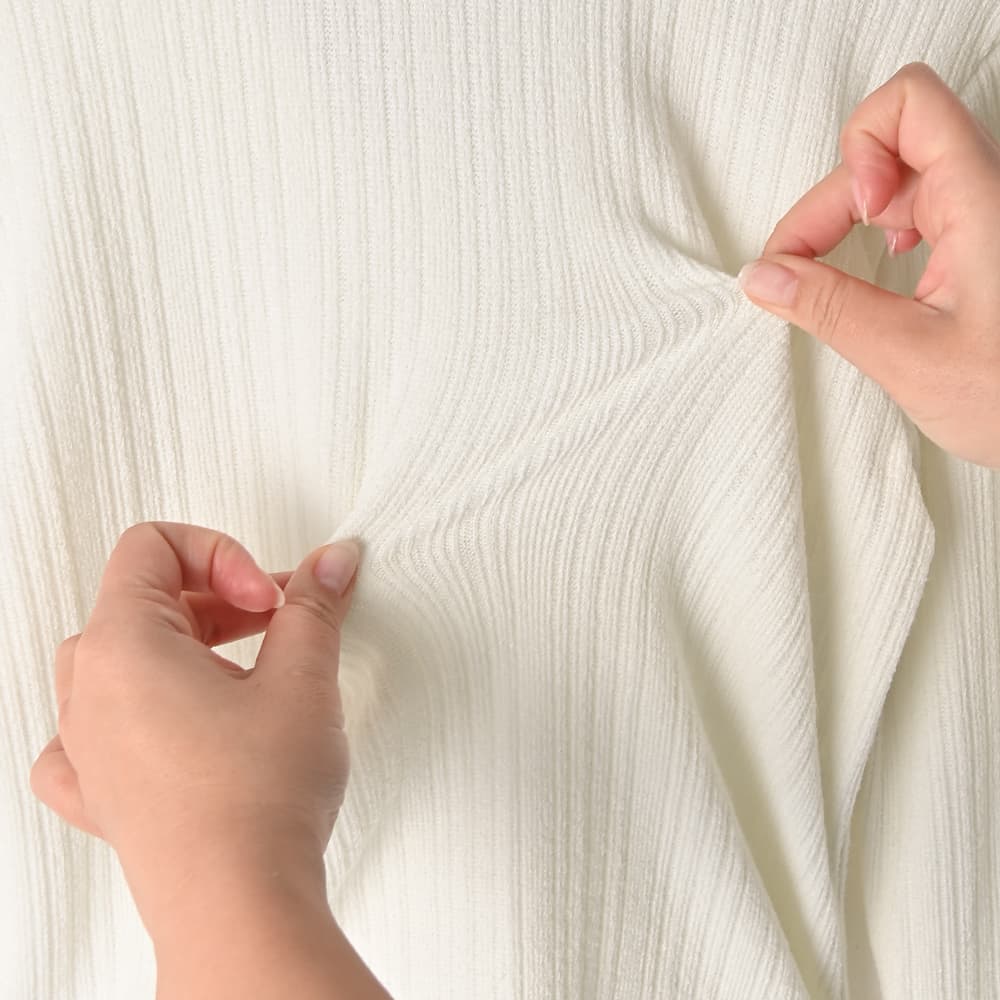 なんか「さりげなくオシャレ」で印象的Vネックに開くスキッパー型の襟デザイン今っぽい感じのニットソー生地トップス◆1/15インスタライブご紹介商品◆アーカイブのご視聴はこちらから→【2026/1/15ライブ】【このトップスの特徴】◆旬な雰囲気のデザイン◆どこかスタイリッシュな印象◆Vネック開きで顔周りスッキリ◆気持ちの良い肌触り◆ジャケットやサロペット等にも◎◆寒いうちから着れる春服◆季節感を限定しない素材感◆ボタンは閉じたままで着脱可能◆今っぽい前スリット風ディテール【このトップスの詳細】ジャストサイズでコンパクトなシルエットを作れるところがスタイリッシュな、襟付きデザインのニットソートップス。フィットはしますが生地に弾力感と伸縮性があり、ピチピチにはならないところが安心です。理想的なスッキリシルエットで、ワイドパンツなどの現在主流なボリュームボトムスと好相性。そしてジャケットやサロペットなどのインナーにも向くスッキリ感になっています。◆とにかく襟開きのフォルムがカッコ良く、シュッとして見えるキレイな形が秀逸。旬な襟付きアイテムの中でもとくにスッキリと見えるデザインです。◆第一ボタンは最初から無く、開いているのがデフォルトのスキッパータイプ。胸の谷間は見えない開き加減で安心感があり、お手持ちのネックレスも素敵に映えます。◆どこか(なめらかさのある)パイル地のような肌触りを持つ生地。伸縮のテンションが強めで着ていて安心の生地厚があり、柔らかくて気持ちの良いニットソーです。とくに季節を限定しない生地で、ご自分が暑いと感じるまでは着用することができます。◆旬なディテールであるボタンの数が多いデザイン。それが裾までではなく途中で終わっており、下の方がスリット状に開くのが今っぽくてカワイイ。さらにそのヌケ感で全身バランスもよく見えます。◆裾のラインは緩いラウンドライン。これがニットソーでは割と珍しく、裾をアウトで着るのにオシャレです(お好みで裾インも可能です)。◆表面はオシャレ感のある変則リブ編み(=凹凸の比率が単調ではない)。その凹凸の効果で肉感も自然にカバーします。【さらにプラス情報】◆暖かさ:やや薄手のニットと同じくらいです。すごく暖かいわけでもなければ、冬に着て寒々しい感じでもありません。◆サイズ感:その方の体型に合わせてナチュラルフィットする感じ(※ピチピチとは異なります)。Mサイズの普通体型までに対応しており、バストは下着を付けた状態でトップが93cmくらいまでならボタンの間が開くことはありませんが、余裕をもって90cmくらいまでの方にお薦めです。◆肌触り:チクチク感や硬さは無く、肌が弱めな人にも良さそうな素材です。◆着脱:ボタンは閉じたままで脱ぎ着ができます。前はフルオープンも可能な構造です。◆静電気:程度の差はその方の帯電体質具合や合わせアイテムなどによりますが、冬場は乾燥でどうしても…というところはありますので、もしも気になる場合はエレガードなどの静電気防止スプレー等でご対処ください。◆毛羽立ち:とくにできやすい生地ではありませんが、その方の動作グセやバッグとの摩擦具合、着用頻度やお洗濯方法により個人差がありますので、できることもあるかもしれません。できた場合は毛玉取りクリーナー等でお手入れをしてください。◆お手入れ情報:空気感を入れて割と緩めに編んだ組織なので、柔軟剤はきもち多めが良さそうです。もしも洗った後に組織が詰まったように感じる場合は、横方向に伸ばすようにスチーマーを当てると良いかと思います。【その他の仕様などの情報】◆着用時期:10-4月末頃が目安◆サイズ感:その方の体型に合わせて自然にフィット◆丈感:前はおヘソが隠れる丈感/背面は腰が半分隠れる程度の長さ◆シルエット:ストレート◆首元:襟付きVネック◆肩幅:普通 (とくに狭くも広くもない/伸びる素材で安心)◆アームホール:広め◆アームホール:普通(とくに狭くも広くもない一般的な開き加減)◆袖幅:その方の腕にゆるフィット◆袖丈:長袖(指が半分程度出る長さ)◆袖口:何もなし(自然にフィット系/伸縮性あり)◆袖のたくし上げ:可能◆厚み:普通◆柔らかさ:柔らかさの中にハリ感が共存◆肌触り:サラッとして心地良い/パイル地のような爽やかさ◆着用ジワ:できにくい◆毛羽立ち:できにくい◆伸縮性:あり◆光沢感:なし◆透け感:なし(アイボリーは少しあり)◆スリット:なし◆ボタン:生地と色を合わせたマット(ツヤ消し)タイプ◆手洗い:可能◆アイロン:不要◆スチーマー:使用OK【お色について】◆ブラック:定番的な通常のブラックです。◆アイボリー:真っ白ではなく、少し温かな色味感のあるニュアンスホワイト。クリーム色というほどの強いイエロー味や目立つ赤味はありません。◆ネイビー:割と青味がわかりやすく出ているタイプの(でも強くはない)深みがあるネイビー。黒っぽさや褪せた感じなどのクセは無い、キレイな発色のネ