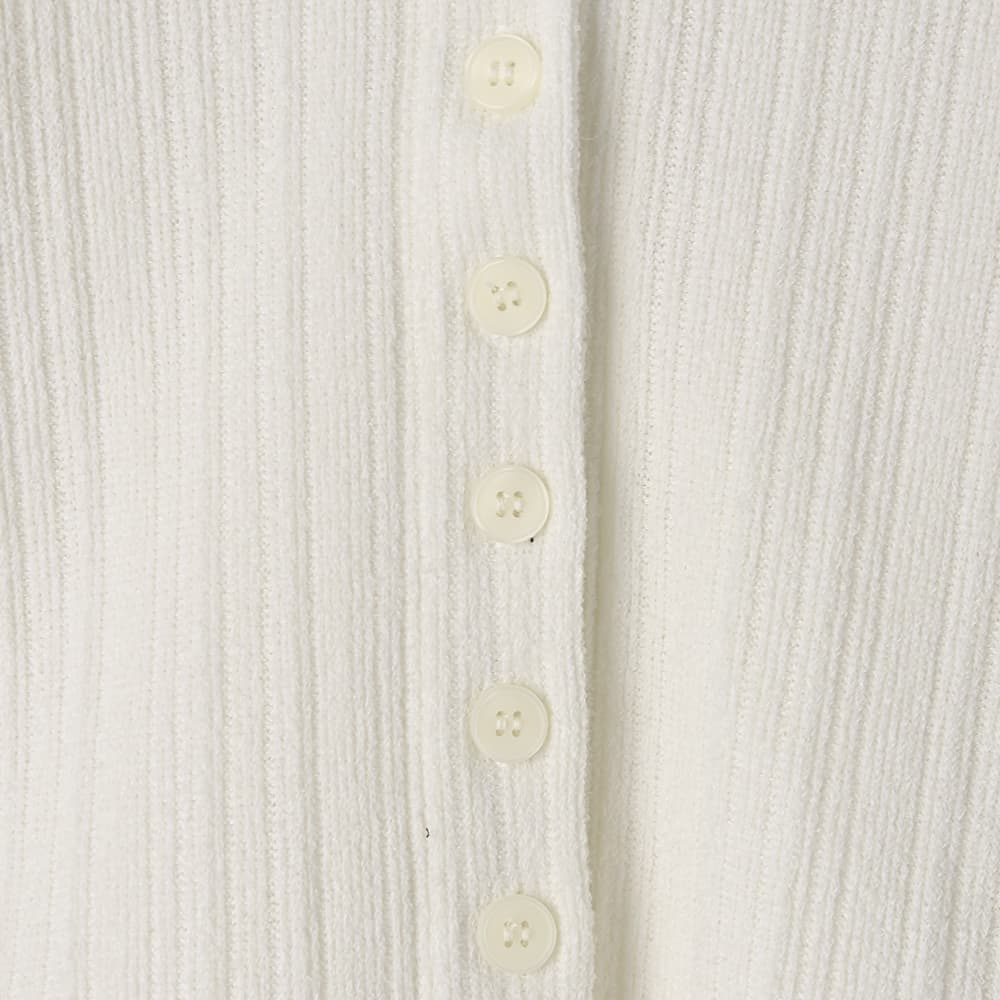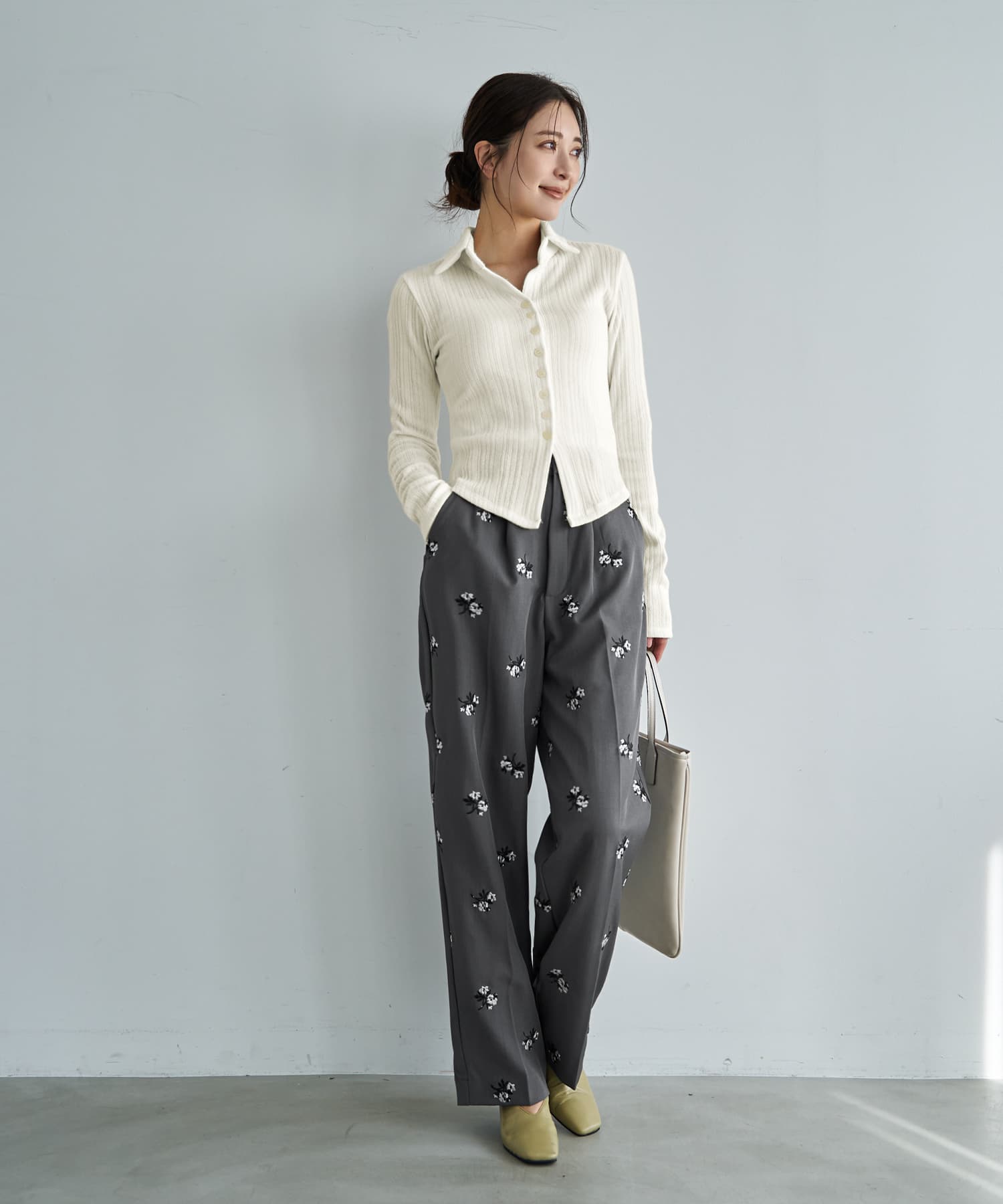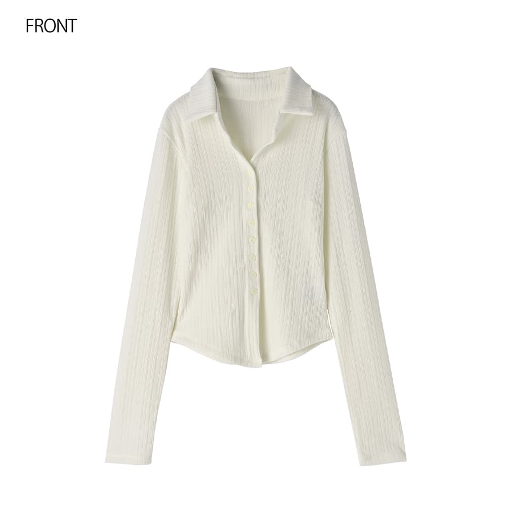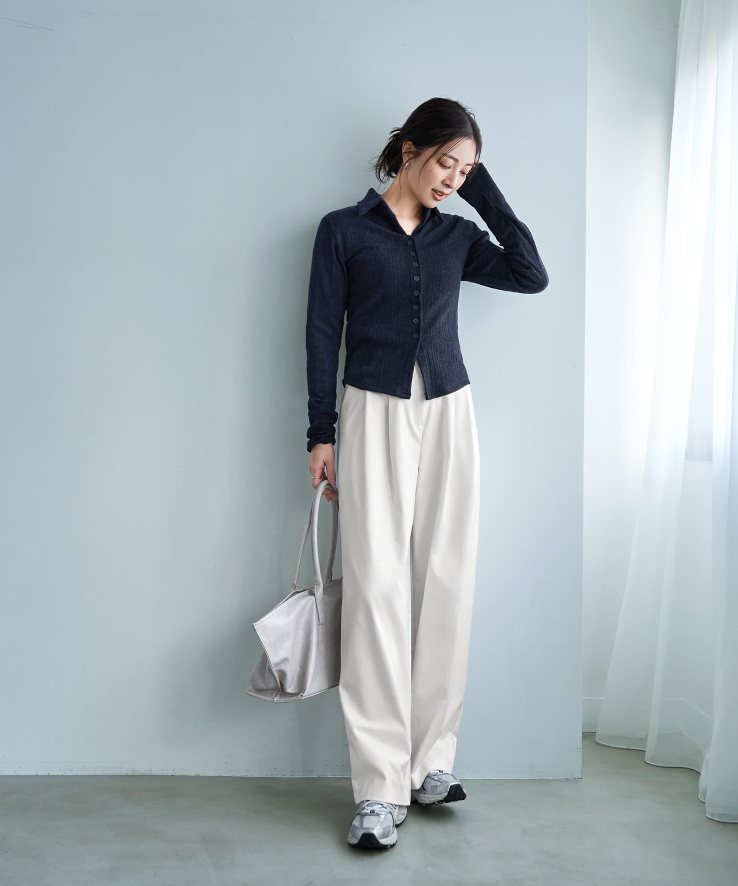 なんか「さりげなくオシャレ」で印象的Vネックに開くスキッパー型の襟デザイン今っぽい感じのニットソー生地トップス◆1/15インスタライブご紹介商品◆アーカイブのご視聴はこちらから→【2026/1/15ライブ】【このトップスの特徴】◆旬な雰囲気のデザイン◆どこかスタイリッシュな印象◆Vネック開きで顔周りスッキリ◆気持ちの良い肌触り◆ジャケットやサロペット等にも◎◆寒いうちから着れる春服◆季節感を限定しない素材感◆ボタンは閉じたままで着脱可能◆今っぽい前スリット風ディテール【このトップスの詳細】ジャストサイズでコンパクトなシルエットを作れるところがスタイリッシュな、襟付きデザインのニットソートップス。フィットはしますが生地に弾力感と伸縮性があり、ピチピチにはならないところが安心です。理想的なスッキリシルエットで、ワイドパンツなどの現在主流なボリュームボトムスと好相性。そしてジャケットやサロペットなどのインナーにも向くスッキリ感になっています。◆とにかく襟開きのフォルムがカッコ良く、シュッとして見えるキレイな形が秀逸。旬な襟付きアイテムの中でもとくにスッキリと見えるデザインです。◆第一ボタンは最初から無く、開いているのがデフォルトのスキッパータイプ。胸の谷間は見えない開き加減で安心感があり、お手持ちのネックレスも素敵に映えます。◆どこか(なめらかさのある)パイル地のような肌触りを持つ生地。伸縮のテンションが強めで着ていて安心の生地厚があり、柔らかくて気持ちの良いニットソーです。とくに季節を限定しない生地で、ご自分が暑いと感じるまでは着用することができます。◆旬なディテールであるボタンの数が多いデザイン。それが裾までではなく途中で終わっており、下の方がスリット状に開くのが今っぽくてカワイイ。さらにそのヌケ感で全身バランスもよく見えます。◆裾のラインは緩いラウンドライン。これがニットソーでは割と珍しく、裾をアウトで着るのにオシャレです(お好みで裾インも可能です)。◆表面はオシャレ感のある変則リブ編み(=凹凸の比率が単調ではない)。その凹凸の効果で肉感も自然にカバーします。【さらにプラス情報】◆暖かさ:やや薄手のニットと同じくらいです。すごく暖かいわけでもなければ、冬に着て寒々しい感じでもありません。◆サイズ感:その方の体型に合わせてナチュラルフィットする感じ(※ピチピチとは異なります)。Mサイズの普通体型までに対応しており、バストは下着を付けた状態でトップが93cmくらいまでならボタンの間が開くことはありませんが、余裕をもって90cmくらいまでの方にお薦めです。◆肌触り:チクチク感や硬さは無く、肌が弱めな人にも良さそうな素材です。◆着脱:ボタンは閉じたままで脱ぎ着ができます。前はフルオープンも可能な構造です。◆静電気:程度の差はその方の帯電体質具合や合わせアイテムなどによりますが、冬場は乾燥でどうしても…というところはありますので、もしも気になる場合はエレガードなどの静電気防止スプレー等でご対処ください。◆毛羽立ち:とくにできやすい生地ではありませんが、その方の動作グセやバッグとの摩擦具合、着用頻度やお洗濯方法により個人差がありますので、できることもあるかもしれません。できた場合は毛玉取りクリーナー等でお手入れをしてください。◆お手入れ情報:空気感を入れて割と緩めに編んだ組織なので、柔軟剤はきもち多めが良さそうです。もしも洗った後に組織が詰まったように感じる場合は、横方向に伸ばすようにスチーマーを当てると良いかと思います。【その他の仕様などの情報】◆着用時期:10-4月末頃が目安◆サイズ感:その方の体型に合わせて自然にフィット◆丈感:前はおヘソが隠れる丈感/背面は腰が半分隠れる程度の長さ◆シルエット:ストレート◆首元:襟付きVネック◆肩幅:普通 (とくに狭くも広くもない/伸びる素材で安心)◆アームホール:広め◆アームホール:普通(とくに狭くも広くもない一般的な開き加減)◆袖幅:その方の腕にゆるフィット◆袖丈:長袖(指が半分程度出る長さ)◆袖口:何もなし(自然にフィット系/伸縮性あり)◆袖のたくし上げ:可能◆厚み:普通◆柔らかさ:柔らかさの中にハリ感が共存◆肌触り:サラッとして心地良い/パイル地のような爽やかさ◆着用ジワ:できにくい◆毛羽立ち:できにくい◆伸縮性:あり◆光沢感:なし◆透け感:なし(アイボリーは少しあり)◆スリット:なし◆ボタン:生地と色を合わせたマット(ツヤ消し)タイプ◆手洗い:可能◆アイロン:不要◆スチーマー:使用OK【お色について】◆ブラック:定番的な通常のブラックです。◆アイボリー:真っ白ではなく、少し温かな色味感のあるニュアンスホワイト。クリーム色というほどの強いイエロー味や目立つ赤味はありません。◆ネイビー:割と青味がわかりやすく出ているタイプの(でも強くはない)深みがあるネイビー。黒っぽさや褪せた感じなどのクセは無い、キレイな発色のネ
