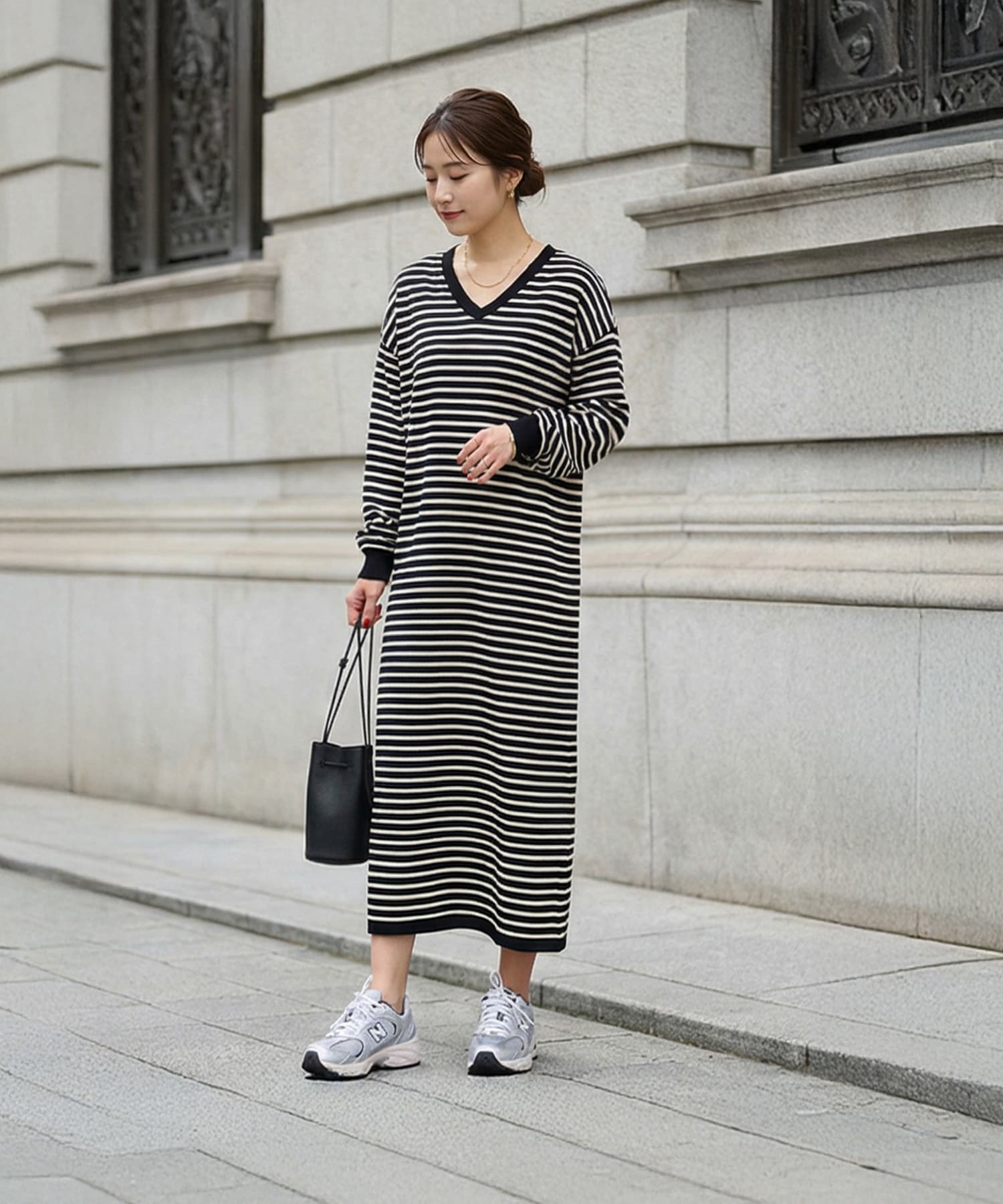 ◆雰囲気:姉妹商品の『襟付きトリミングボーダーワンピース/商品番号236153』と比べると、こちらの方が若干カジュアル寄りなデザインになります。ただし品の良さと大人っぽさはあり、カジュアル過ぎる感じになることはありません。