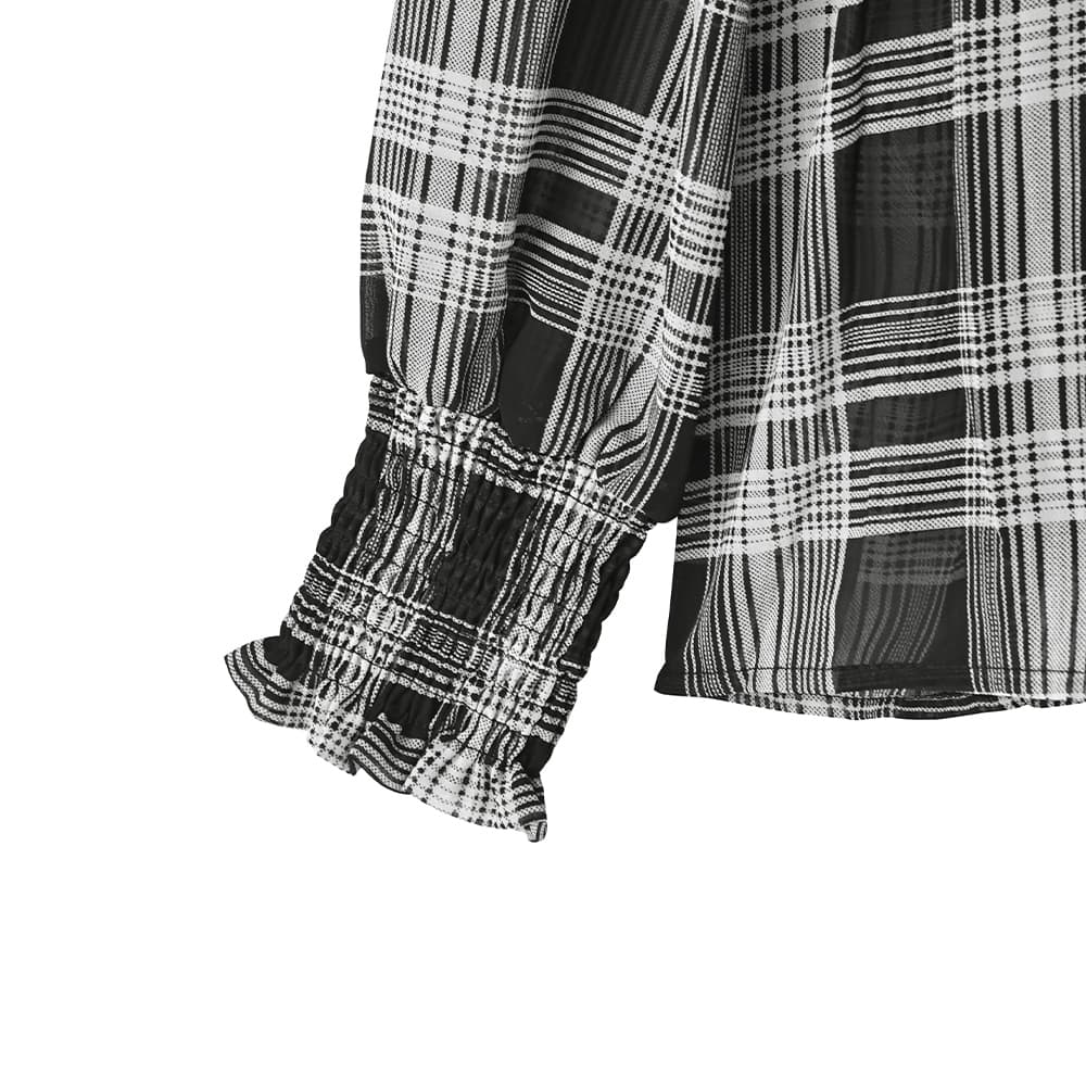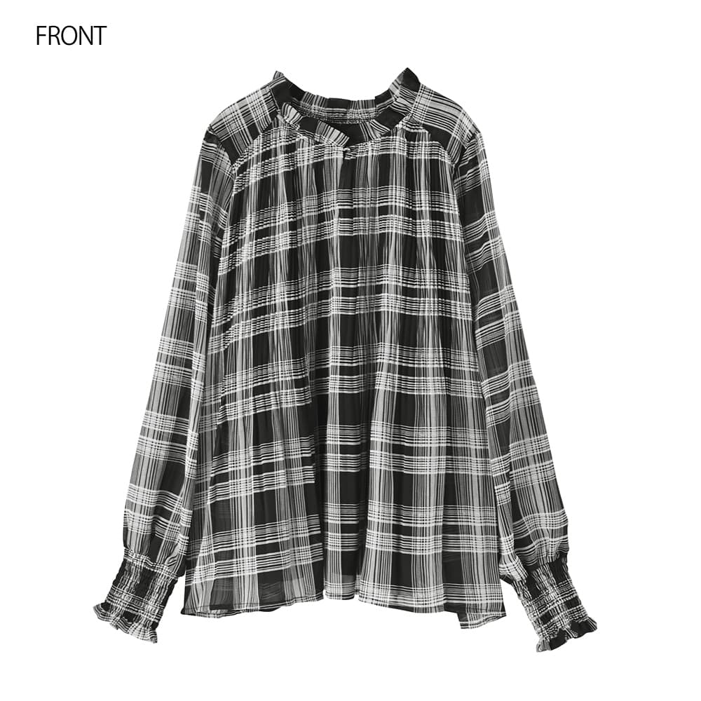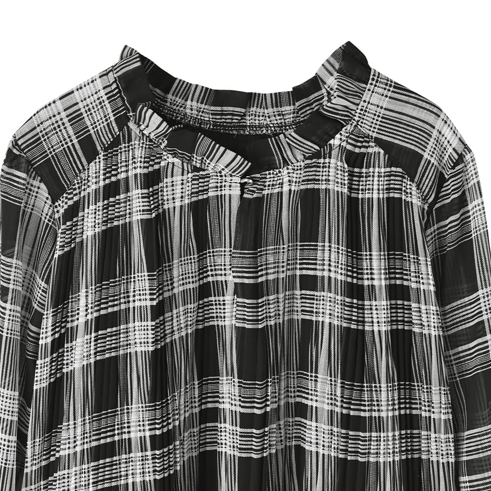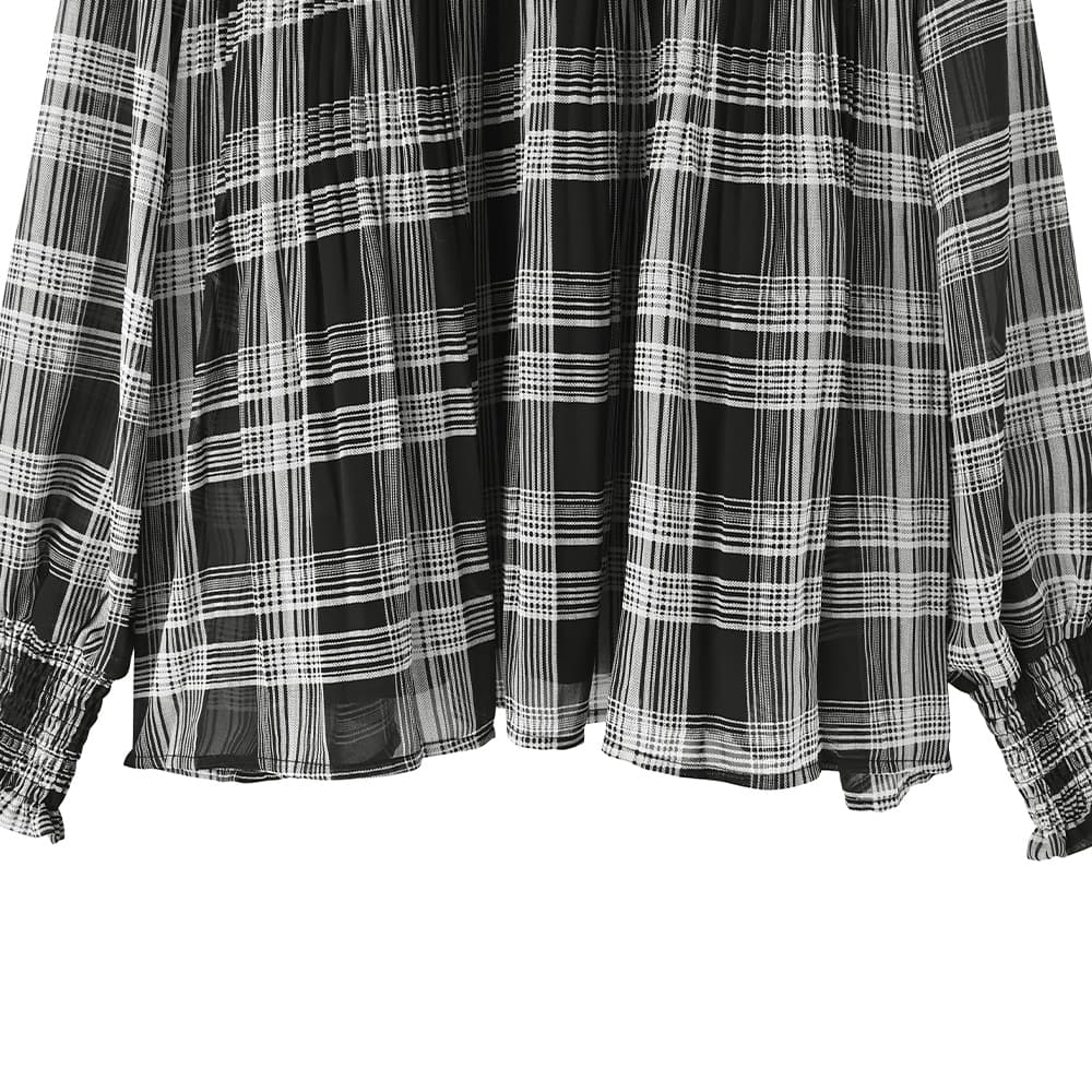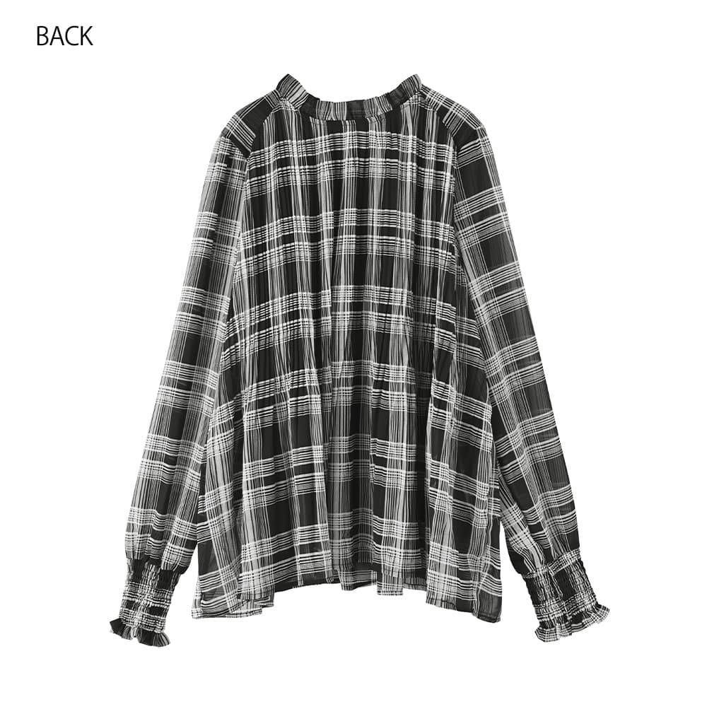コレなら挑戦してみたい、そんなお声が多数辛口なモノトーンで甘さを回避が大人に良い、軽やかな生地のタータンチェック柄ブラウス◆3/26インスタライブご紹介商品◆アーカイブのご視聴はこちらから→【2026/3/26ライブ】【この商品の特徴】◆甘さやモッサリ感の出ない白黒チェック柄◆大人っぽい落ち着きがあるタイプ◆ディテールが細かい凝った構造◆派手にならない華やかさがある◆薄く軽やかで涼しいシフォン生地◆シアー生地ながらも透け感が気にならない◆裾インでも裾アウトでも素敵◆ジャケットやカーデなどの羽織りものも合う◆ジャンスカやサロペット合わせも◎◆アイロン要らずでお手入れがラク◆活用できるシーズンが長い◆とくに流行りとは無関係なデザイン◆オシャレに体型をカバーできる【この商品の詳細】チェック柄が苦手でもトライしたくなるような、普通のチェックとは明らかに異なる雰囲気を持つ洗練された柄感のブラウス。華はありつつ落ち着きもあり、大人の可愛さはあるけど甘くはならない、という絶妙なさじ加減。まずはお手持ちの黒ボトムスに合わせるだけで素敵なコーデができるので、お気軽に挑戦してみていただければと思います。◆生地:薄手のポリエステルシフォン。透け感はありますが、黒の面積が多めの柄なのでほとんど気にならない気楽な一枚です。インナーは何色でも良いですが、黒が一番良いと思います。◆涼しさ:涼しさのある着心地です。汗をかいてペタペタとはり付くシフォンではなく、サラッとしていて肌離れが良いのも優秀。とくに袖をたくし上げればさらに涼しく着ることができ、気温が高い日にも適しています。◆裏地:身頃のみ裏地がありますが、この裏地が特殊でまた優秀。通常のペタッとしたポリエステル裏地ではなく、非常にキメが細かいメッシュ状のシフォンで、サラッとしていて通気性が良く快適です。この裏生地もシースルー素材ですが、色が黒なので透け感低減に大いに貢献。これがあることで身体へのはり付きを防ぎ、薄手の生地でも肉感が響く不安を回避できています。【デザインについて】通常であれば『それ苦手…』となる要素もあるかもしれませんが、とにかく生地が薄くエアリーなのでディテールの存在感が無く、全体に溶け込んでいて欠点を助長しません。例えば肩線にはギャザーがあり、通常であれば肩幅を強調して苦手、となる場合もこれは別。へにゃん、としていてまったくボリュームが出ないため、かなりの高確率で問題はないと思います。◆首元:ディテールとしてはスタンドネック風ですが高さが無く、着るとクルーネックになる特殊な形状。深く開けたクルーネックラインにスタンドネック風の飾りを付けた感じなので、結果として浅いクルーネックになり、スタンドネックが苦手な方でも問題がありません。スタンド部分は生地をタック状に折りたたみ、線を曖昧にしている点もポイント。立ち襟が顔に合わない方も、これは『うやむや』になるため大丈夫な場合が多いと思います。◆肩:肩線を狭めにとり、肩ギャザーの中に肩が納まる肩幅フリー構造。生地がへにゃん、としているため通常のパフスリーブのようなボリュームは出ず、言われなければ気付かない感じの自然な肩形状になっています。そのため見た目の甘さも無く、大人の丸い肩をカバーしてくれる良さだけが残ります。◆身頃:柄があるのでわかりづらいのですが、実は身頃全体が細かなプリーツ形状。これにより生地が身体にはり付かず、体型カバー効果と(生地の薄さが気にならない)安心の着用感を叶えます。そして柄感に奥行きが出て、『なんかオシャレ…』という印象を与えるのもそのためです。◆袖口:袖口はシャーリングゴム構造。ただのゴム袖に比べて1箇所に負担がかからず、窮屈さの無い『ゆるフィット』な袖口を作ります。袖を簡単にたくし上げできて、しっかりと位置固定できるのも優秀です。【さらにプラス情報】◆季節感:色味はシックでも軽やかな質感で、春先から初夏にかけても重たく見えない春夏向けの素材。もちろん秋にも良いですし、冬はジャケットやカーディガンと重ねて着用できます(=季節感フリーです)。◆ボトムス:スカートでもパンツでもOK。裾はインでもアウトでも可愛く、スカートの場合はインした方がバランスの良いときもあると思います。薄手なのでジャンパースカートやサロペットのインナーにも向きます。◆ボトムスの色:合わせる色はあまり問わないので、ひとまずお手持ちのものにひと通り合わせてみてください。その中で質感や形、その方の外見という複数要素に応じて合う・合わない等が出てきますので、鏡を見てご判断するのが良いと思います。まずは黒を合わせておけば間違いはないですし、合わせやすくて着回しはききます。【その他の仕様などの情報】◆着用時期:夏以外(冬は重ね着前提)◆サイズ感:ゆっやりめのサイズ感(Lサイズ体型にも対応)◆丈感:前は脚の付け根が隠