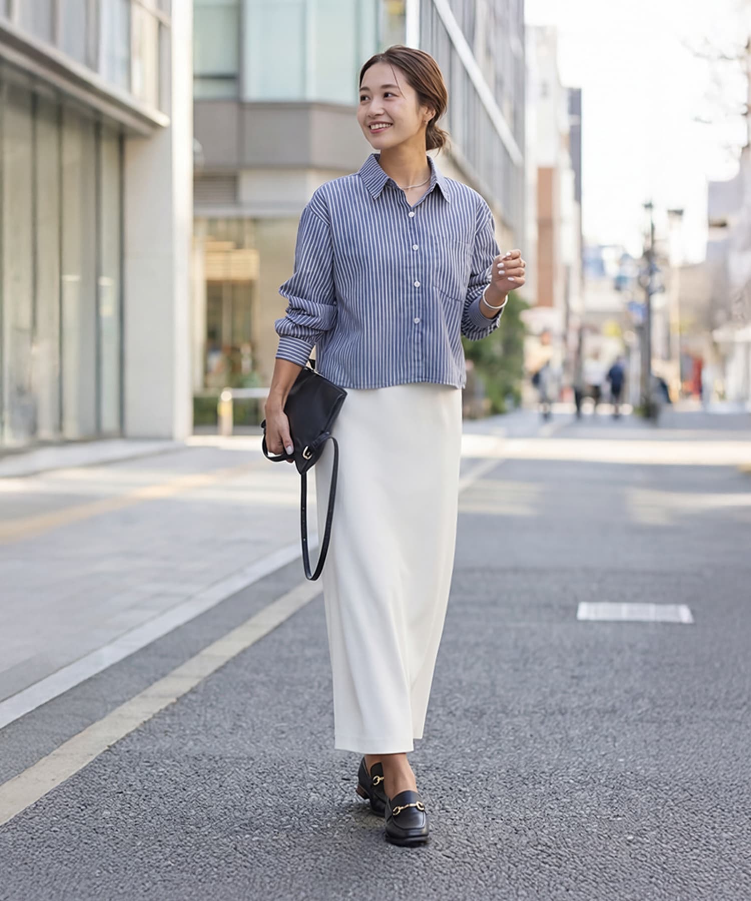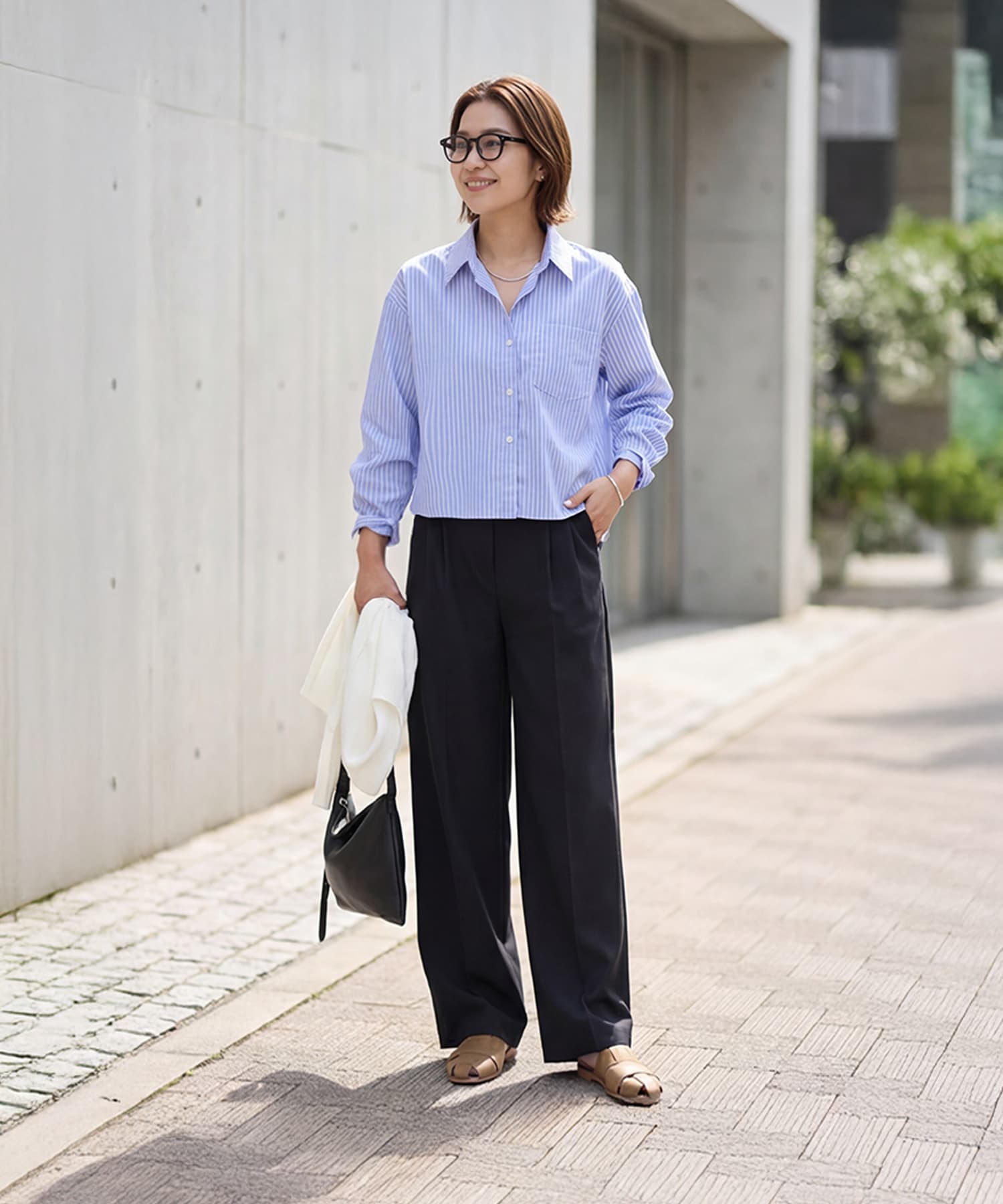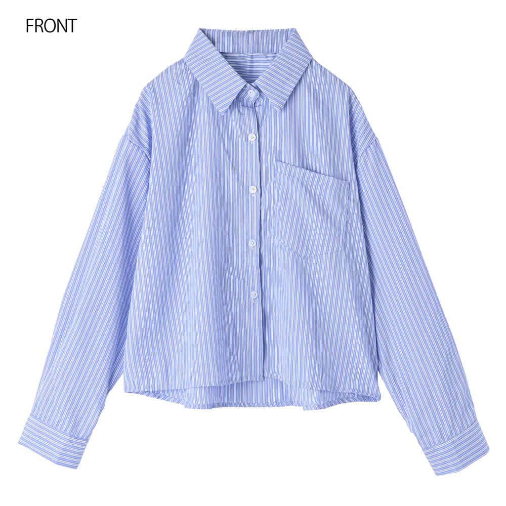 今どきボトムスのコーデがラクになる、最旬バランスの丈短ストライプシャツ◆3/26インスタライブご紹介商品◆アーカイブのご視聴はこちらから→【2026/3/26ライブ】【この商品の特徴】トレンドのショート丈で今どきボトムスとの相性が良い、軽やかな質感のストライプ柄シャツ。単純な単調ストライプではなく、太い線と細い線を細かく配置した柄感がオシャレな印象です。裾を入れるか・出すかで悩まずに、即バランスがキマるのも便利。生地は薄手でスッキリとしているため、初夏まで爽やかに使うことができます。◆生地:シャツ生地の中では薄手で涼しさのあるタイプ/ハリ感はあるため形がキレイに出る/アイロンは不要、スチーマーや霧吹きでOK◆季節感:見た目の季節感は問わない/薄手なので着用体感は春夏向き/冬場はニットなどの下に着る感じの重ね着メイン/夏場の長袖としても向く◆ボトムス:スカートでもパンツでもOK/ボリュームのあるボトムスとも合う◆着こなし:前を開けてノースリーブやワンピース、サロペットやジャンスカの羽織りにすることもできる/首元は開けても閉めてもどちらでもカワイイ◆重ね着:ジャケットやベスト、ジレ合わせなどもOK【ほか商品との比較】比較商品:【selection】ストライプ柄立体タックショートシャツ(商品番号236098)◆やはり質感として価格の差は出ており、あちらはひと目で『高いシャツ生地』だとわかります。◆デザイン性の高さと構造の複雑さが異なります。こちらは『ベーシックな形のシャツを短くしたもの』ですが、あちらは『デザイン性のある立体感シャツ』になります。◆共通項はシャツ生地としては薄手でハリ感があることと、丈が短いことです。◆こちらは前を開けて羽織りシャツとしても使用することができます。◆何かの下に着る際(重ね着をする場合)の汎用性が高いのはこちらです。◆ストライプの柄感も異なり、こちらは2色編成ですが、あちらは3色の糸を使用していてより珍しさがあります。◆凝っていてデザイン性の高いものがお好きであれば→あちら。シンプルなものがお好きであれば→こちら。がお薦めです。服としての完成度やクラス感はやはりあちらの方が上にはなりますので、お好みでお選びください。【その他の仕様などの情報】◆着用時期:夏以外(冬場は重ね着で使用可)◆サイズ感:ゆったりめのサイズ感(Lサイズ体型にも対応)◆丈感:前はおヘソが隠れる丈感/背面は腰が隠れる長さ◆シルエット:ストレート◆首元:シャツ襟◆肩幅:広め(ドロップショルダー気味)◆アームホール:普通(とくに狭くも広くもない一般的な開き加減)◆袖幅:普通◆袖丈:長袖(手の甲にかかる長さ)◆袖口:カフス+ボタン1個あり◆袖のたくし上げ:手首と肘の中間まで可能◆厚み:シャツ生地の中では薄手◆柔らかさ:ハリ感と柔らかさが共存◆肌触り:サラサラッとして滑らかな感じ◆着用ジワ:できにくい◆毛羽立ち:できない◆伸縮性:なし◆光沢感:なし◆透け感:気にならない◆スリット:なし◆着脱:フロントボタン開き◆ボタン:白蝶貝パール調光沢ボタン(色:ホワイト)◆ポケット:左胸にあり◆手洗い:可能◆アイロン:不要◆スチーマー:使用OK【お色について】※白線部分は普通の一般的なホワイトで両色ともに共通です。◆ネイビー:インディゴデニムのような感じの、ダークブルー寄りな明るめのネイビーです。◆ライラックブルー:明るく薄いブルーにごく僅かな薄紫の色素を入れて、ブライト感を出したニュアンスブルーです。普通の薄いブルーよりも華やかな印象になります。※見た目にパープル感はありません。【SNS用ハッシュタグ】#236170サラサラ短めストライプ柄シャツ(このハッシュタグでInstagramなどSNS内で検索をしますと、こちらをお持ちのお客様のご投稿があれば、簡単に見つけてご覧いただくことができます)