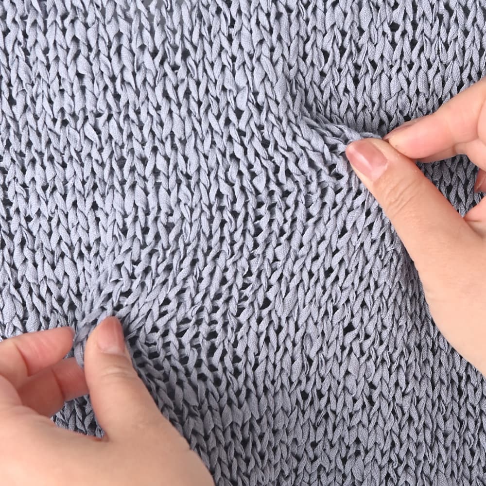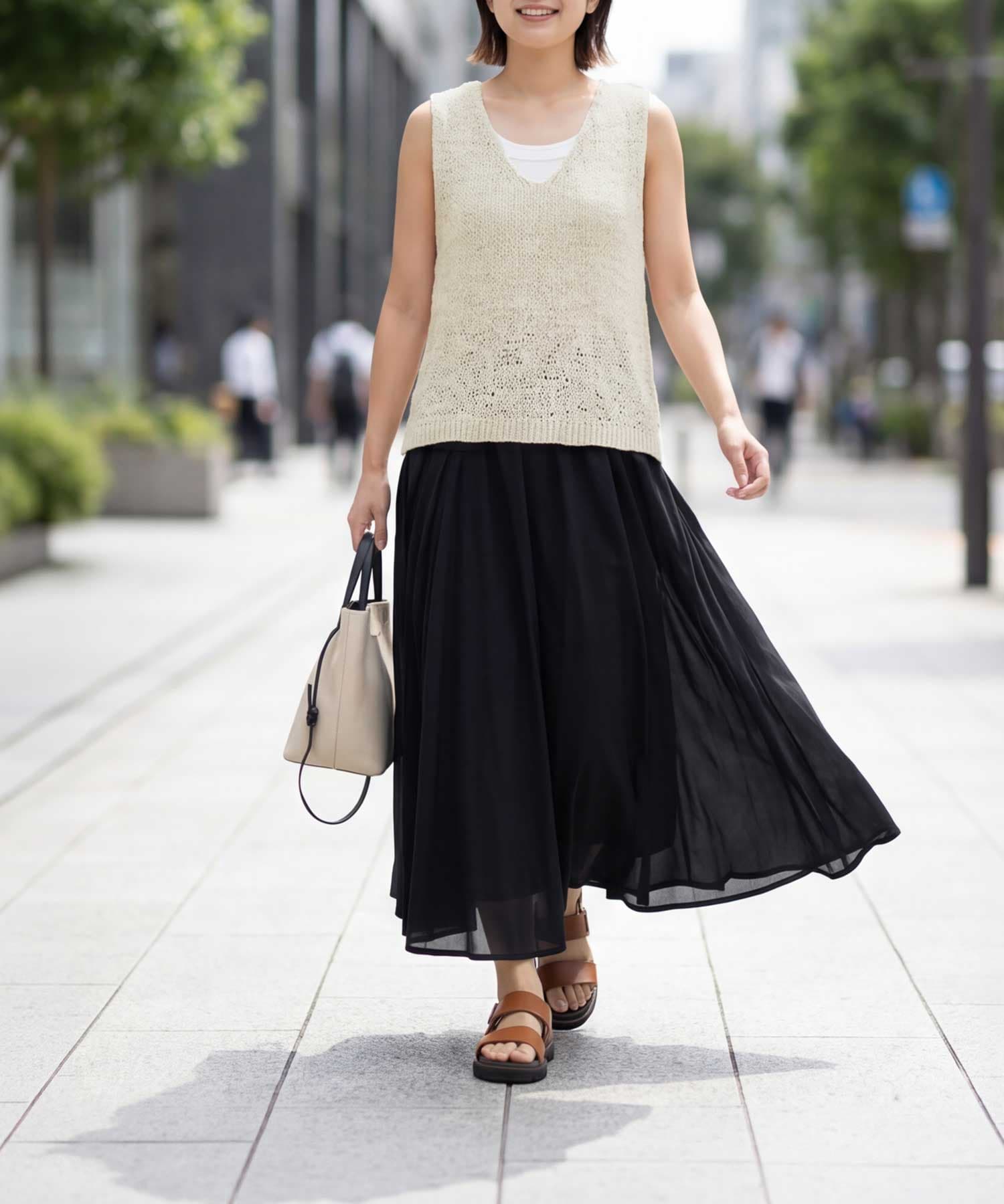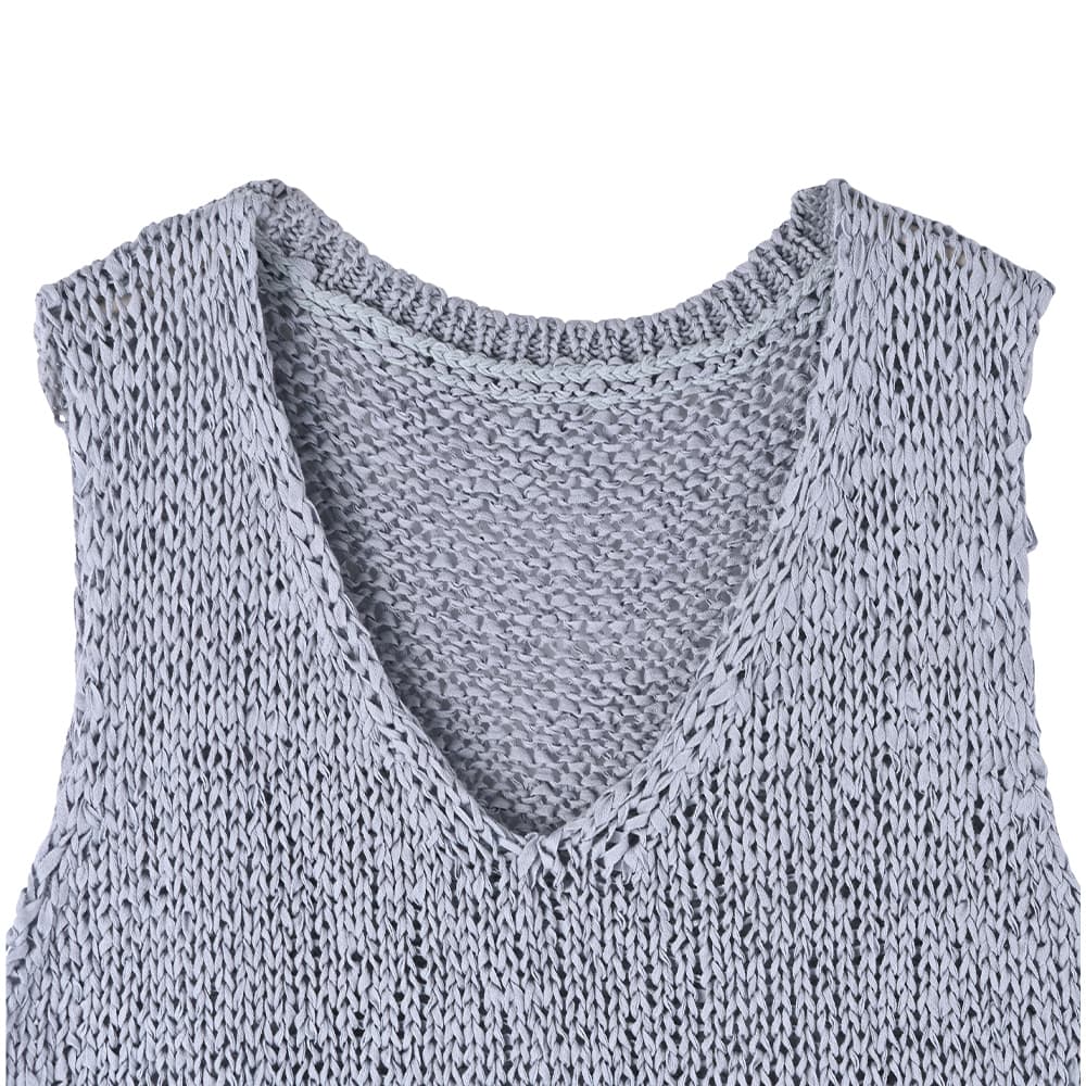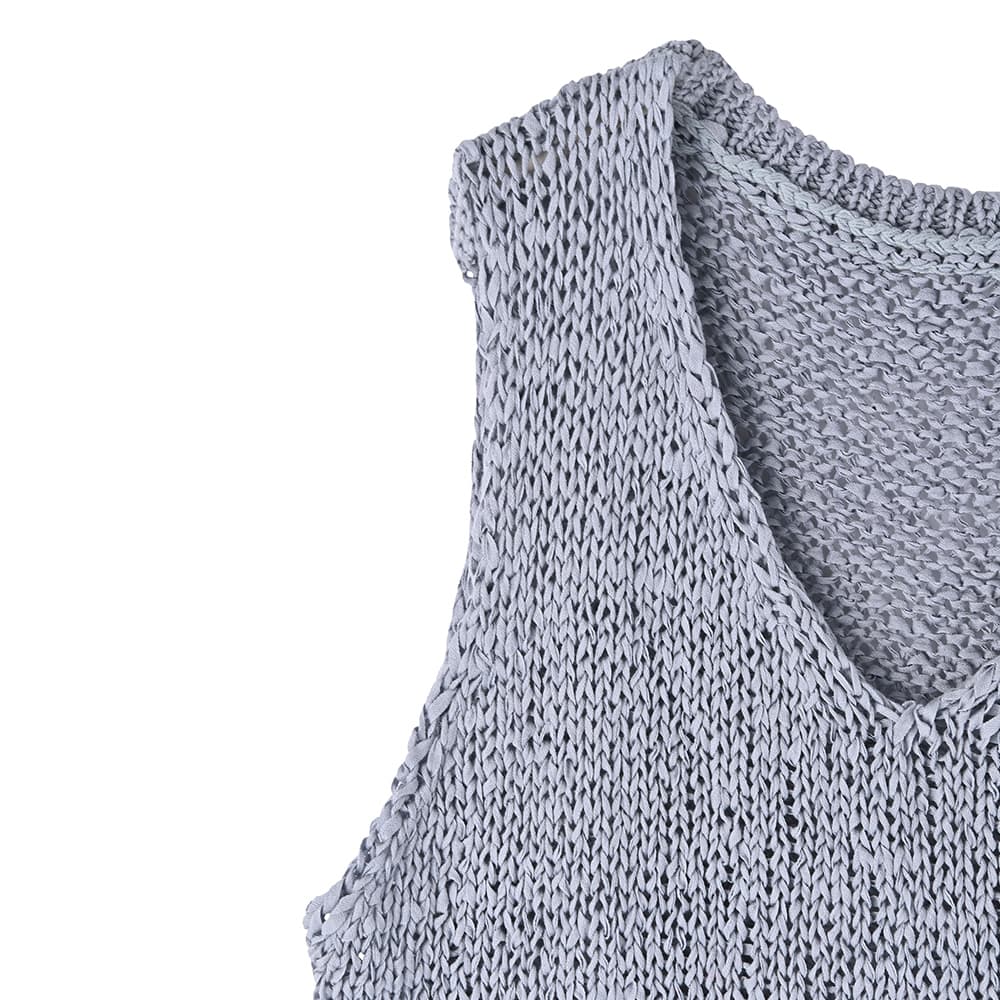 襟ぐりの形が選べる2way仕様で便利糸というより細いリボンを編んだような、ざっくりとした編み目がカワイイ夏ベスト◆4/23インスタライブご紹介商品◆【selectionシリーズが始動】国内のメジャーな大人ブランドやショップのアイテム制作を手掛けている、老舗メーカーさんが企画生産するアイテムをSTYLE DELI視点でセレクトしたnewシリーズ。ネットショップならではの買いやすい価格帯とは少し異なりますが、優れた品質で大人に相応しい雰囲気を持つアイテムを好む方に向けてご用意したシリーズです。その中でも、店頭で試着をしなくても失敗しにくく、着やすくてお薦めできるもの・高額過ぎないものを厳選。そうすることでオシャレの幅が広がって良いかなと考えましたので、STYLE DELIのアイテムとMIXして、大人ならではのオシャレをお楽しみいただければと思います。※こちらはセレクト商品になりますので、STYLE DELIのネームタグは付いておりません。また、他店や他ブランドでも取り扱いがあることがございます。【このベストの特徴】リボンのような平紐状の素材を編み上げた、質感がオシャレなサマーベスト。片面はVネック、もう片面はラウンドネックになっており、好きな方を前にして着れる2WAY仕様になっています。こういった見た目の素材は肌触りに硬さがあるのが普通ですが、これは柔らかで『しんなり』としていて着やすいのが特徴。緩い編み目の間に隙間があるため通気性が良く、サラッとした肌触りで涼しく着用することができます。 Vネックは普通に着ると胸の谷間がギリギリ見えない程度。下にインナーは必要ですが、これをトップスのように着て、上からジャケットやカーディガンを羽織ったりすることも可能です。【さらにプラス情報】◆インナー:中に着るものはノースリーブでも半袖や5分袖でもOK。ネックラインの形も選べるため、インナーのネックデザインに合わせて相性が良い方を選択することができます。◆合わせアイテム:スカートでもパンツでもOK。ワンピースの上に重ねるのもカワイイです。◆厚み:糸がリボン状で立体感があるため、形状としての厚みはそれなりにアリ。ただし着用感は(たくさんの隙間があるため)薄手なニットと同等の涼しさで、クッタリとしているので身体が厚く見えることはありません。【その他の仕様などの情報】◆着用時期:3-10月末頃が目安◆サイズ感:ゆとりのあるサイズ感(Lサイズ体型にも対応)◆丈感:前はおヘソが隠れる丈感/背面は腰が隠れる長さ◆シルエット:ストレート◆首元:Vネック/ラウンドネック◆肩幅:問わないタイプ◆アームホール:広め◆厚み:普通(着用温度感は薄手の衣類)◆柔らかさ:柔らかさの中にハリ感が共存◆肌触り:サラッとして肌離れが良い感じ◆着用ジワ:できない◆毛羽立ち:できない◆伸縮性:あり◆光沢感:なし◆透け感:少しあり◆ボタンやファスナー:なし(かぶり着タイプ)◆裏地:なし◆手洗い:可能◆アイロン:不要◆スチーマー:使用OK【お色について】◆ナチュラル:少しクリーム色がかった、ホワイト系ニュアンスカラー。明るく肌馴染みが良く、合わせやすいお色です。◆ニュアンスブルー:明るいブルーの彩度を落とし、微量のグレーとラベンダー色素を『味付け程度に』加えたような、雰囲気のある明るめなお色です。【SNS用ハッシュタグ】#236223コットンペーパーヤーンvネックベスト(このハッシュタグでInstagramなどSNS内で検索をしますと、こちらをお持ちのお客様のご投稿があれば、簡単に見つけてご覧いただくことができます)
