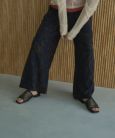線で作られたパターンの生地を使ったパンツ。ネイビーとブラウンの落ち着いたカラーの組み合わせ。柄アイテムなのに悪目立ちせずシンプルなトップスと合わせるだけでスタイリングが簡単です。すっきりとしたIラインのシルエットで足のラインをカバーしてくれます。ウエストはゴムが入っていてとても楽。春~晩秋まで着ていただけるのでロングシーズンお使い頂けます。※こちらのアイテムは数量限定販売ですので売り切れ次第販売終了となります。[着用時期]4~11月(約15℃以上)[透け感]なし[生地の厚み]かなり薄手[ストレッチ]なし※ウエストゴム[生地のやわらかさ]やわらかい[生地の特徴]マットなシフォン系の素材[落ち感]あり[着用ジワ]なりにくい[身長]全ての方に(身長によって着丈が変わります)※感じ方には個人差がございますので気になる部分がありましたらお気軽にお問い合わせください