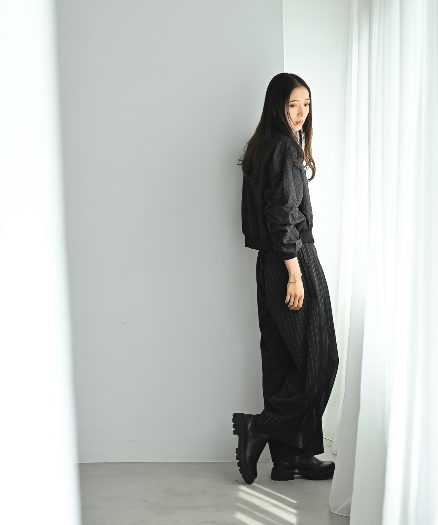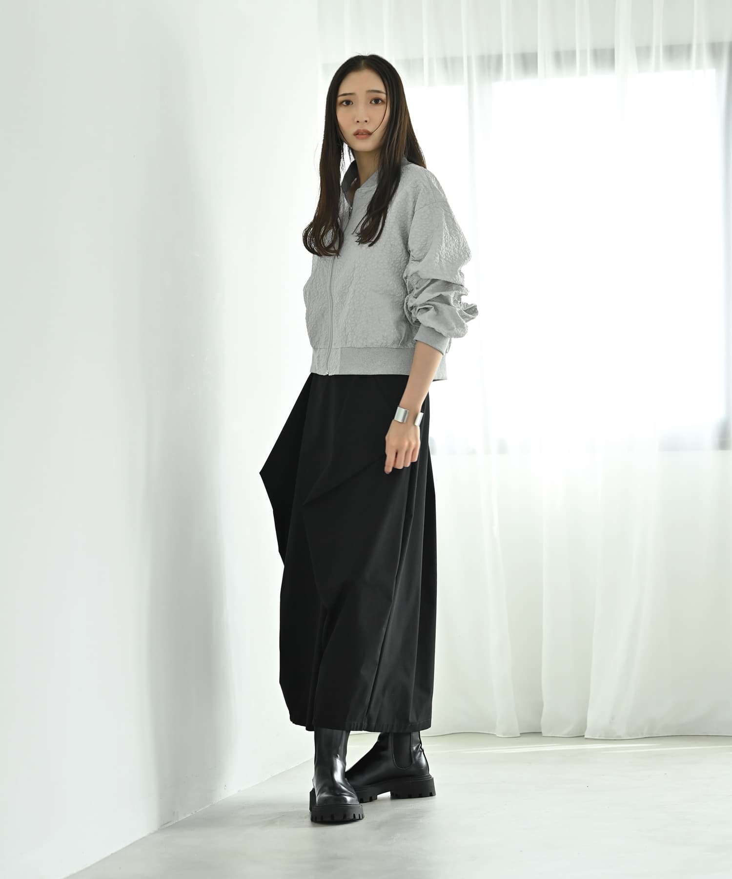 =シャーリングデザインが映える、軽やかブルゾン= 立体的なシャーリングとエンボス加工が特徴のジップブルゾン。光の加減でさりげなく表情が変わる素材感が、シンプルながらも奥行きのあるスタイルを演出します。ボリュームを持たせた袖とコンパクトな着丈のバランスが絶妙で、羽織るだけでスタイルアップ。軽くて柔らかな素材が肩まわりを包み込み、高身長・Lサイズの方でも窮屈感なく着用いただけます。ほんのりモードな雰囲気をまといながらも、日常に馴染む上品な印象。カジュアルにもきれいめにもマッチする万能アウターです。[こんな方におすすめ] ・ブルゾンでも女性らしい印象で着たい方・羽織るだけで雰囲気を出したい方・高身長・肩まわりしっかりめでもすっきり着たい方・軽くてシワになりにくいアウターを探している方・シンプルすぎず、さりげなく個性を取り入れたい方[スタイリング提案] ・タイトスカートやワイドパンツに合わせて都会的に・ワンピースに羽織って、抜け感をプラス・オーバーサイズの下に合わせて、秋~春までロングシーズン活躍[着用時期]夏以外[透け感]なし[生地の厚み]中肉[伸縮性]なし(袖口・裾リブ部分あり)[光沢感]わずかにあり(表面のエンボスによる)[裏地]なし[柔らかさ]軽くソフトな風合い[生地の特徴]凹凸感のあるシャーリングエンボス素材[着用ジワ]ほとんど気にならない[ポケット]あり(両サイド)[お色について] ブラック:シックでモードな印象。凹凸の陰影が映え、スタイル全体を引き締めて見せます。グレー:やわらかく上品なトーン。光の加減で立体感が際立ち、軽やかに着こなせるカラーです。[お知らせ事項]こちらの商品は、コストパフォーマンスを重視し海外縫製を採用しております。そのため、縫い目のわずかな粗さや糸の端処理などが見られる場合がございますが、着用や品質に問題はございません。実際にお召しいただくと、シルエットの美しさと仕立ての良さを実感いただけます。