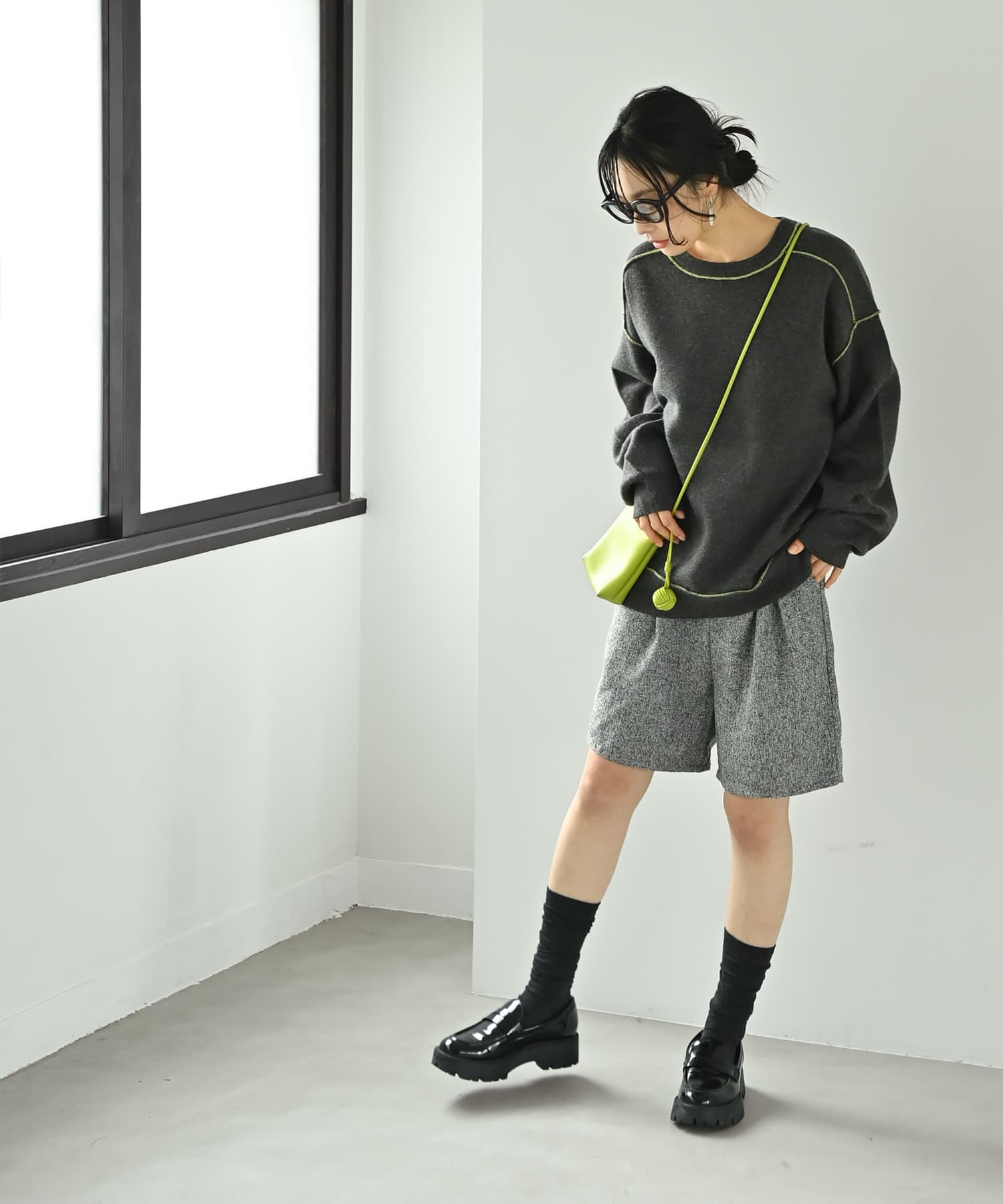 =クラシックをモードに昇華する、ツイードハーフパンツ=上質なツイード素材で仕立てた、大人のためのハーフパンツ。クラシカルな印象のツイードにボックスタックを施し、上品さと立体感を両立しました。ひざ丈に近い着丈で脚をすっきり見せつつ、程よく余裕のあるワイドシルエットが脚線を拾わない安心設計です。ウエストは70~78cm程度のゴム仕様でフィット感を調整でき、Lサイズ以上の方にも快適な穿き心地。股上を深めに設定しているため、トップスをインしても腰まわりがもたつかず、スタイルアップが叶います。裏地を省いた軽やかな仕様ながら、ツイード特有の程よい厚みとハリ感があり、秋冬らしい季節感を演出します。[こんな方におすすめ]・ハーフパンツを大人っぽく着こなしたい方・脚のラインを拾わずきれいに見せたい方・ベーシックカラーで長く使えるアイテムをお探しの方・高身長でも短すぎず穿ける丈感をお求めの方【セット販売はこちら】850181[SET] 【BLK001】ツイードダブルジャケット×ハーフパンツ[スタイリング提案]・ストライプシャツを合わせて都会的なモードカジュアルに・タートルニットやジャケットと合わせてクラシックにまとめて・ロングブーツやショートブーツを合わせて、バランスよく秋冬仕様に[着用時期]秋・冬・春先(タイツやブーツ合わせでロングシーズン対応)[透け感]なし[生地の厚み]中肉~やや厚手[伸縮性]なし[光沢感]なし(マットなツイード素材)[裏地]なし[柔らかさ]程よくハリのあるしなやかな素材[着用ジワ]気になりにくい[お色について]ブラック:奥行きのあるミックスブラック。シックでモードな印象を与える万能カラー。グレー:細やかな糸の織りが美しいミディアムグレー。柔らかさと知的さを兼ね備えた印象に。[お知らせ事項]こちらの商品は、コストパフォーマンスを重視し海外縫製を採用しております。そのため、縫い目のわずかな粗さや糸端の処理に個体差がある場合がございますが、着用や品質には問題ございません。実際にお召しいただくと、シルエットの美しさと上品な素材感を実感いただけます。