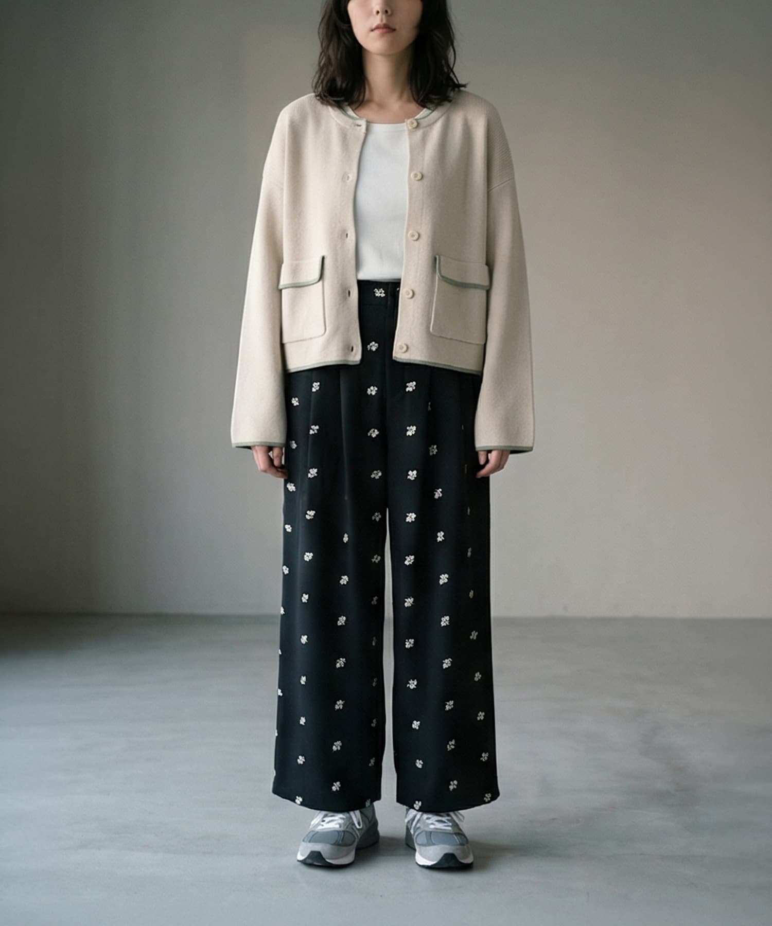 さりげない柄が、いつものパンツスタイルを格上げする。■ Designベーシックなタックパンツに、小さな花柄刺繍を散りばめた大人のための一本。主張しすぎないミニマルな刺繍が、シンプルなパンツにほどよい個性をプラス。フロントタック入りで腰まわりに程よいゆとり。身体のラインを拾いすぎず、すとんと落ちる縦ラインが脚をすっきり見せます。高身長の方やLサイズ以上の方でも安心して着用できる、バランスの良いシルエットです。■ Fabricポリエステルツイル素材を使用。程よいハリと落ち感があり、シルエットをきれいにキープ。ポリウレタン混でわずかな伸縮性があり、長時間の着用でもストレスの少ない穿き心地。刺繍は同系色でまとめることで、大人のスタイルに馴染む上品な表情に仕上げています。■ Coordinate・同素材ジャケットと合わせてセットアップ風に・シンプルなシャツで洗練された大人スタイル・ロングコートと合わせて縦ラインを強調ベーシックなのに、少しだけ違う。そのさりげない個性が、大人の装いを引き立てる一本です。【セット販売はこちら】850228[SET]【BLK001】花柄刺繍ツイルテーラードジャケット×タックパンツ===================================裏地:なし透け感:なし光沢感:なし伸縮:なしケア方法:手洗い可(クリーニング推奨)===================================■ Noticeこちらは海外縫製商品となります。縫製や細かな仕様に若干の個体差が生じる場合がございますが、いずれも品質基準を満たした良品のみをお届けしております。