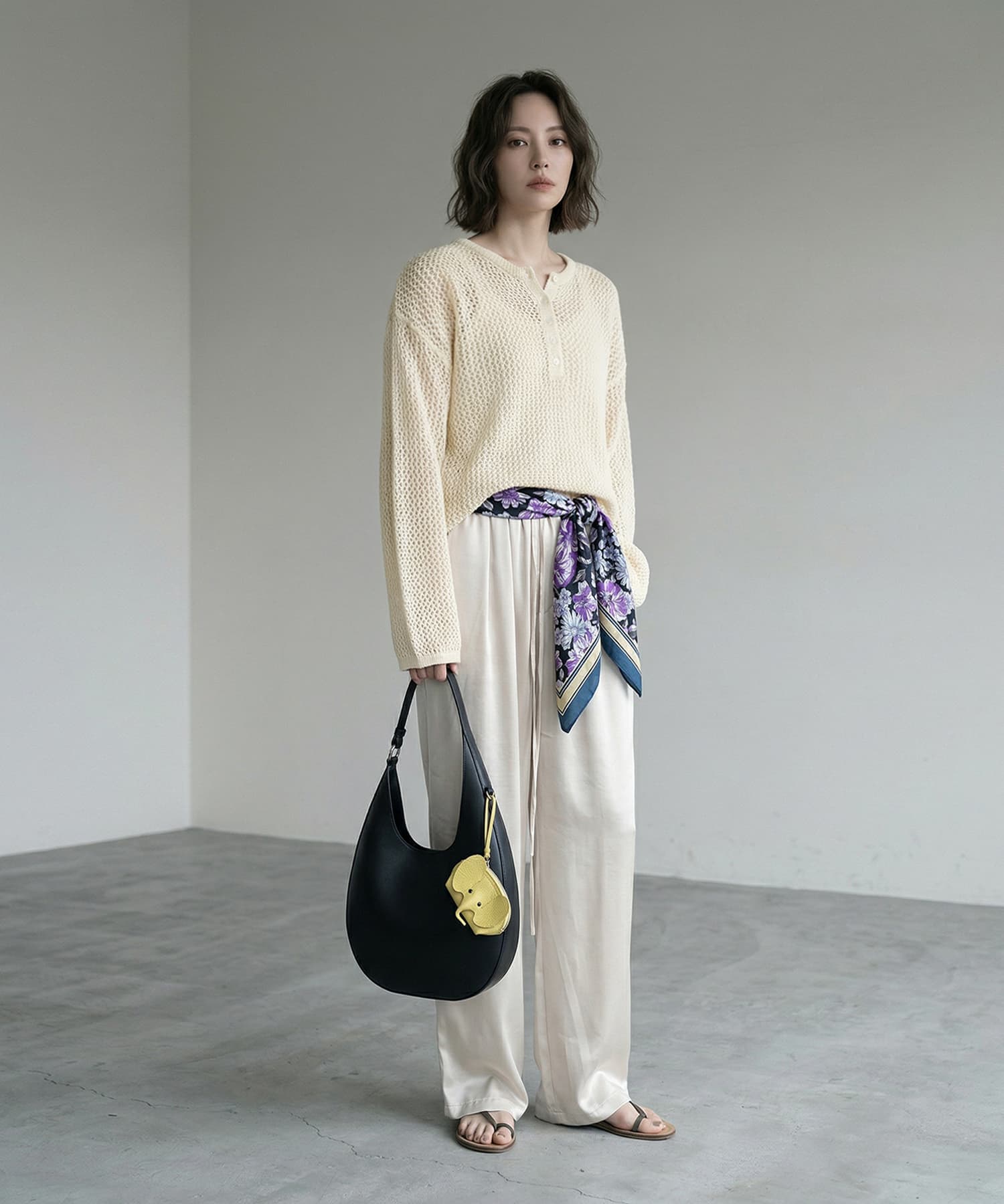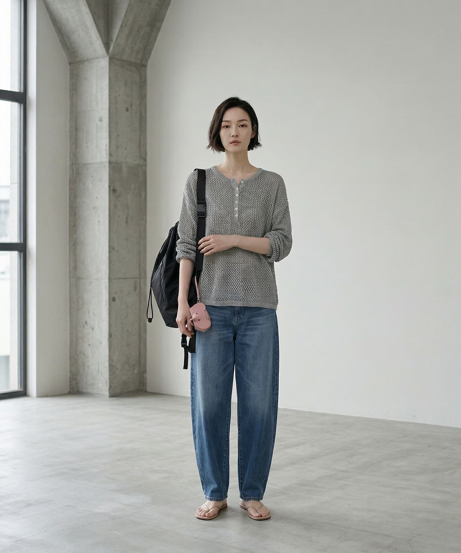 抜け感で魅せる。大人のためのメッシュ編みヘンリーネックプルオーバー。高身長・がっちり体型の方にもバランスよく着ていただける一枚です。■ Design程よく透けるメッシュ編みが、軽やかで洗練された印象に。シンプルな中にさりげないアクセントを添えるヘンリーネックが、抜けすぎない大人のバランスを演出します。前後2WAY仕様で、ヘンリーネックを前にしてアクセントに、後ろにしてシンプルなクルーネック風にも着用可能。気分やスタイリングに合わせて、着こなしの幅が広がります。ゆとりのあるシルエットで体のラインを拾わず、自然にカバー。ドロップショルダーと長めの袖が、こなれた雰囲気を引き出します。ベーシックカラー展開で、スタイリングに取り入れやすく、着回し力も抜群です。■ Fabric通気性に優れたメッシュ編み素材を使用。軽くドライなタッチで、汗ばむ季節でも快適な着心地。程よい透け感がありながらも、ラフになりすぎず、大人にちょうどいい抜け感を演出します。■ Coordinate・タンクトップやキャミソールを合わせて、ヘルシーなレイヤードに・スラックス合わせで、クリーンで都会的なスタイルに・デニムと合わせて、程よく力の抜けたカジュアルに一枚で“雰囲気が出る”から、シンプルなボトムでもサマになる。大人の夏にちょうどいい、軽やかトップスです。===================================裏地:なし透け感:あり光沢感:なし伸縮:あり(編み地特性による)ケア方法:手洗い推奨===================================■ Noticeこちらは海外縫製商品となります。多少の個体差が生じる場合がございますが、品質基準を満たした良品のみをお届けしております。