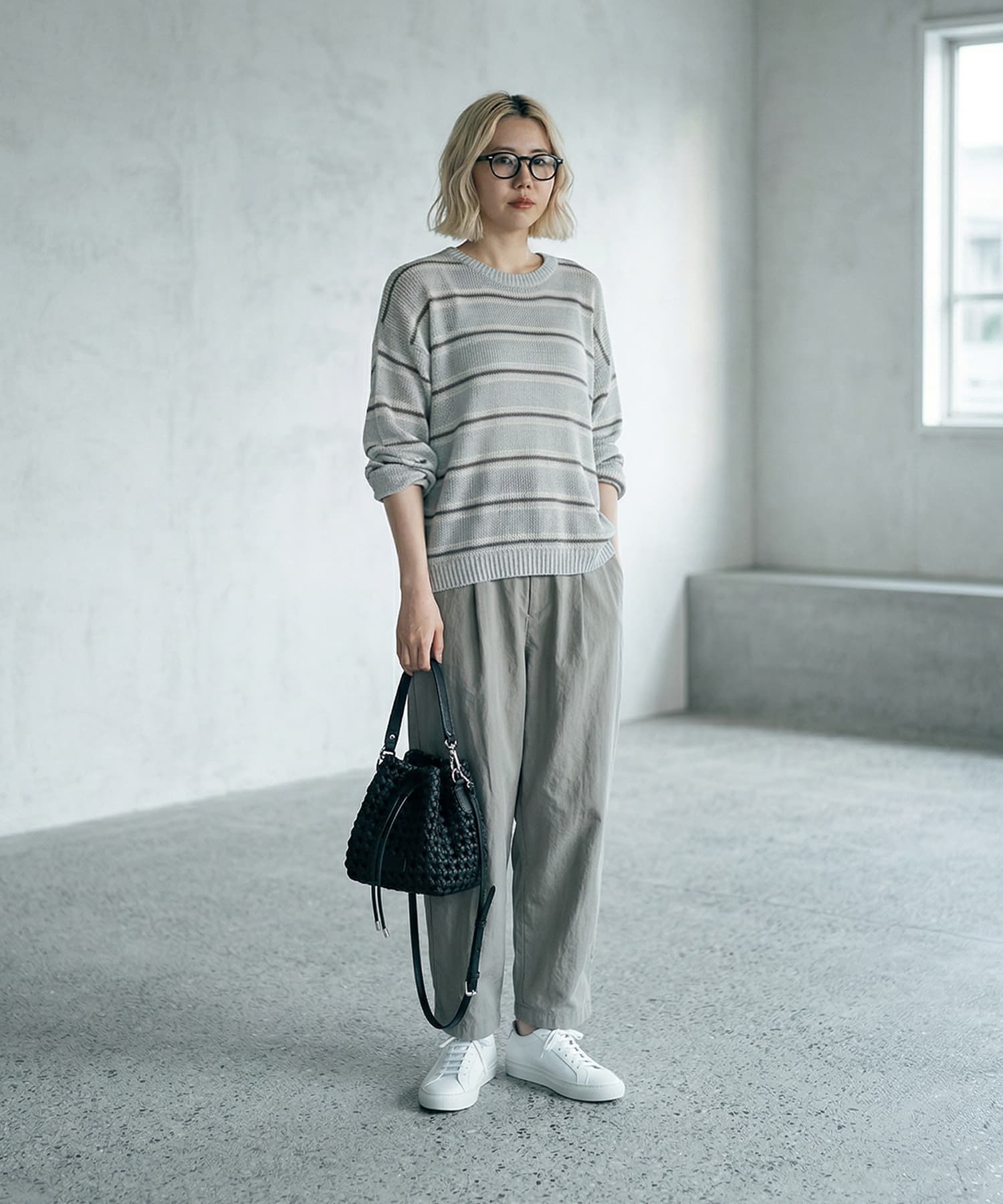 抜け感で魅せる。大人のためのプルオーバー。高身長・がっちり体型の方にもバランスよく着ていただける一枚です。■ Design細ピッチのボーダーが、カジュアルになりすぎず洗練された印象に。落ち着いたグレー×ブルー配色で、大人のスタイリングに自然に馴染みます。程よくゆとりのあるシルエットとドロップショルダーで、体のラインを拾わずリラックスした着心地。やや短めの着丈とリブ仕様の裾が、全体のバランスを引き締め、重たく見せません。シンプルながらも計算されたバランスで、1枚でサマになるデザインです。■ Fabric綿のようなナチュラルな風合いのニット素材を使用。軽やかで柔らかく、ロングシーズン快適に着用いただけます。程よい厚みと編み地で、カジュアルすぎず大人にちょうどいい質感に仕上げています。■ Coordinate・スラックスと合わせて、都会的でクリーンな印象に・デニムと合わせて、抜け感のある大人カジュアルに・ショートボトムと合わせて、バランスの取れた軽やかなスタイリングにシンプルだからこそ、合わせるアイテムで表情が変わる。日常にちょうどいい“使える一枚”です。===================================裏地:なし透け感:ややあり(編み地による)光沢感:なし伸縮:ありケア方法:手洗い推奨===================================■ Noticeこちらは海外縫製商品となります。多少の個体差が生じる場合がございますが、品質基準を満たした良品のみをお届けしております。