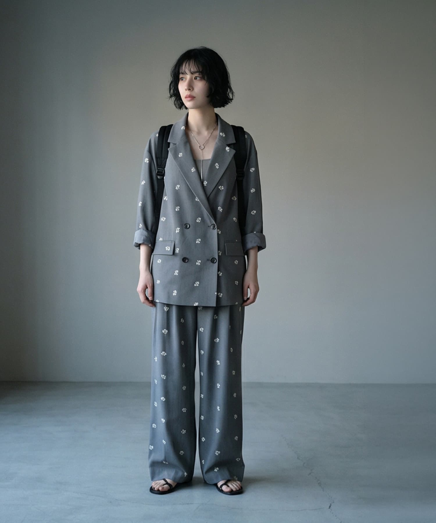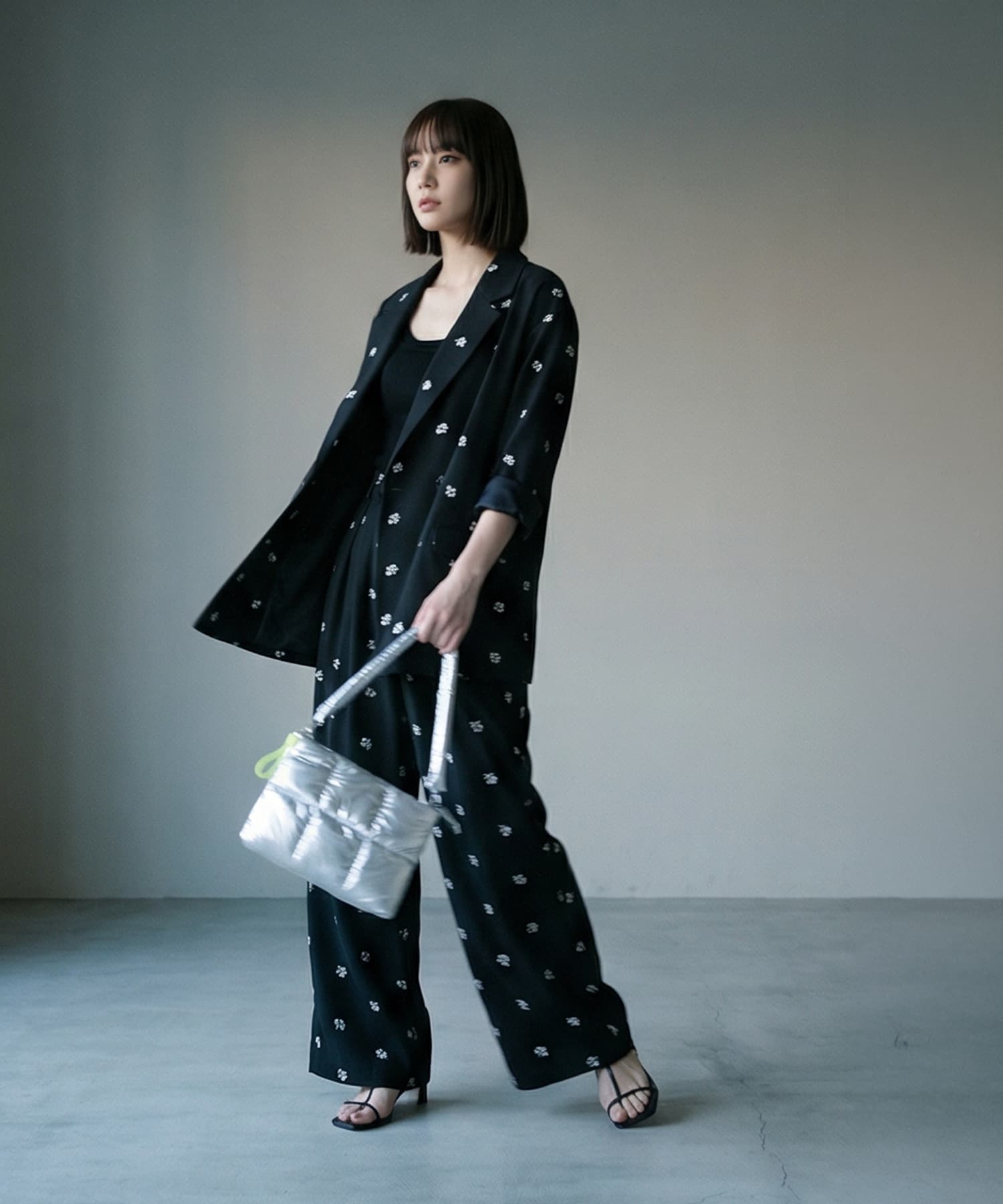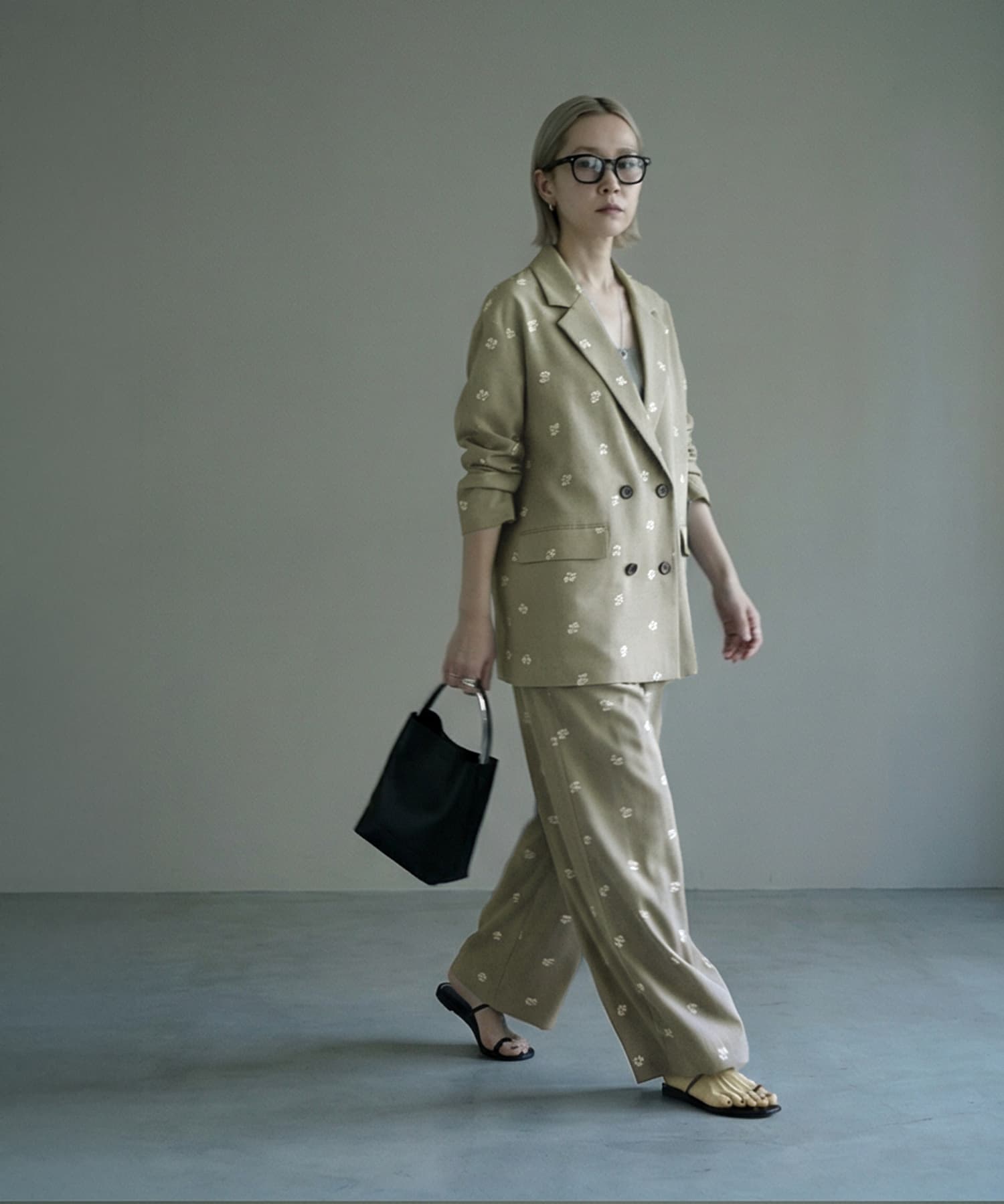 ※こちらはセット特別価格の商品です。返品等で単品購入となった場合は、単品価格へ変更となりますのでご了承ください。■ Designテーラードジャケットとタックパンツを、同素材で仕立てたセットアップ。全体に散りばめた小さな花柄刺繍が、シンプルなセットアップに程よい個性をプラス。ジャケットは程よくゆとりのあるシルエットで、肩のラインからすとんと落ちる直線的なフォルム。パンツはフロントタック入りで腰まわりに余裕を持たせ、脚のラインを拾いすぎないストレートシルエット。■ Fabricポリエステルツイル素材を使用。程よいハリと落ち感があり、セットアップでも重たく見えない軽やかな質感。刺繍は同系色でまとめることで、上品で落ち着いた印象に仕上げています。■ Coordinate・インナーにTシャツを合わせて抜け感のあるセットアップスタイル・シャツ合わせでマニッシュな大人コーデに・それぞれ単品使いで、いつものスタイリングのアクセントにきちんと見えるのに、堅すぎない。大人のワードローブに馴染む、少しだけ特別なセットアップです。【単品販売はこちら】 850216【BLK001】花柄刺繍ツイルテーラードジャケット850217【BLK001】花柄刺繍ツイルタックパンツ===================================裏地:ジャケットあり/パンツなし透け感:なし光沢感:なし伸縮:ややありケア方法:ジャケット(ドライクリーニング推奨(家庭洗濯不可))パンツ(手洗い可(クリーニング推奨))===================================■ Noticeこちらは海外縫製商品となります。縫製や細かな仕様に若干の個体差が生じる場合がございますが、いずれも品質基準を満たした良品のみをお届けしております。