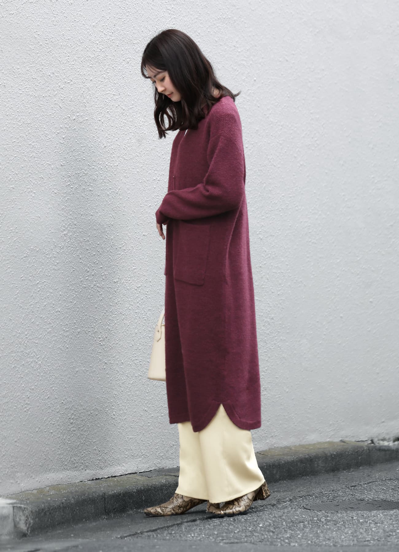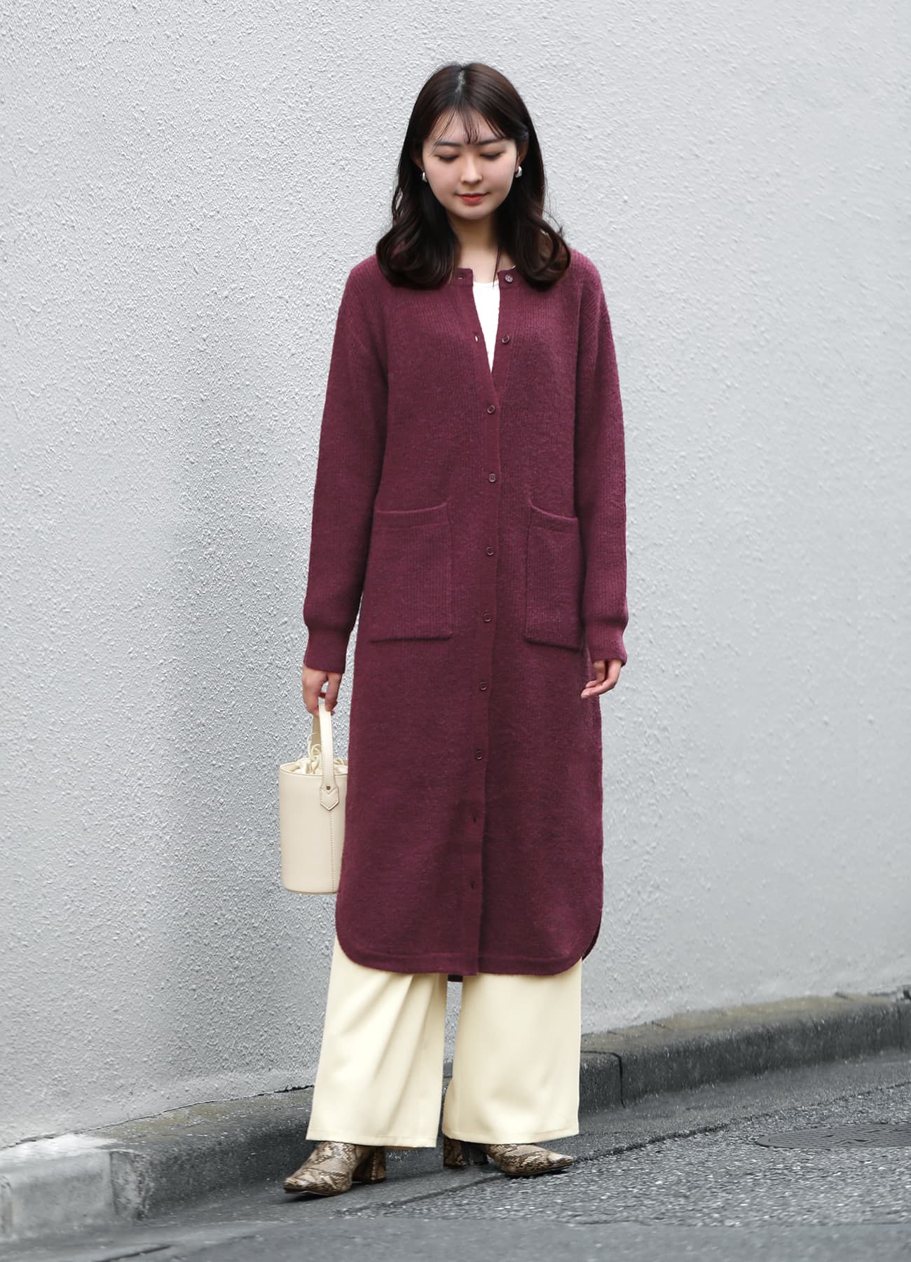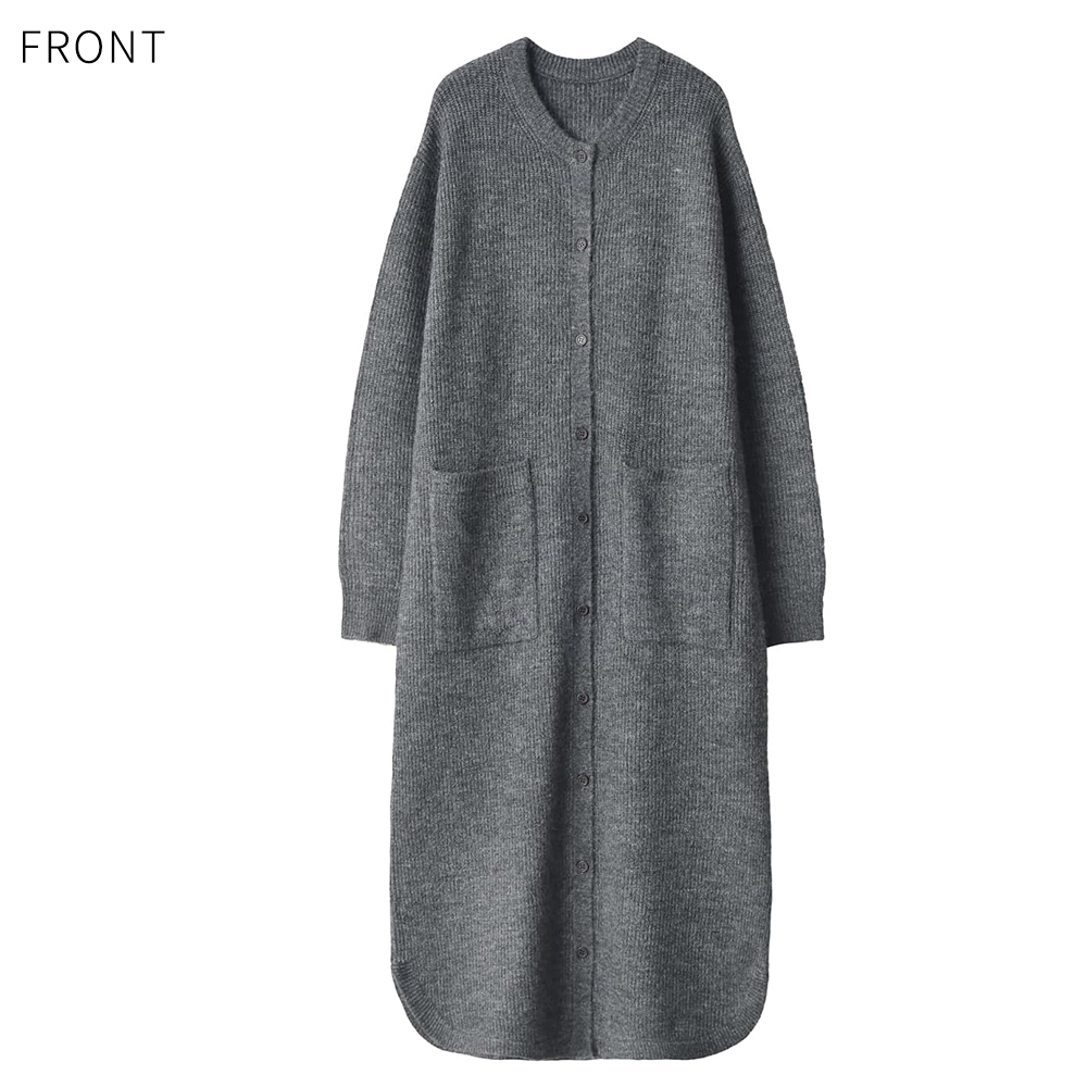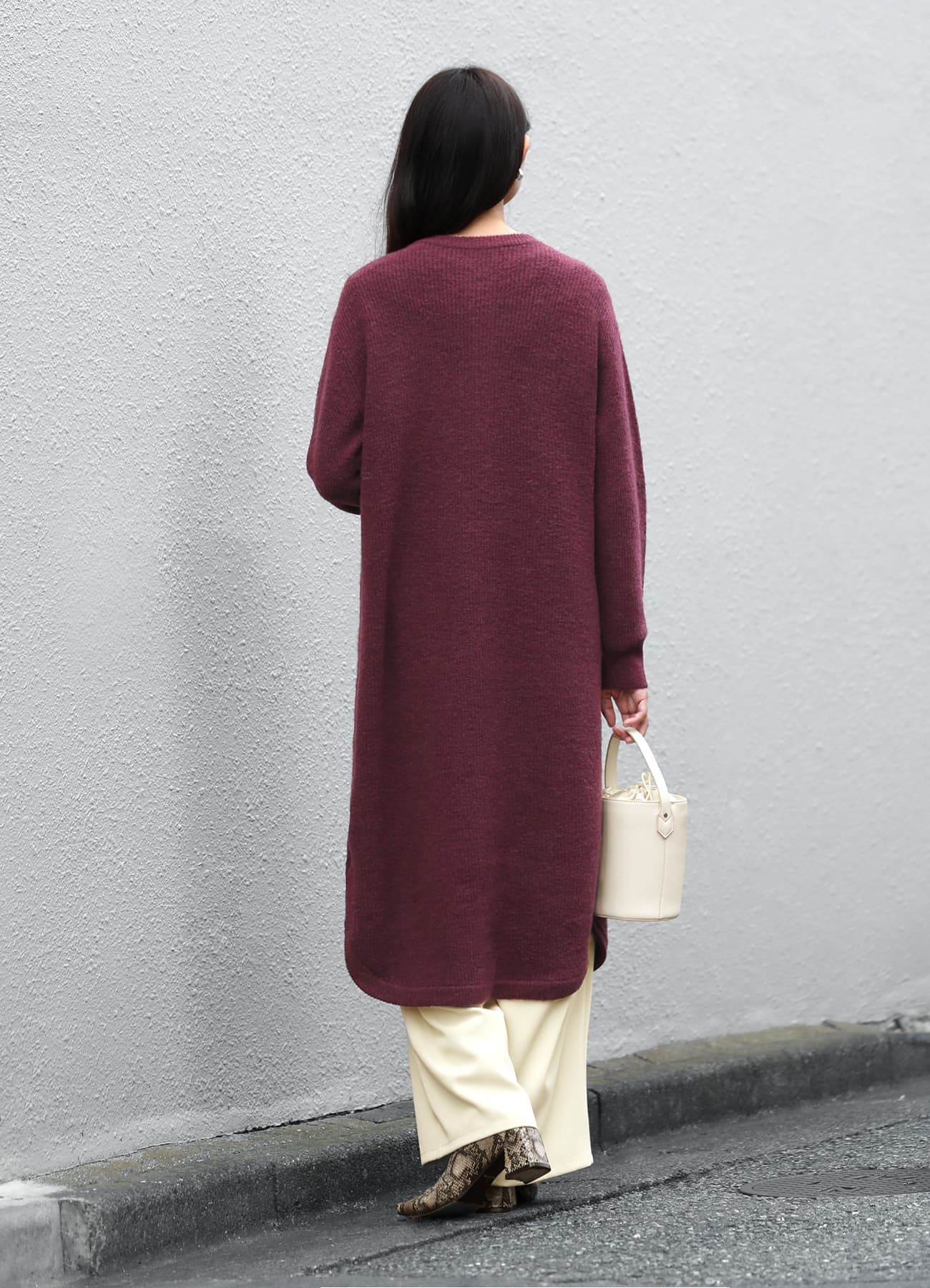 【不良品以外の返品・交換不可商品となります】◆10/31、11/2インスタライブご紹介商品◆アーカイブのご視聴はこちらから→【10/31夜ライブ】【11/2夜ライブ】ふんわりとした質感が可愛い、軽くて暖かなロングカーディガン。前を閉じればワンピースのように着ることもできる、2WAYタイプのカーディガンです。・トップス+ボトムスの上に羽織る・ワンピースの上に羽織る・ニットワンピースとして着るほかに、下にパンツやロングスカートといったボトムスを合わせても可愛く、その際、ボタンは全て閉じてもイイですし、上から3~4つだけを閉じて下はオープンにし、ボトムスが見えるように着てもカワイイです。ロング丈なのに首元がクルーネックというのがちょっと珍しくてまた可愛く、付け襟を着けたり、ハイネック系のデザイン襟ブラウスやインナーカットソーなどを下に着てチラ見せさせる着こなしもお薦め。首元が詰まっているのが苦手な方は、上のボタンを1つ開けることでキーネック風の開き方になり、お顔周りがスッキリとした感じを楽しめます。※同じ糸ではありませんが、既存モデルでは『デザインポケットロングカーディガン』とお素材の系統が似ています。◆さらに◆胴長に見えてしまわないかが心配なロング丈も、高めの位置にポケットを付けることで逆にバランスが良く見えるよう計算しています。【デザインや仕様について】◆ゆとりのあるサイズ感。◆袖幅にも適度なゆとり感あり。◆フロントにポケット付き。◆ベーシックなクルーネック。◆フロントはボタンでフルオープン可能。◆ボタン:ボディと同色に染めた樹脂ボタン。◆裾はリブで締めず、ストレートに落としたタイプ。ボトムスやワンピースの形を潰さず合わせやすい形状。◆肩幅を問わないドロップショルダータイプ。◆手洗い:可能【丈感について】◆ある程度の身長(162cm程度以上が基準)があると、着丈117-120cm程度の布帛ワンピース(布地のワンピースです)を着ているような丈感になります。◆157cm以下になると『足首はしっかりと見える感じのロング丈のワンピース』という印象になります。◆ニットなので重力により、着丈の実寸よりも着用時は長い丈感になります。◆『この丈感で着ないとイマイチ』という決まりは無く、どのような丈感で着ても可愛いデザインです。【生地について】◆ふんわりとしたローゲージ編み◆チクチク感:基本的には感じません◆毛羽立ち:とくにできやすい方ではありません◆毛抜け:引っ張れば多少抜ける程度。洋服に付くことは(多少はあるかもしれませんが)基本的に気にされなくて大丈夫です◆暖かさ:暖かいです◆厚み:ふんわり系の厚みなので、そこまで厚い感じはありません◆重さ:軽量です◆伸縮性:あり◆光沢感、透け感:なし【お色について】◆ワイン:パープルに僅かなピンクを混ぜて柔らかくしたような、少し優しさのあるダーク系カラー。◆ダークグレー:4種類くらいの濃淡差があるグレーを混ぜたお色。明るい色も多めに入っているため、ダークと言えどそこまで暗い感じにはなりません。【SNS用ハッシュタグ】#2345072wayロングカーディガン(このハッシュタグでInstagramなどSNS内で検索をしますと、こちらをお持ちのお客様のご投稿があれば、簡単に見つけてご覧いただくことができます)通常販売価格:11,800円【販売理由:販売終了商品】【お客様へのお願い】メルカリ等、個人および法人販売サイトにおける転売目的でのご購入は、ご遠慮いただきますようお願いいたします。