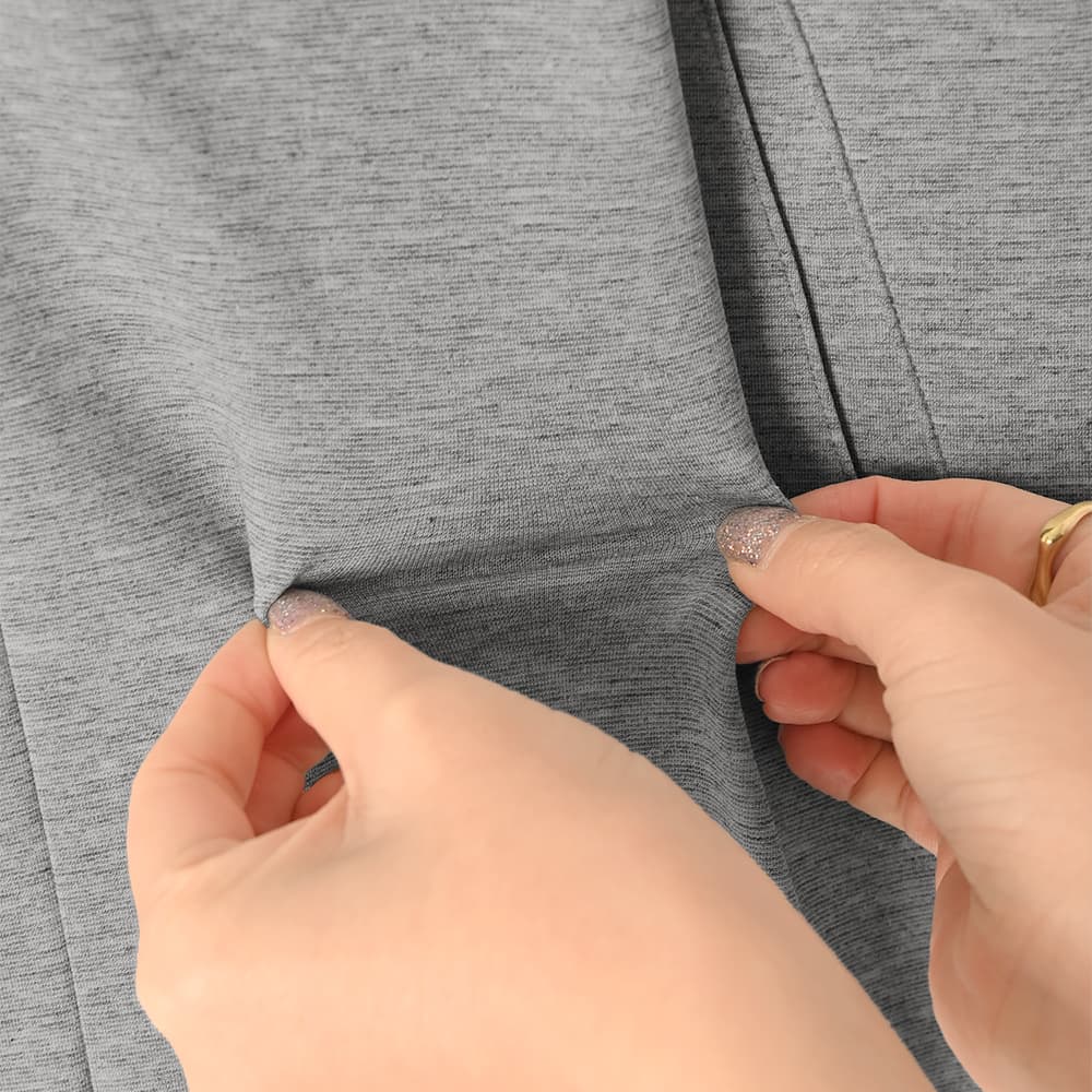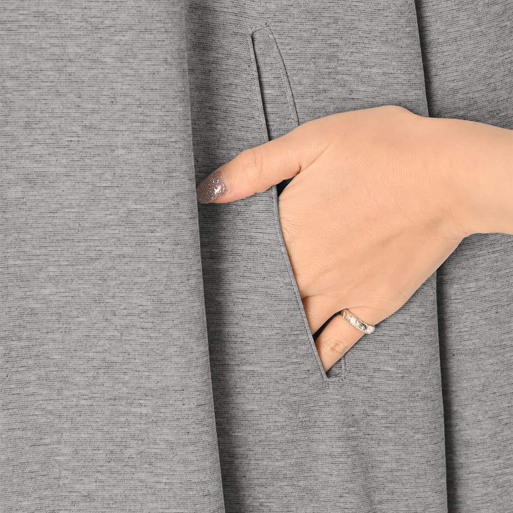 扱いやすくて肉感カバー効果に優れた、お客様にも人気のポンチ生地(カットソー生地の一種で、Tシャツ系カットソー生地とは異なるしっかりめの質感です)を使用。よく伸びてシワが気にならず、ラクな着心地なのに『それなりにきちんと見える』ところが働く女性を中心に人気を集めています。