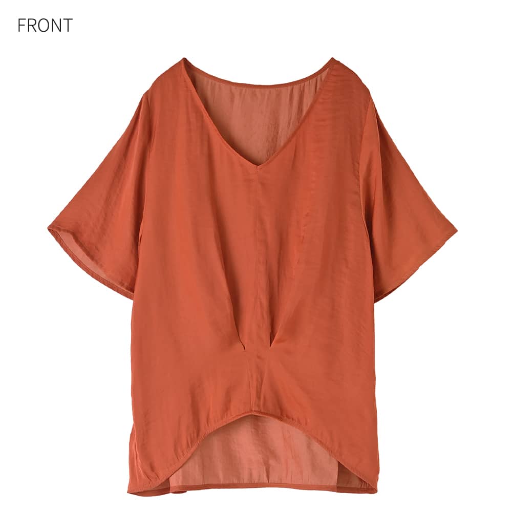 基本的には裾をアウトでバランス良く着こなせるようデザインしていますが、お好みで前だけインしてもキレイにキマります。顔周りをスッキリと見せる美しいVネックや、それと呼応するように入れられた腹部タックなど、キレイに見せる工夫の数々が『着るだけでなんかステキ』を実現!