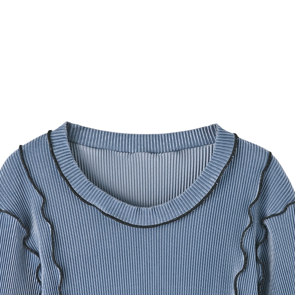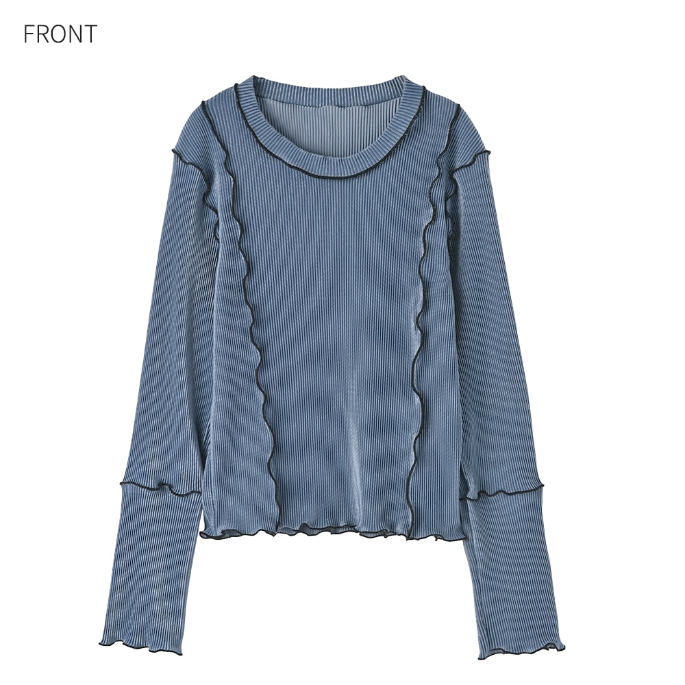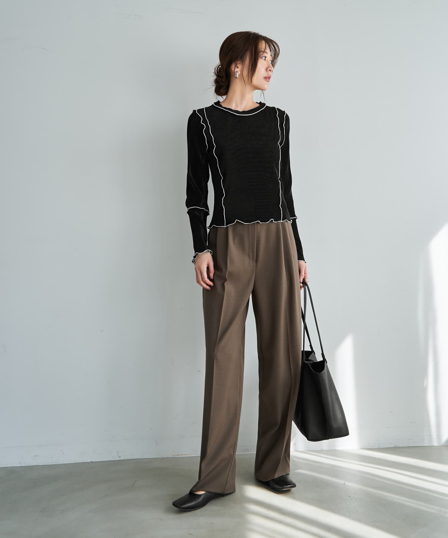 甘くならない『大人のメロウ』シリーズ黒のラインを着痩せ位置に配置した、質感が特徴的なカットソー生地トップス◆2/5インスタライブご紹介商品◆アーカイブのご視聴はこちらから→【2026/2/5ライブ】【このシリーズの特徴】◆メロウ処理の配色ラインを効果的に配した、程よくデザイン性のあるトップスシリーズ。◆着ると甘さの出ないデザインで、大人がカッコ良く着こなせる『辛口メロウ』なところがポイント。◆非ゆったりシルエットのコンパクトなバランスが作れる、最旬テイストなトップス。◆ワイドパンツやロングスカートなどの重めボトムスと相性が良く、メリハリのあるバランスが作れるシルエット。【このトップスについて】あまり見かけないタイプの特殊カットソー生地を使用した、質感のオシャレさも魅力な長袖トップス。メロウにありがちな甘さがまったく無く、むしろクールなカッコ良さを入れたコーデも作りやすいような、大人っぽさや微量のモード感があります。黒のラインが印象を引き締めることで膨張が気にならず、ブラックに比べてホワイトが太って見える、というようなことがありません。◆デザインのポイント:ブラックのメロウ線を効果的に使い、膨張を抑えて身体をスッキリと見せる位置を細かく計算。袖のひじ下にある線位置も絶妙で、腕が長く見えるようになっています。◆生地:薄いジャージー生地をプリーツ状に折りたたんでハリ感を出したような、特殊タイプのカットソー生地。表面の線に『リブとプリーツの中間』という感じの立体感があり、しっかりとした凹凸による肉感カバー効果があります。サラッとしていて肌離れが良く、シワや毛羽立ちも気になりにくい素材。自然な微光沢感を持ち、伸縮性にも富んでいます。※肌に当たる裏面は上記の質感ですが、表面はそれに加えてベロアの質感を薄っすらと乗せたような風合いになっています(見た目が冬っぽいということはありません)。※同シリーズの236121、236122とはまったく異なる生地を使用しています。◆シルエット:身体に付かず・離れずで適度なゆとりがある着用感。生地が線状にたたまれているぶん伸びる余力がたくさんあり、11号体型の方までに対応できます。◆活用方法:一枚で着てもトップスとして十分に満足できるデザイン性があり、裾はインでもアウトでも着用可能。シリーズの中では質感や厚み、サイズ感的に、1番幅広く・色々な方に一枚で着用しやすいタイプです。何かのインナーとしても使えますが、それよりは一枚で着るトップスとしての完成度が高いところが特徴です。◆備考:メロウ線の配置は236122と似ていますが生地の質感に大きな差があり、着たときの印象はけっこう変わります。また首開きはあちらの方が広く、あちらは鎖骨下5-6cm程度まで開きますが、こちらは鎖骨が隠れます。【メロウリブシリーズの比較】◆サイズ感は236123が1番大きく、236122→236121の順でコンパクトになります。◆1番コンパクトな236121でも、Mサイズの普通体型であれば問題ありません。◆ピチピチとするフィット系ではなく、当店の『とろみ薄リブ』シリーズのように、薄く・ユルく自然に身体にフィットする感じなので安心です(生地の質感はまったく異なります)。◆236121/ベストレイヤードトップス<デザイン性と着回しアレンジ力が1位ならコレ>生地はニットソー系、薄手で柔らか、コンパクトシルエット、身体が細く見える「ゆるフィット」系、ベストとトップスを別々で使える、スカート派の方にも活用度が高い◆236122/フリルライントップス<優しい雰囲気でインナー使いにも最適>生地はニットソー系、薄手で柔らか、コンパクトシルエット、身体が細く見える「ゆるゆるフィット」系、無駄な大きさが無くベストやサロペット・ジャンスカのインナーにした際もスッキリ、色合いが柔らかくモード感が1番無いタイプの非カッコいい系◆236123/微光沢プリーツ調ライントップス<1番ゆとりがあり、体型が気になる方にはコレ>生地はハリ感のあるジャージープリーツ系、適度なゆとりを持つ非フィット系、ハリ感による肉感カバー効果あり、モード感を入れたカッコいい系の着こなしも作りやすい、丈もこれが一番長い【その他の仕様などの情報】◆着用時期:10-4月頃が目安◆丈感:前は下腹が隠れる程度の丈感/背面は腰が隠れる長さ◆シルエット:身体に付かずに『浮きながら添う』シルエット◆首元:クルーネック(鎖骨がギリギリ隠れる程度の開き加減)◆肩幅:広め◆アームホール:普通(とくに狭くも広くもない一般的な開き加減)◆袖幅:普通(腕に付かず・離れずな感じ)◆袖丈:長袖(指の付け根が隠れる長さ)◆袖口:何もなし(メロウ処理/伸縮します)◆袖のたくし上げ:可能◆厚み:(カットソーとして)普通◆柔らかさ:ハリ感と柔軟性が共存◆肌触り:サラッとして肌から離れる感じ◆着用ジワ:できにくい◆毛羽立ち:できにくい◆伸縮性:あり◆光沢感:少しあり◆透け感:なし(ホワイトは多少あり)◆スリット:なし