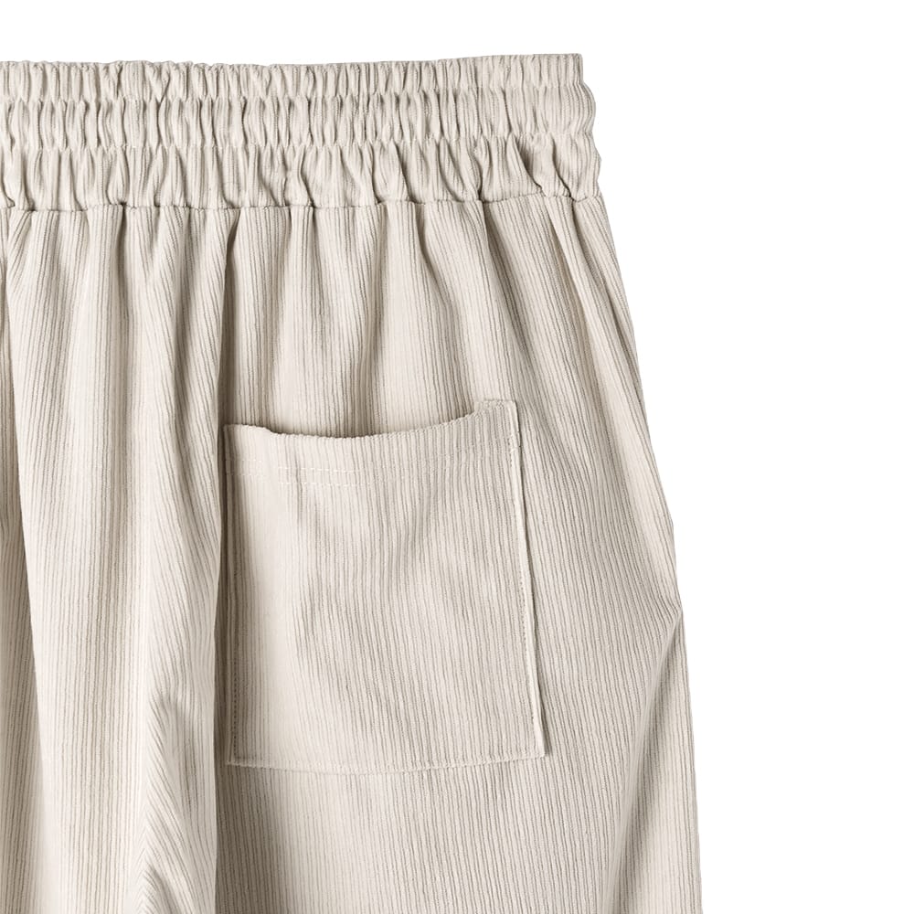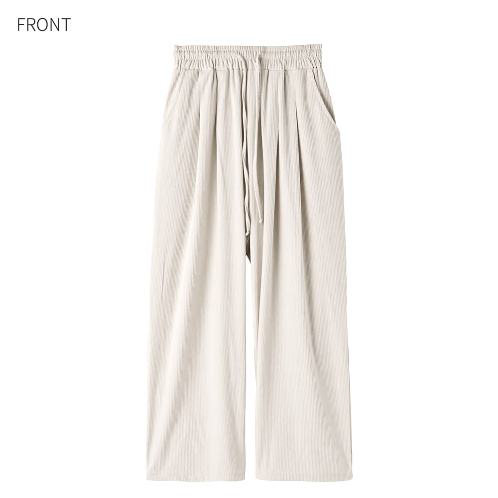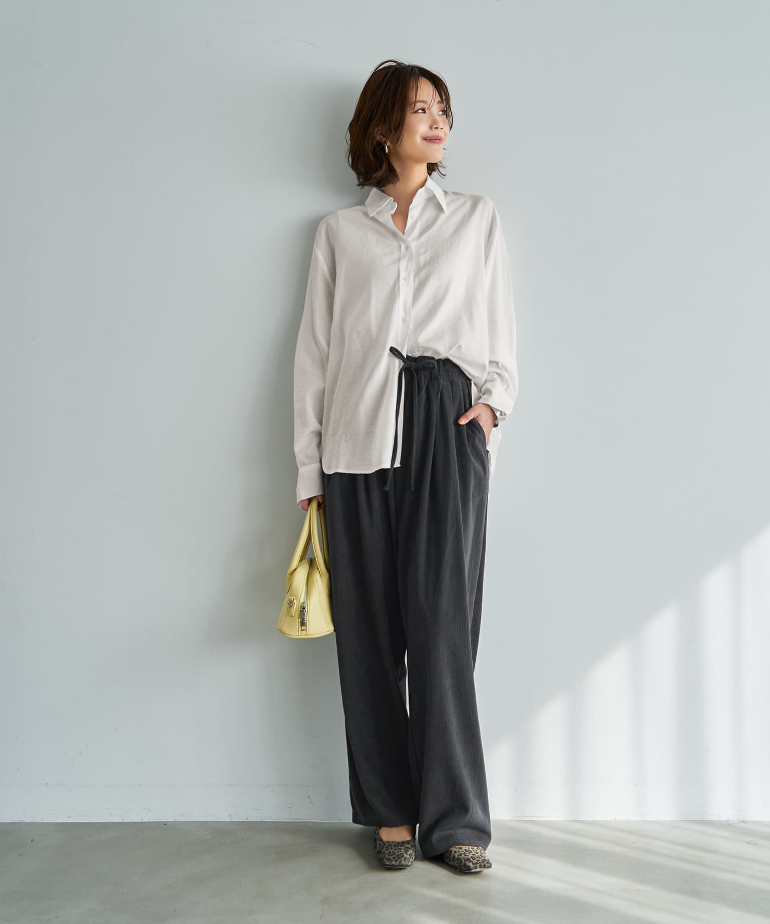 雰囲気のあるオシャレ生地を使用した、全周ゴムのリラックスギャザーパンツ。こういったパンツの中ではしっかりめの着用感で、「春服が欲しいけど寒い日も穿けるような最低限の暖かさは欲しい」という方にもお薦めです。