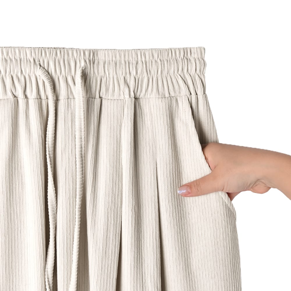 ◆サイズ感:かなりゆったりとしておりLサイズにも対応。落ち感があるためボリュームは気にならず、細い方でもオシャレに穿けます。ドレープを伸ばしたときのわたり幅は42cm程度(!)もありますので、太ももが太くてパンツが穿きづらい方にもお薦めです。
