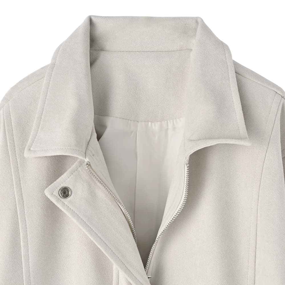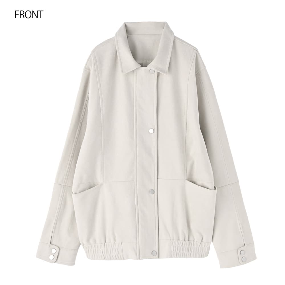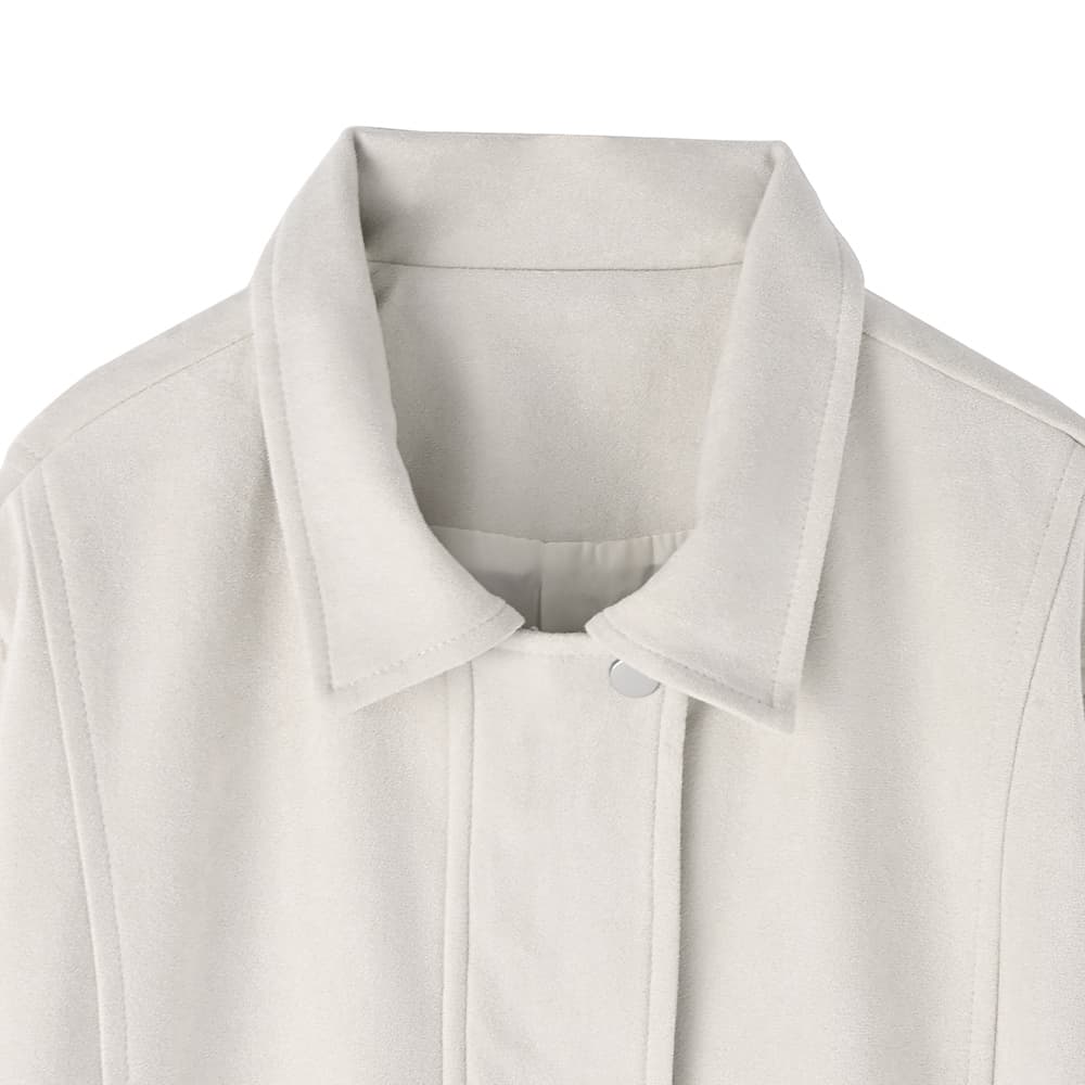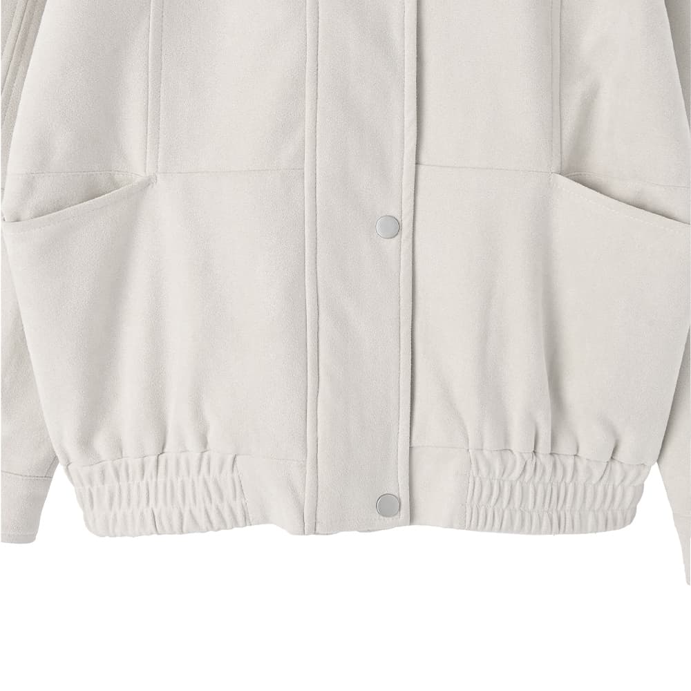 顔映りの良い明るい色で春にぴったり適度な防寒性で使える時期が長い、上品な質感のキレイめ大人ブルゾン◆2/26インスタライブご紹介商品◆アーカイブのご視聴はこちらから→【2026/2/26ライブ】【このブルゾンの特徴】MA-1に準ずる暖かさで活用シーズンが長く、使い勝手の良い軽めなブルゾン型アウター。過去にも似たようなアイテムをお作りして大好評をいただきましたが、プロデューサー自身が最近またよく使用しており、今の空気感に合うものと判断したためまたご用意してみました。◆明るい色が春待ち気分にマッチ◆顔色がよく見えて大人に嬉しい◆着回し力絶大な絶妙ホワイト◆適度に防寒性があり、春前から活躍◆気軽に羽織れるショート丈◆程よくキレイめで程よくカジュアル◆ボソボソしないなめらかな質感◆重さストレスを感じない着心地◆洋服を選ばず羽織れるシルエット◆着る人の系統や年代を問わないデザイン◆流行りとは無関係で長く使える◆ゆったりとしつつ大き過ぎないサイズ感【このブルゾンの詳細】◆サイズ感:中に厚地のニットを着込めるゆったり感はありつつ、オーバーサイズまではいかない適度な大きさ。小柄な方でも着られている感の出ないシルエットです。◆色合いや質感:馴染みの良いグレイッシュ系ホワイトで、何色とでも合う万能系カラー。ボソボソとしたカジュアルなスエードではなく、なめらかでキメの細かい品のある質感です。◆コーディネート:スカートでもパンツでも合い、ワンピース、サロペット、ジャンパースカートの全てにマッチ。アイテムを問わずに合わせることができます。◆過去のエコスエードBIGブルゾンとの比較:あちらを発売した時はオーバーサイズ流行りの初期でしたのでサイズ感が大きく、今回のものはオーバーサイズではありません。その為重さも150グラムほど軽く、より今っぽいシルエットで着ることができます。色は過去のものの方がクリーム色がかっており、今回のものはイエロー味なし。ざっくりとした雰囲気は似つつも、デザインはもちろん生地も生産工場もパターンも異なりますので、『似て非なるもの』という感じです。【さらにプラス情報】◆暖かさ:Gジャンよりは暖かく、MA-1の下に位置するような温度感。本気の真冬コートで防寒をするような気温ではないけど、まだけっこう寒い…というような時期や日に活躍します。◆手洗い:フェイクスエード生地のアウターということで、基本的には手洗い不可としています。ただ最近はダウンでも手洗いする人もおりますので、ご自分で検索するなどして行っていただくぶんには良いと思います。その際は自己責任となりますので、ご承知の上でご判断くださいますようお願いいたします。【その他の仕様などの情報】◆着用時期:肌寒いときであればいつでもOK◆サイズ感:ゆったりめのサイズ感(Lサイズ体型にも対応)◆丈感:前は脚の付け根が隠れる丈感/背面はヒップがギリギリ隠れる程度の長さ◆首元:ボタンを閉じるとステンカラー◆肩幅:広め◆アームホール:広め◆袖幅:広め◆袖丈:長袖(指先がちょこんと出る長さ)◆袖口:スナップボタン2個あり◆袖のたくし上げ:(ボタンを開けずにそのまま)可能◆厚み:普通◆重さ:気にならない程度(700グラム程度)◆柔らかさ:柔らかさと適度なハリ感が共存◆肌触り:表面はしっとり・なめらかな感じ/裏面はスルスルした感じ(裏地)◆着用ジワ:できにくい◆毛羽立ち:できにくい◆伸縮性:なし◆光沢感:なし◆透け感:なし◆スリット:なし◆着脱:フロントファスナー&スナップボタン◆ボタンの色:表面はマットなシルバー/ボタンの内側はツヤありのシルバー◆ファスナーの色:ツヤありシルバー◆ポケット:フロント左右にあり◆裏地:あり(袖口までの総裏地)◆手洗い:不可◆アイロン:不要◆スチーマー:使用OK◆撥水加工:なし【お色について】◆エクリュ:少し深みのある、こっくりとしたニュアンスホワイト。僅かにグレイッシュでイエロー味や赤味はほぼ無く、白が深くなった感じのお色です。過去に扱っていたエコスエードBIGブルゾンの白のようなイエロー味は無く、もっと白に近い感じです。【お知らせ事項】白系の生地の製品は、少し機械に当たっただけでも何かが付いたりしますので、生地に微細なキズや汚れ、色ムラや繊維の混在が生じることがしばしばございます。胡椒の粒レベルの点のような汚れすらも検品から落としてしまうとほとんどを焼却することになり、それは環境保全の観点などからもよくないことですので、目を凝らして見なければわからないような、着用時の印象に影響しないものは検品を通しております。あらかじめご理解いただきますようお願いいたします。【SNS用ハッシュタグ】#236172エコスエードホワイトブルゾン(このハッシュタグでInstagramなどSNS内で検索をしますと、こちらをお持ちのお客様のご投稿があれば、簡単に見つけてご覧いただくことができます)