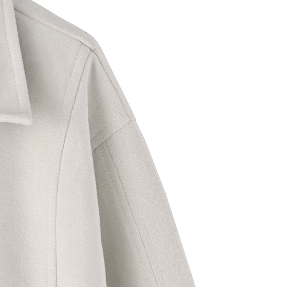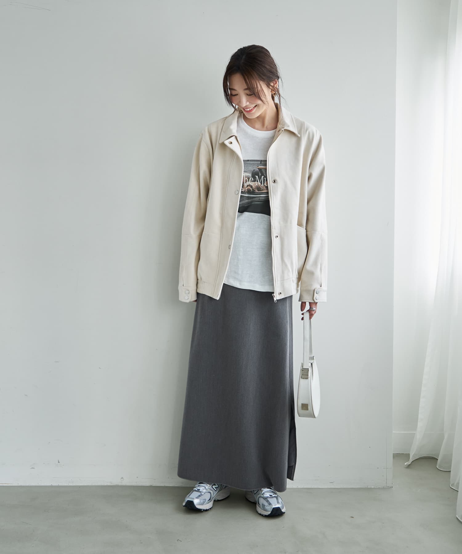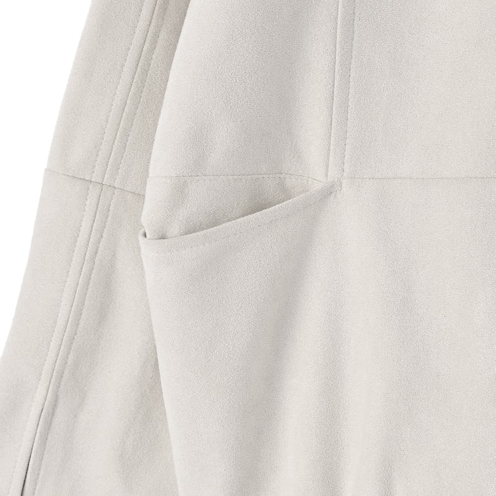 顔映りの良い明るい色で春にぴったり適度な防寒性で使える時期が長い、上品な質感のキレイめ大人ブルゾン◆2/26インスタライブご紹介商品◆アーカイブのご視聴はこちらから→【2026/2/26ライブ】【このブルゾンの特徴】MA-1に準ずる暖かさで活用シーズンが長く、使い勝手の良い軽めなブルゾン型アウター。過去にも似たようなアイテムをお作りして大好評をいただきましたが、プロデューサー自身が最近またよく使用しており、今の空気感に合うものと判断したためまたご用意してみました。◆明るい色が春待ち気分にマッチ◆顔色がよく見えて大人に嬉しい◆着回し力絶大な絶妙ホワイト◆適度に防寒性があり、春前から活躍◆気軽に羽織れるショート丈◆程よくキレイめで程よくカジュアル◆ボソボソしないなめらかな質感◆重さストレスを感じない着心地◆洋服を選ばず羽織れるシルエット◆着る人の系統や年代を問わないデザイン◆流行りとは無関係で長く使える◆ゆったりとしつつ大き過ぎないサイズ感【このブルゾンの詳細】◆サイズ感:中に厚地のニットを着込めるゆったり感はありつつ、オーバーサイズまではいかない適度な大きさ。小柄な方でも着られている感の出ないシルエットです。◆色合いや質感:馴染みの良いグレイッシュ系ホワイトで、何色とでも合う万能系カラー。ボソボソとしたカジュアルなスエードではなく、なめらかでキメの細かい品のある質感です。◆コーディネート:スカートでもパンツでも合い、ワンピース、サロペット、ジャンパースカートの全てにマッチ。アイテムを問わずに合わせることができます。◆過去のエコスエードBIGブルゾンとの比較:あちらを発売した時はオーバーサイズ流行りの初期でしたのでサイズ感が大きく、今回のものはオーバーサイズではありません。その為重さも150グラムほど軽く、より今っぽいシルエットで着ることができます。色は過去のものの方がクリーム色がかっており、今回のものはイエロー味なし。ざっくりとした雰囲気は似つつも、デザインはもちろん生地も生産工場もパターンも異なりますので、『似て非なるもの』という感じです。【さらにプラス情報】◆暖かさ:Gジャンよりは暖かく、MA-1の下に位置するような温度感。本気の真冬コートで防寒をするような気温ではないけど、まだけっこう寒い…というような時期や日に活躍します。◆手洗い:フェイクスエード生地のアウターということで、基本的には手洗い不可としています。ただ最近はダウンでも手洗いする人もおりますので、ご自分で検索するなどして行っていただくぶんには良いと思います。その際は自己責任となりますので、ご承知の上でご判断くださいますようお願いいたします。【その他の仕様などの情報】◆着用時期:肌寒いときであればいつでもOK◆サイズ感:ゆったりめのサイズ感(Lサイズ体型にも対応)◆丈感:前は脚の付け根が隠れる丈感/背面はヒップがギリギリ隠れる程度の長さ◆首元:ボタンを閉じるとステンカラー◆肩幅:広め◆アームホール:広め◆袖幅:広め◆袖丈:長袖(指先がちょこんと出る長さ)◆袖口:スナップボタン2個あり◆袖のたくし上げ:(ボタンを開けずにそのまま)可能◆厚み:普通◆重さ:気にならない程度(700グラム程度)◆柔らかさ:柔らかさと適度なハリ感が共存◆肌触り:表面はしっとり・なめらかな感じ/裏面はスルスルした感じ(裏地)◆着用ジワ:できにくい◆毛羽立ち:できにくい◆伸縮性:なし◆光沢感:なし◆透け感:なし◆スリット:なし◆着脱:フロントファスナー&スナップボタン◆ボタンの色:表面はマットなシルバー/ボタンの内側はツヤありのシルバー◆ファスナーの色:ツヤありシルバー◆ポケット:フロント左右にあり◆裏地:あり(袖口までの総裏地)◆手洗い:不可◆アイロン:不要◆スチーマー:使用OK◆撥水加工:なし【お色について】◆エクリュ:少し深みのある、こっくりとしたニュアンスホワイト。僅かにグレイッシュでイエロー味や赤味はほぼ無く、白が深くなった感じのお色です。過去に扱っていたエコスエードBIGブルゾンの白のようなイエロー味は無く、もっと白に近い感じです。【お知らせ事項】白系の生地の製品は、少し機械に当たっただけでも何かが付いたりしますので、生地に微細なキズや汚れ、色ムラや繊維の混在が生じることがしばしばございます。胡椒の粒レベルの点のような汚れすらも検品から落としてしまうとほとんどを焼却することになり、それは環境保全の観点などからもよくないことですので、目を凝らして見なければわからないような、着用時の印象に影響しないものは検品を通しております。あらかじめご理解いただきますようお願いいたします。【SNS用ハッシュタグ】#236172エコスエードホワイトブルゾン(このハッシュタグでInstagramなどSNS内で検索をしますと、こちらをお持ちのお客様のご投稿があれば、簡単に見つけてご覧いただくことができます)