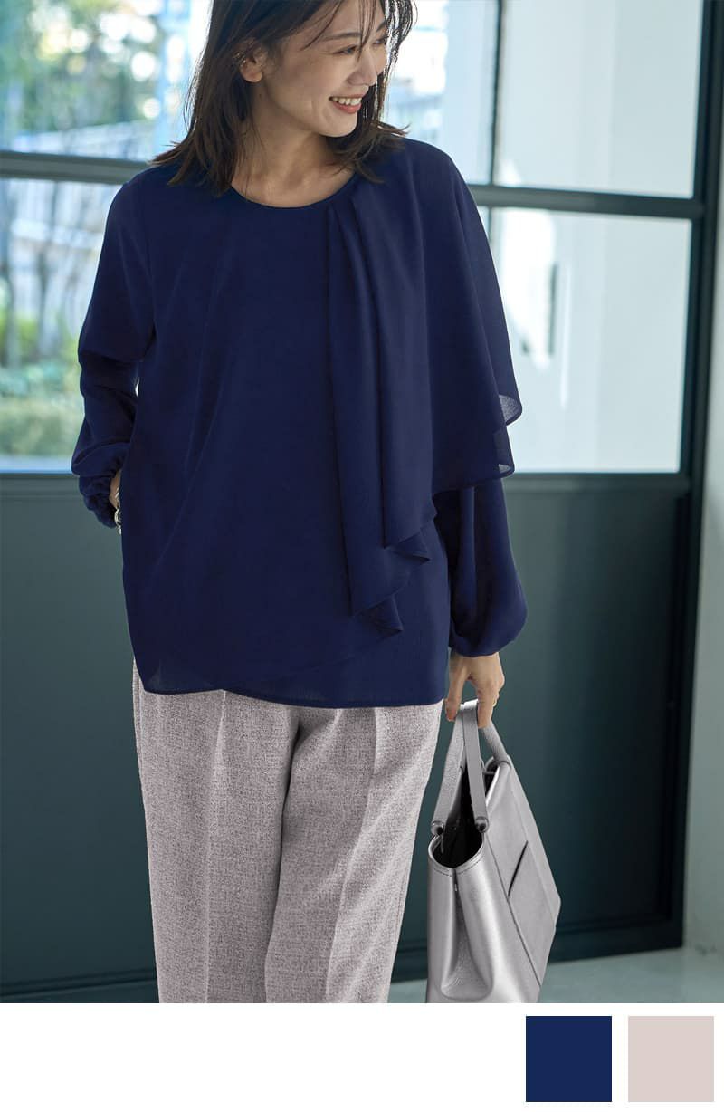 【LUXE】縦シボ片側ケープブラウス