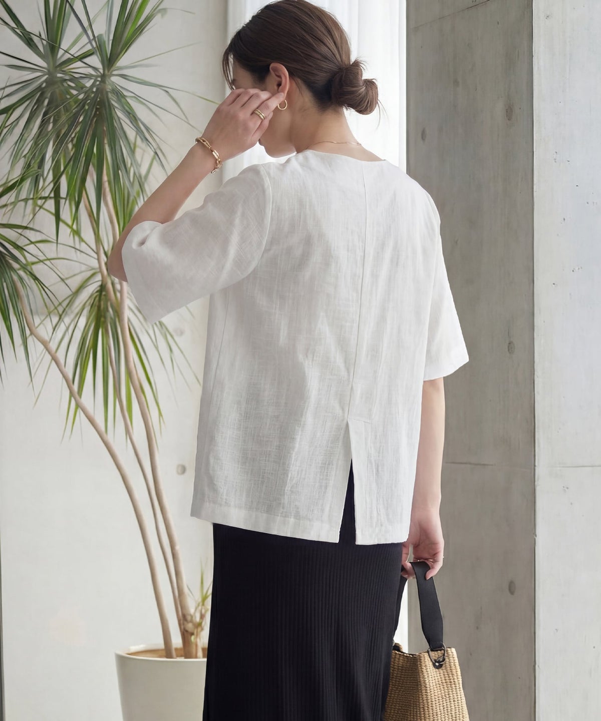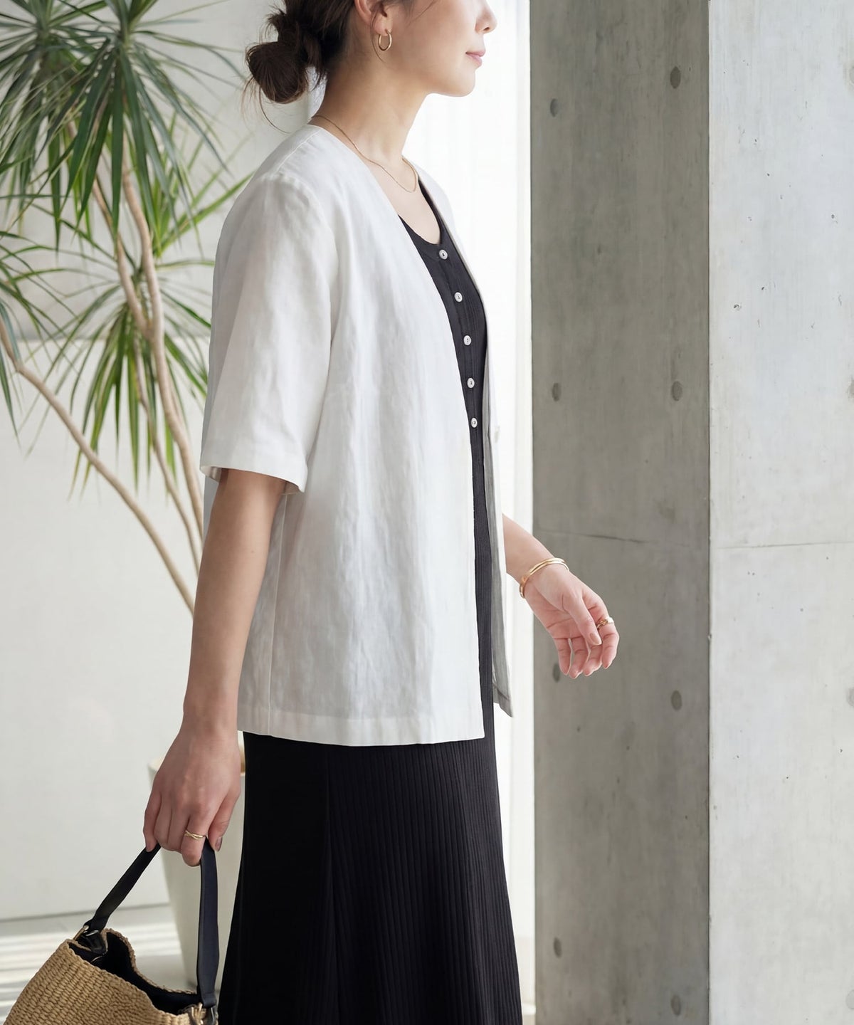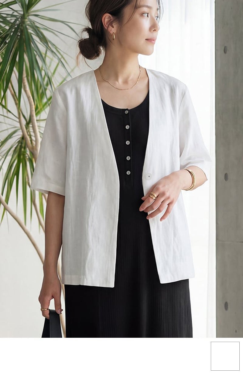 綿麻ノーカラー半袖ジャケット