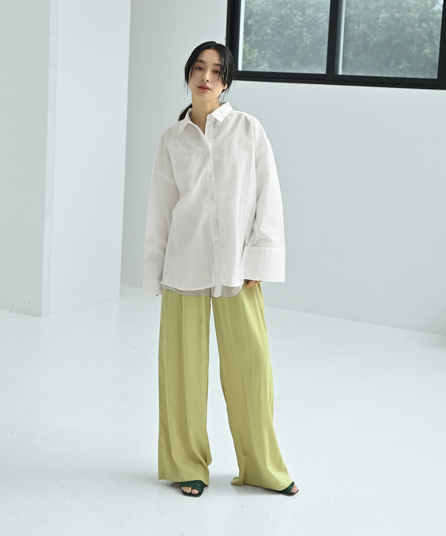 =ただの白シャツで終わらせない。レイヤードで差がつくデザインシャツ=オフホワイトのシャツにチュールを重ねた、一見シンプルで差がつくレイヤードデザイン。動くたびに奥行きが生まれ、さりげなく印象に残ります。身幅にゆとりを持たせた縦落ちシルエットで、体のラインを拾わずすっきり。高身長さんやLサイズ以上の方も、余裕をもって着られる一枚です。ブロードのきちんと感とチュールの軽さを両立し、一枚でも羽織でも活躍。白シャツはもう持っている方にこそ選んでほしい、大人のための更新系ベーシック。[こんな方におすすめ]・可愛いより、ハンサムな服が好き・体型はカバーしたいが、ルーズは避けたい・ベーシックだけど、少しだけ差をつけたい・高身長/肩幅/体格に余裕のあるシャツを探している・オンオフ兼用できるトップスが欲しい[スタイリング提案]・黒スラックス×フラットシューズで大人モード・ワイドパンツ合わせで抜け感のあるハンサムスタイル・Iラインスカートで女性らしさをプラス・寒暖差のある時期は、薄手ニットを中にレイヤードしても◎[商品について][着用時期]:春・秋(重ね着で初冬まで)[伸縮性]:なし[生地の厚み]:やや薄手(シャツ地+チュール)[透け感]:あり(チュール部分)[光沢感]:なし[裏地]:なし[手洗い可][お色について]オフホワイト:黄みを抑えた、クリーンでニュートラルなホワイト。チュールの重なりが柔らかさを加え、白でもきつく見えない大人仕様の色味です。[お知らせ事項] 海外縫製商品のため、縫い目や糸処理にわずかな個体差が見られる場合がございます。いずれも着用には問題なく、品質基準を満たしたもののみをお届けしております。実際にお召しいただくと、シルエット・デザイン性のバランスの良さをご実感いただけます。