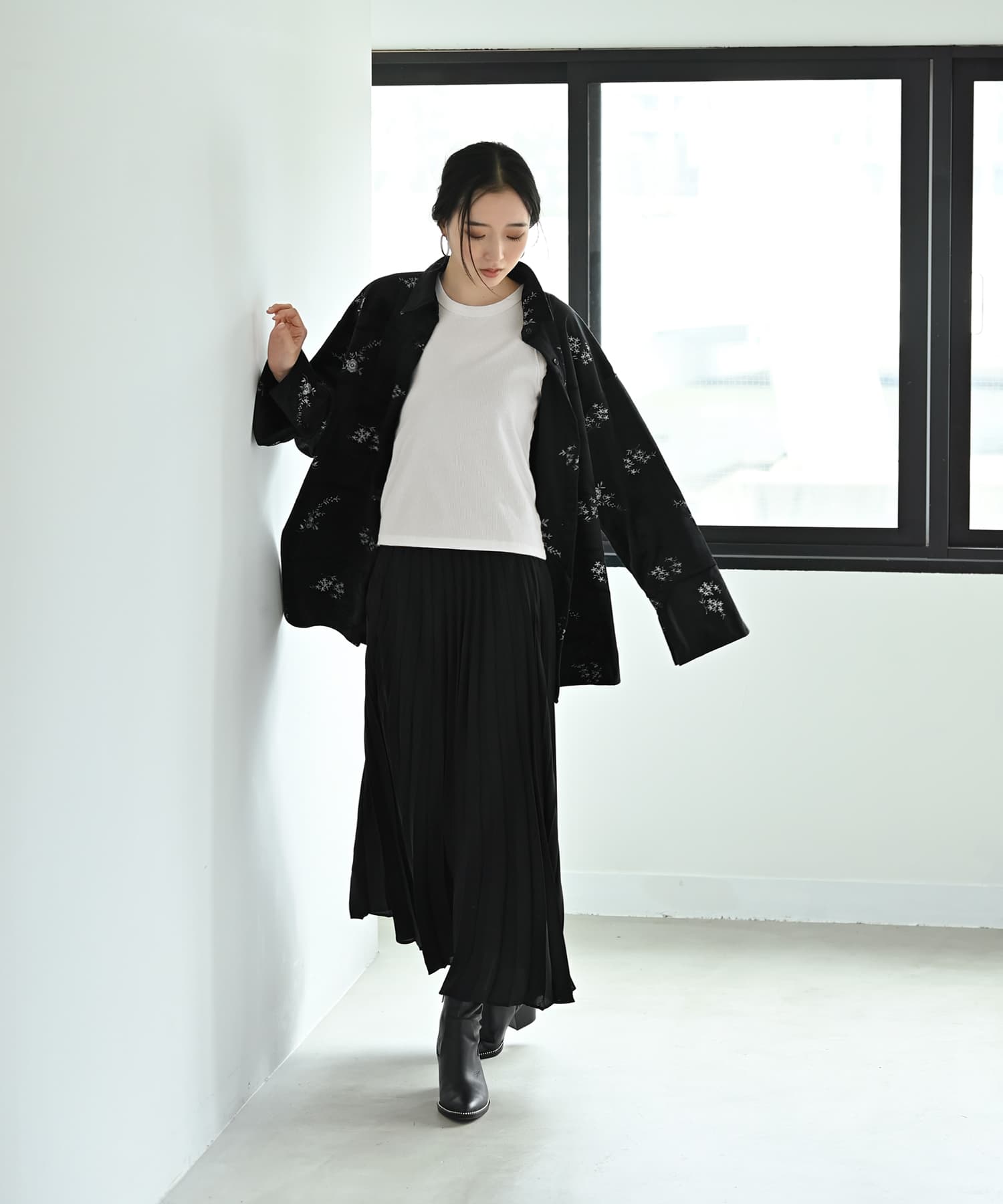 =上品さと特別感を両立した、主役級シャツ=ベロア生地に繊細な花柄刺繍をあしらった、他にはない存在感のあるシャツをセレクトいたしました。羽織るだけで印象が変わる、ワードローブに1枚あると頼れるアイテムです。ヒップが隠れる丈感で、程よくゆとりのあるシルエットはLサイズや肩まわりしっかりめの方にもおすすめです。単品でさらりと着るだけで、上品かつモードな印象を演出でき、ジャケットやカーディガンとのレイヤードも楽しめます。【こんな方におすすめ】・人と被らないデザインを楽しみたい方・高身長で丈感が気になる方・ゆとりがありつつスッキリ見えるトップスを探している方・単品で着回しを楽しみたい方【セット販売はこちら】850190[SET]【BLK001】フラワーエンブロイダリーシャツ×パンツ【商品特徴】・繊細なフラワー刺繍を施した上質感あるデザイン・ヒップが隠れる丈感で体型カバーにもOK・ゆったりシルエットでリラックス感がありながらも上品見え・単品使いでもコーディネートしやすく、ボトムスを選ばない万能トップス【素材について】・ポリエステル100%/刺繍部分:ポリエステル100%・伸縮性なしでも程よく柔らかい生地感・軽やかでオールシーズン活躍できる素材(夏はお好み)【おすすめコーディネート】・デニムや無地ボトムと合わせてカジュアルに・ジャケットなどのインナーとして上品に・アクセサリーや小物でモード感をプラス【商品の詳細】◆着用時期:春・秋・冬(インナー次第で通年対応)◆サイズ感:Lサイズ・高身長の方にも安心のゆとりあり◆厚み:中肉◆柔らかさ:程よくしなやか◆光沢感:僅かにあり◆伸縮性:なし◆裏地:なし◆洗濯:不可(ドライクリーニングをおすすめいたします)【お色について】ブラック:フラワー刺繍が映える深みのあるブラック。上品でモードな印象を引き立て、着るだけでコーデが完成する存在感のあるカラーです。【お知らせ事項】こちらの商品は、できる限りお求めやすい価格でご提供するため、海外縫製基準を採用しております。そのため、糸の処理や縫製の一部に多少の粗さが見られる場合がございますが、着用に支障のあるものではございません。また、わずかなほつれや軽微な非対称性が生じる場合もございますが、いずれも品質上の問題はなく、安心してご着用いただけます。実際にお召しいただくと、価格以上のデザイン性と仕上がりの良さを感じていただけるアイテムです。