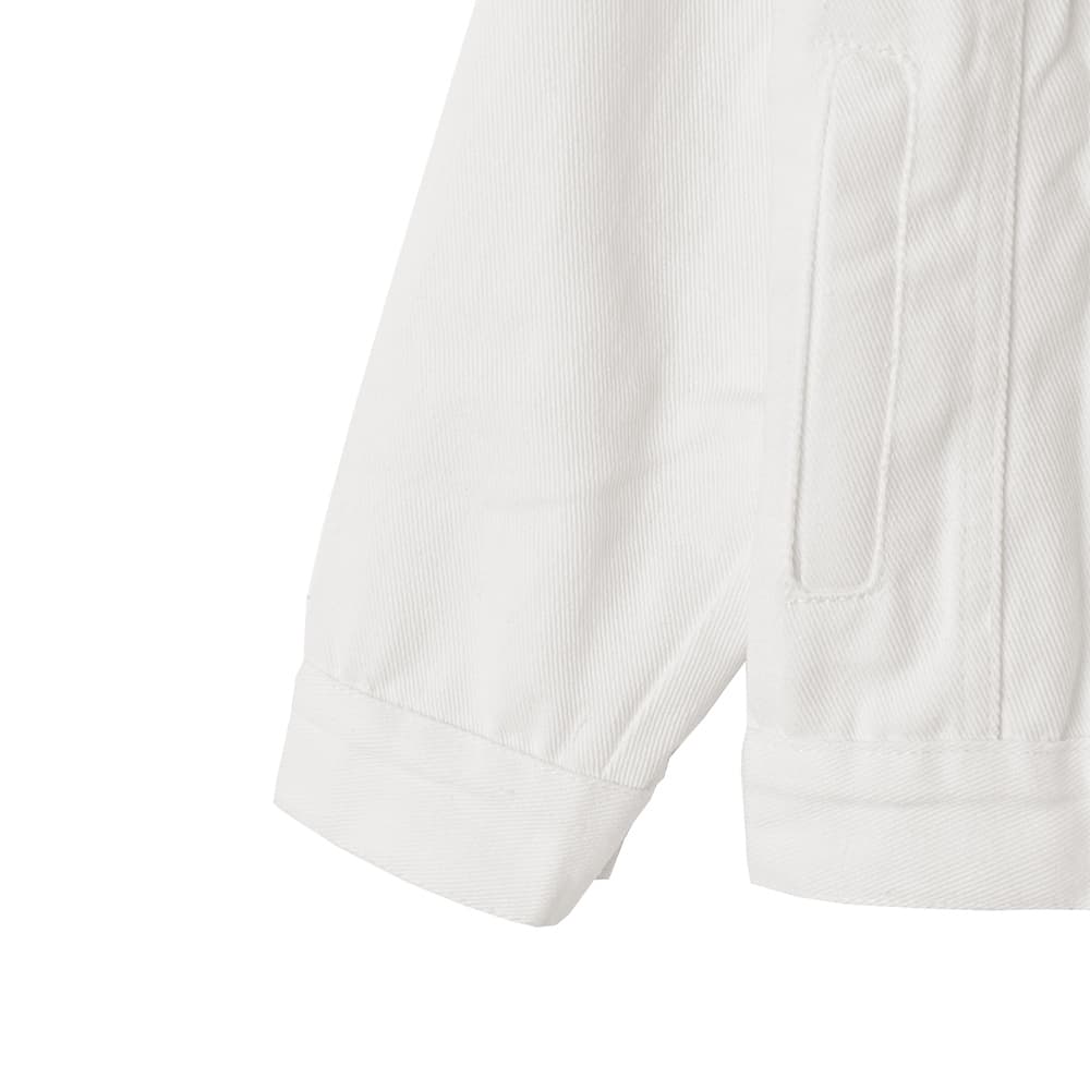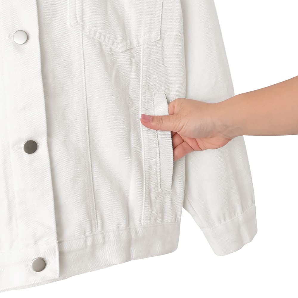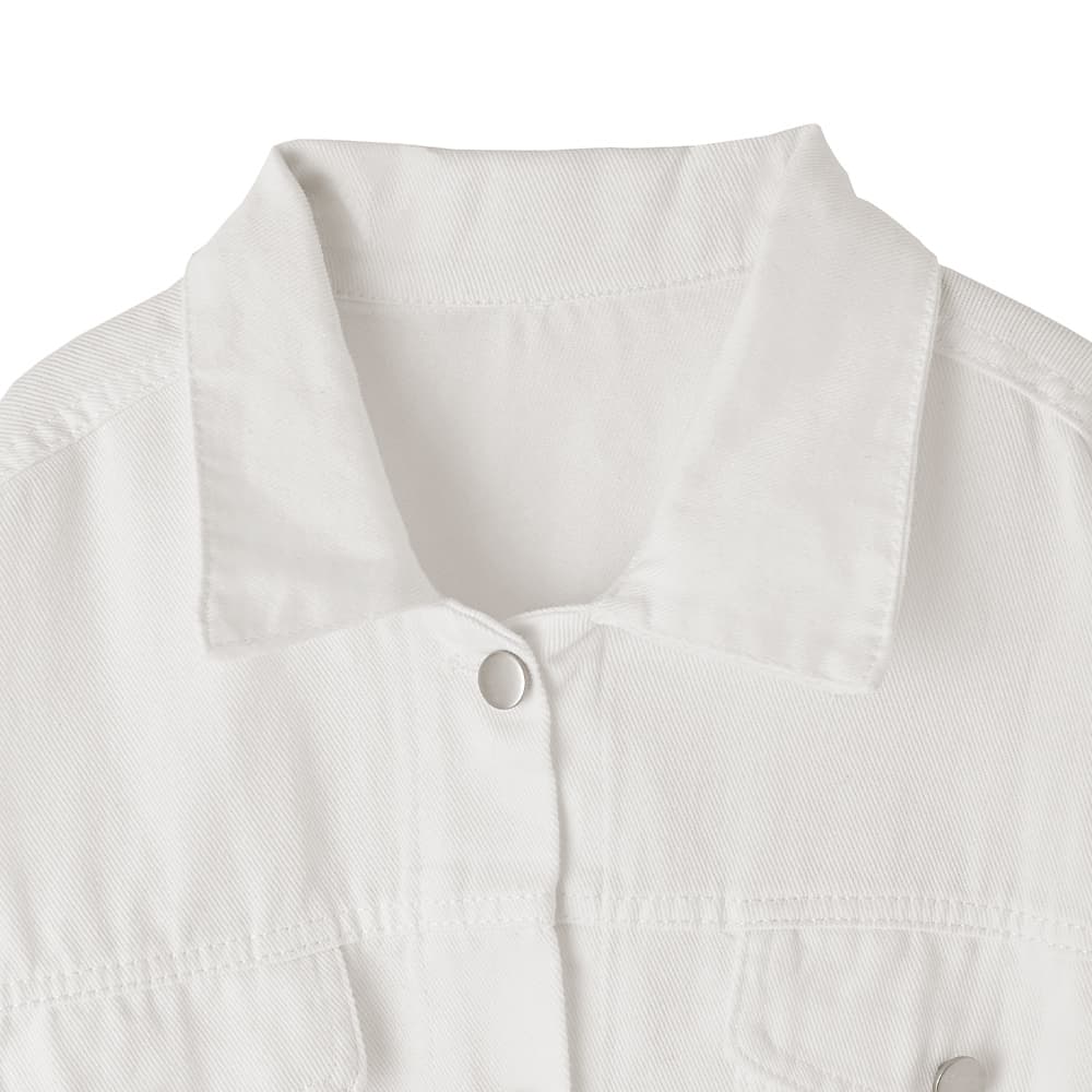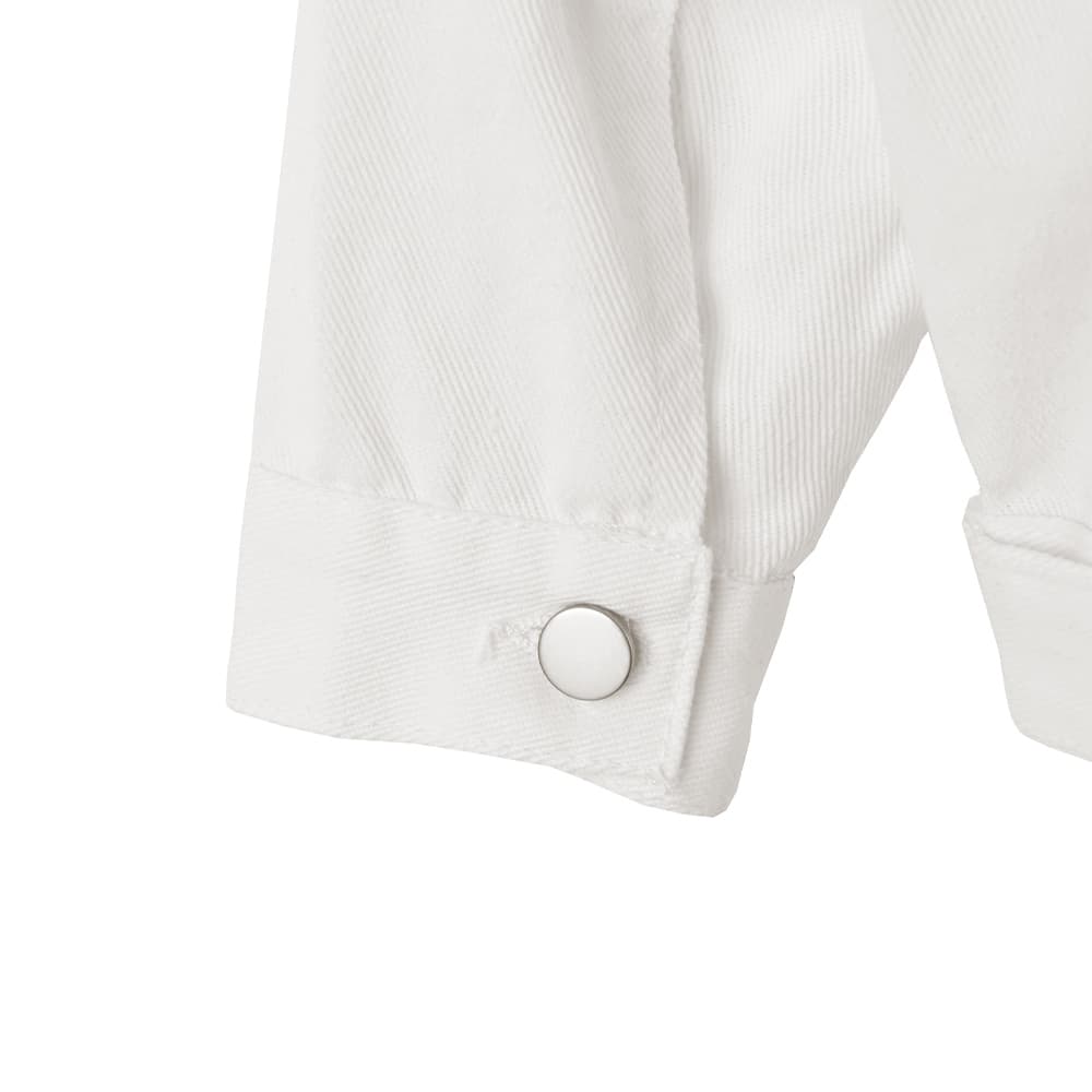 【不良品以外の返品・交換不可商品となります】訳ありにつきスペシャル価格で特別販売在庫限りで終了のホワイトデニムGジャン◆3/5インスタライブご紹介商品◆アーカイブのご視聴はこちらから→【2026/3/5ライブ】明るい季節にピッタリな、白デニムのGジャン型ジャケット。汚れが気になる白なので7,900円くらいのチャレンジしやすい価格での販売を目指していましたが、出来上がりましたら全量が検品落ちするという『白生地あるある』が発生。ただし細かなことを気にしなければぜんぜん普通に着れますし、もちろんカワイイので廃棄することなどとてもできず…ご理解をいただける方に向けて、3,000円というスペシャルプライスでご紹介させていただきます。◆検品落ちの理由:おもに点状の汚れ/事例を着用画像の最後尾に3枚載せています。黄色いテープは『ここだよ』の印です。◆こちらは追加生産がありません。在庫限りで販売終了となります。◆恐れ入りますが返品・交換の対象外商品となります。◆3/13、3/14に開催中のご試着会会場でも販売しています。こちらはご試着会にご来場いただけない方のために、WEB用にご用意した在庫になります。【商品の特徴】◆Gジャンの中では生地が薄めで軽やかな着心地です。しっかりとしたシャツジャケットのような厚みで、暖かさはそれほど強くありません。◆きちんとキレイに作るとユニフォーム感が出てしまうので、敢えてラフな縫製を採用しています。糸の飛び出しなどはそのままにして着ることを想定していますが、お好みで気になる場合はハサミでカットしてしまっても大丈夫です。◆適度なゆったり感はありますが、そこまで大きい感じでもありません。Lサイズ体型の方は裾部分のボタンを留めると腹部が窮屈な場合もあるかもしれませんが、閉じなければ問題はなく、Gジャンの裾を閉じることはあまり無いので大丈夫だと思います。胸囲や肩周りはゆったりとしています。【その他仕様などの情報】◆色:普通の白/イエロー味なし/クリアなホワイト◆サイズ感:定番的なよくあるサイズ感のGジャンという感じ◆丈感:前は脚の付け根が隠れる丈感/背面はヒップが半分以上隠れる長さ◆シルエット:ストレート◆首元:ステンカラー◆肩幅:問わないタイプ(ドロップショルダー)◆アームホール:普通(とくに狭くも広くもない一般的な開き加減)◆袖幅:普通◆袖丈:長袖(手の甲が隠れる長さ)◆袖口:生地の切替&ボタン1個あり◆袖のたくし上げ:ボタンを開ければ可能◆厚み:Gジャンの中では薄め◆柔らかさ:ハリ感の中に柔らかさもあり◆肌触り:コットン生地特有のサッパリと乾いた感じ◆着用ジワ:多少はできる◆毛羽立ち:基本的にできない◆伸縮性:ごく微量にあり(織り組織的なもの/素材的には無し)◆光沢感:なし◆透け感:気にならない◆スリット:なし◆ポケット:両胸およびボディの両端に計4つあり◆着脱:フロントボタン開き◆ボタン:ツヤ消しシルバー◆裏地:なし◆手洗い:可能◆アイロン:不要だが、かけると見た目はさらに良くなる(霧吹きも有効)◆スチーマー:使用OK◆シワ備考:霧吹きでよく湿らせてから手指でシワを伸ばし、ハンガーに掛けておけばイイ感じになります。【お客様へのお願い】 メルカリ等、個人および法人販売サイトにおける転売目的でのご購入は、ご遠慮いただきますようお願いいたします。