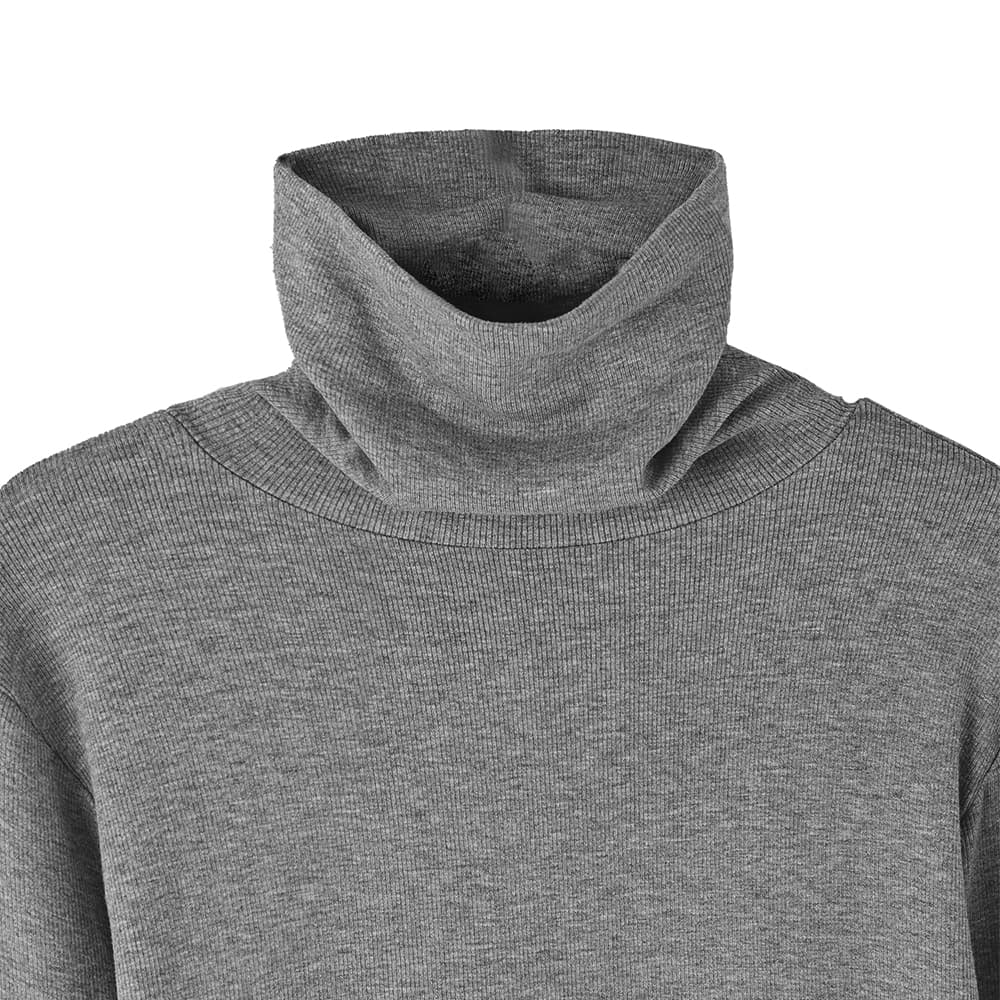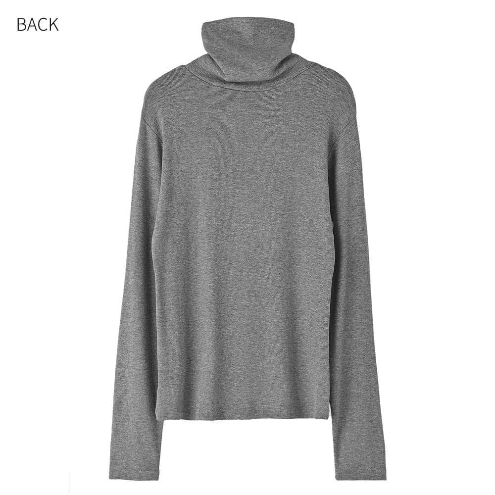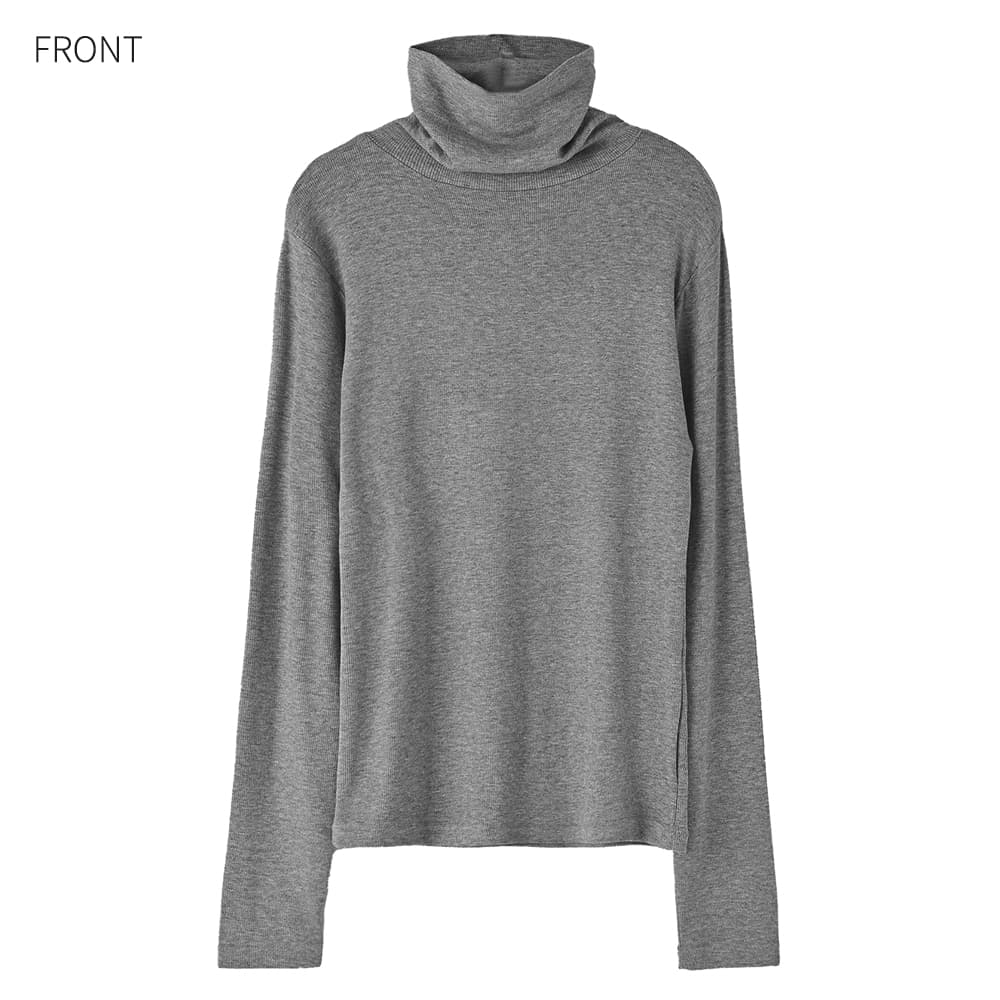首周りに長さ(高さ)のあるタイプ。首をくしゅくしゅさせても折り返しても着ることができます。この生地の特性で首への締め付け感がまったく無く、通常のタートルネックよりもストレスが大幅に軽減されます。アゴ下まで高さを伸ばせますが、肌が少し見える高さに下げることも可能。普通のタートルはダメだけどコレは大丈夫!というお声をたくさんいただいています。
