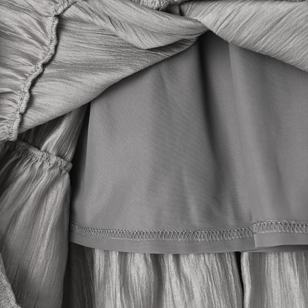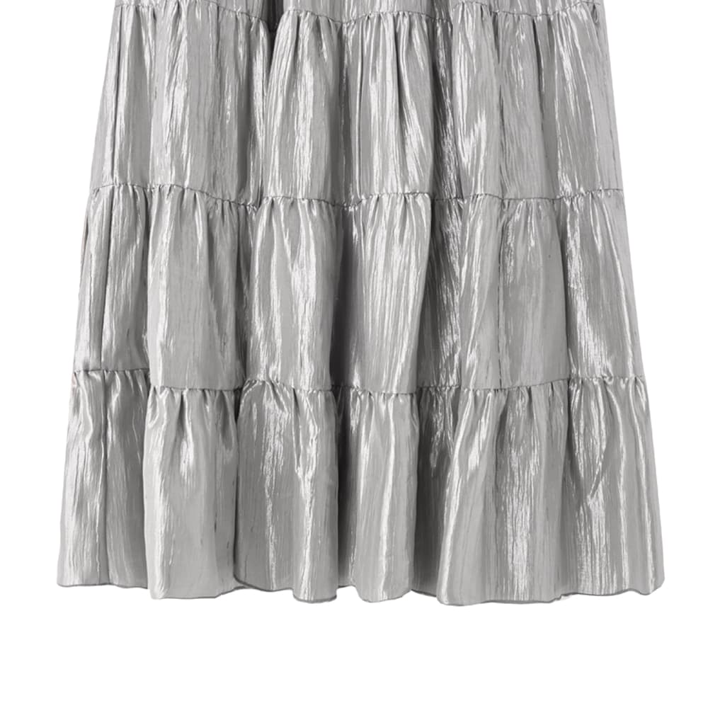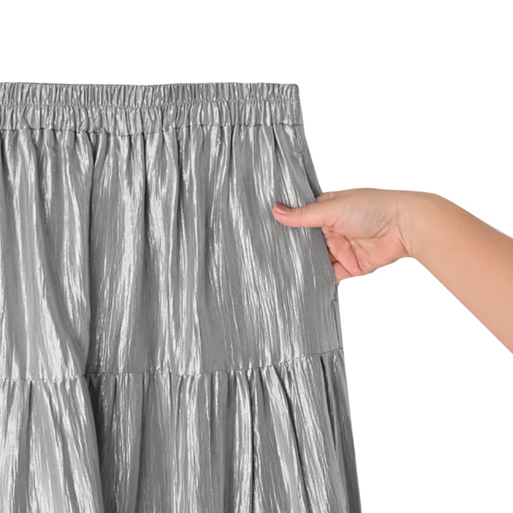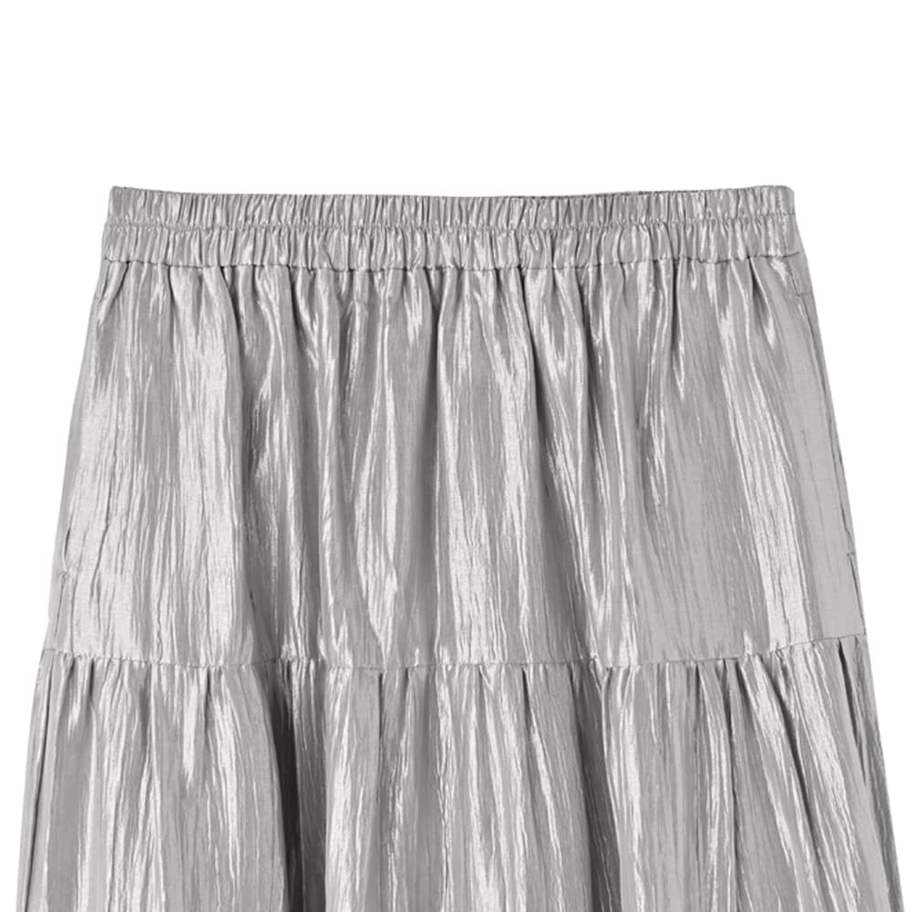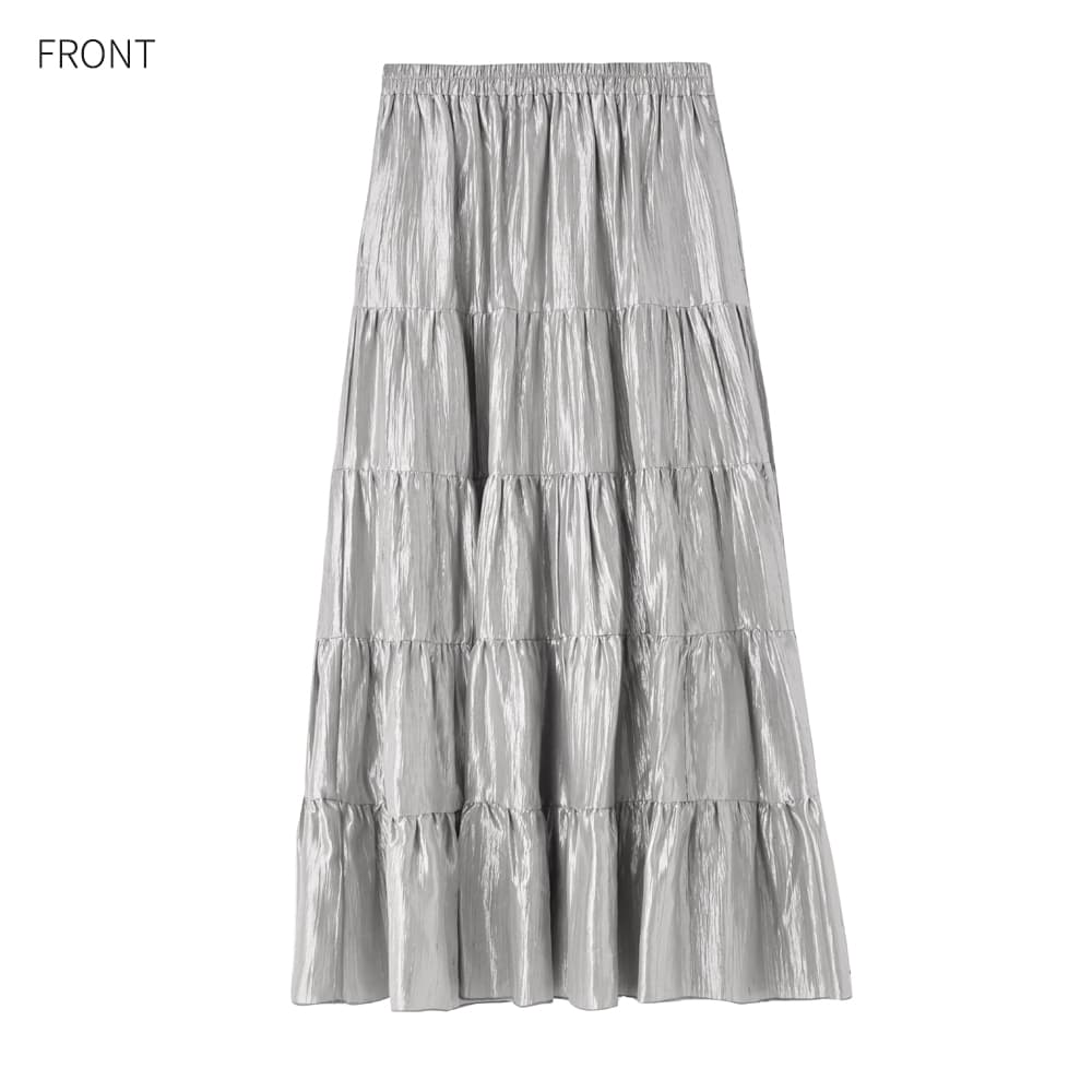冬の街に映えるドラマティカルなデザイン素材が素敵な2種類の生地でお作りした、冬に新鮮!なティアード型ロングスカート◆11/6インスタライブご紹介商品◆アーカイブのご視聴はこちらから→【11/6ライブ】【このスカートの特徴】◆冬コーデに映える素材で製作をした、ロング丈のティアードスカートシリーズ。どちらの素材も素敵だなと感じ、2種類の素材でお作りしました。こちらは表面に細かくシボ加工が入った、グロウ(艶)感のあるタイプです。※ベロア生地タイプもご用意しています。◆秋冬はあまり見かけることが無い、ティアードデザインというのが新鮮。程よいボリューム感と立体感で冬スタイルを華やかにしてくれます。◆ウエストは全周ゴムのラクな穿き心地。幅広い体型の方にご着用いただけます。全周ゴムなので穿き位置を調整することができ、丈感の心配も少ないタイプ。もう少し長く穿きたければ腰に落としたり、短くしたければウエストを折り返すかハイウエスト位置にズラして着用するなど、フレキシブルに対応できます。◆腰回りが膨らみがちなティアードスカートですが、そうならないよう細心の工夫を凝らした設計。このようなスカートの中ではトップクラスにスッキリとしている方だと思います。腰張りが気になる方も許容できる場合が殆どだと予測できますので、よろしければぜひチャレンジなさってみてください。◆冬スカートの中では暖かな穿き心地。グロウタイプは見た目の季節感を限定する素材ではないため、ご自身が暑いと感じるまでは使用することができます。寒い場合はレギンスやタイツ、ロングコートでお尻や脚を隠すなどして調節してください。◆ニット類やジャケット、ゆったりカーディガンやパーカーや長袖Tシャツといった、基本的なトップスとは大体組み合わせることができます。デザイン性が高いものとの相性も良く、意外にもうるさくならずに共存できます。※11/8の公式ブログにてプロデューサーの齊藤が着こなしを紹介しておりますので、イメージを掴むご参考になさってください。ブログはこちらから→11/8公式ブログ【さらにプラス情報】◆シワ:元々シワ加工入りなので気になりません。◆光沢感:ピカピカと光る感じではなく、艶がある感じです。サテンのように全面が光沢するのではなく、シボ加工により変則的な光沢になるため悪目立ちはせず、ツヤ感は感じますがヘンな派手さはありません。程度の概念としては、エナメル素材のバッグや靴くらいにお考えください(=光っていることは一目瞭然で存在感もあるけど、それが別に派手過ぎる感じでもない。というイメージ)。◆重さ:比較的軽量です。◆薄さ:生地自体は割と薄手ですが、生地の使用量が多いため重なる部分が多く、薄さや寒さは気になりません。◆音:音が生じるようなシャカシャカ系の生地ではなく、柔らかくしなやかな生地で無音です。◆ゴム:締め付けは特に強くなく、ユルユルな感じでもありません(ちょうど良く快適な感じ)。ゴムがひっくり返らない仕様にしています。◆静電気:とくに発生しやすい生地ではありませんが、その方の帯電体質具合や合わせアイテムなどに加え、冬場は乾燥でどうしても…というところはありますので、もしも気になる場合はエレガードなどの静電気防止スプレー等でご対処ください。◆シューズ:ブーツでもスニーカーでも合います。 【それぞれのスカートの特徴比較】デザインやサイズ感は同じです。◆暖かさ:グロウタイプも寒くはないが、ベロア生地タイプの方がより暖かい◆厚み:ベロア生地の方が厚い◆重さ:ベロア生地の方が重い◆着用可能シーズン:グロウタイプの方が長い(グロウタイプ=10-6月が目安/ベロアタイプ=10-3月が目安)◆シワ:どちらもなりにくい◆存在感:どちらも素材的に存在感がある(華やかさは変わらない)◆キレイめ感:どちらかといえばグロウタイプの方がキレイめ感があるが、そこまでの大きな差はなし◆使いやすさや着回しやすさ:大差が無い。ベロアタイプは同じベロア系やコーデュロイ系などの同系統質感のものとは合わせづらい◆選ぶ基準:素材的な好み(使い分けなどはとくに無し)【その他の仕様などの情報】◆着用時期:10-6月(真夏以外が目安)◆サイズ感:ゆとりのあるサイズ感(Lサイズ体型にも対応)◆丈感:足首が隠れる丈感が基準◆シルエット:ティアードタイプのフレア◆ウエスト:全周ゴム◆ウエスト調節機能:なし◆ベルトループ:なし◆柔らかさ:柔らかさの中にハリ感が共存◆肌触り:サラッとして柔らかい感じ◆着用ジワ:基本的にできない◆毛羽立ち:基本的にできない◆伸縮性:なし◆光沢感:あり◆透け感:生地にはあるが裏地があるため下着は透けない◆スリット:なし◆ボタンやファスナー:なし(下から穿き上げタイプ)◆ポケット:両サイドにあり◆裏地:あり(膝丈くらいの位置まで)◆手洗い:可能◆裾上げ:構造的には可能だが、ティアードのデザインバランス的に難しい◆アイロン:不要◆スチーマー:使