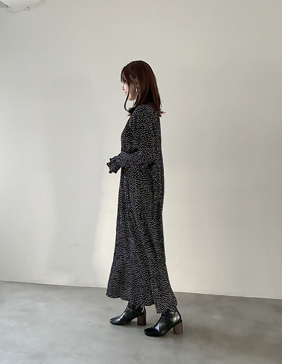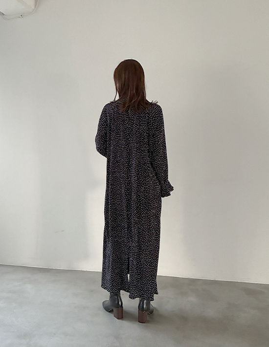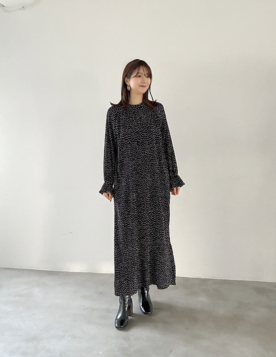 羽織ったり重ねたりがしやすい形が新鮮甘くならない大人のドット柄ワンピース◆12/18インスタライブご紹介商品◆アーカイブのご視聴はこちらから→【2025/12/18ライブ】ーいつものデリより生地やデザインに凝った、ワンランク上のLUXE(ラグゼ)ライン。【このワンピースの概要】お客様人気の高い楊柳生地の冬バージョンを使用した、ランダムドット柄の新感覚ワンピース。重ね着がすっかり定番と化した昨今の着こなし事情に即して、『重ねる』ことを前提としたフォルムにこだわりを入れたところが新感覚になります。といいますのも→ワンピースをそのまま一枚で着るよりも、『何かを羽織る』『何かと重ねる』状態で着る方が多い傾向に着目。であれば、それがしやすいように重ね着のしやすいように作ろう!と考え、生まれたのがこのワンピースになります。◆羽織る:ジャケット、ニットガウン、カーディガン全般、室内対応ブルゾンなど◆重ねる:ベスト系、ジレ系、ビスチェ、オーバーサイズニットなどさらにウエストマークを望まれる方も多いので、ベルトをした時にカッコよくなるフォルムであることにもこだわっています。【このワンピースの特徴】◆甘さが無い雰囲気であることも重視したポイント。ドット柄を大人っぽく着ることができます。◆重ね着がしやすいストンとしたストレートシルエット。一枚で着る場合はベルトでウエストマークをするのがお薦めです。◆ゆったりとしたサイズ感ながらも、大きくならないフォルムになっています。◆ギャザーなどはなく、生地のシボ感が縦方向の動きや陰影を作ります。◆袖口からドットのチラ見せなども楽しめる、やや長めの袖丈。その際に見栄えが良いよう、袖口は控えめなフレアになっています。◆袖口上にはゴムを入れて、たくし上げが簡単&カワイイ形になるよう設計。ゴムが手首位置にあるときはフィットしない(=締め付け感の無い)快適な締め加減にしています。◆首元はあらゆるものと重ねてバランスが良い、クルーネック型のバンドカラー。長い髪を下ろしていてもスッキリと見えるデザインです。◆腹部や腰張り、背中の肉感やヒップなどが目立ちづらいよう設計しています。◆お色は通常のブラック地に白いドット柄です。【生地について】オシャレに見えて肉感を拾わず、家で洗えてシワにならずでお手入れがラクなことから人気の楊柳(ようりゅう)生地を使用しています。◆楊柳生地の中では厚地でしっかり感があるタイプ。◆さらに裏地を付けることで、冬対応仕様に製作。◆季節感を問う生地ではないため、春先も着用可能。◆表面にタテ方向の凹凸シボ感を持つ、表面感のある生地。◆凹凸により肉感カバー効果が高く、気楽に着れると人気。◆手洗い可能でアイロン不要なシワが気にならない生地。◆質感劣化がおこりにくい素材。◆サラッとして肌離れが良く、柔らかさとハリ感が共存。◆裏地はサラッとして滑らかな伸縮素材。◆【LUXE】楊柳スモールドット柄プリーツパンツ(商品番号236047)と同じ生地を使用。【さらにプラス情報】◆暖かさ:ポリエステル素材のブラウス生地系ワンピースとしてはかなり暖かい方です。とはいえ真冬に一枚では寒さがあるため、ジャケットやカーディガン、ニットガウンなどと重ね着をして着用します。◆サイズ感:ゆったりとしていますが、生地の特性により大きなシルエットにはなりません。Lサイズ体型の方にも余裕をもってご着用いただけます。◆丈感:02サイズは目安として164-165cm以上の方にお薦めです。ほど良くブーツが見えた方が、全身バランス的にイイ感じ&細く見える傾向にあります。ベルトをするのであれば多少のブラウジングも可能です。◆静電気:程度の差はその方の帯電体質具合や合わせアイテムなどによりますが、冬場は乾燥でどうしても…というところはありますので、気になる場合はエレガードなどの静電気防止スプレー等でご対処ください。タイツ着用の場合はワンピースを着る前に、タイツの脚全体にスプレーをするとかなり快適です。それが冷たくて嫌な場合はワンピースの生地を裏返し、裏地に万遍なくスプレーをしておくのもお薦めです。◆その他:全身バランスを重視したワンピースになりますので、ご試着をした際になんか似合わないかも…と感じた際は、一度靴まで履いてから離れて全身を見るのがお薦めです(裸足だとバランスがとりにくいためです)。できれば重ね着やベルト装着、ヘアメイクもした状態がベターです。◆姉妹商品:同じ生地でワイドパンツもご用意しています。→商品番号236047【LUXE】楊柳スモールドット柄プリーツパンツ【その他の仕様などの情報】◆着用時期:10-4月頃が目安◆サイズ感:ゆったりめのサイズ感(Lサイズ体型にも対応)◆丈感:長め◆シルエット:ストレート◆ベルトループ:なし◆首元:バンドカラー/クルーネック◆肩幅:問わないタイプ(ラグランスリーブ)◆アームホール:広め◆袖幅:やや広め◆袖丈:長袖(手の甲が隠れる