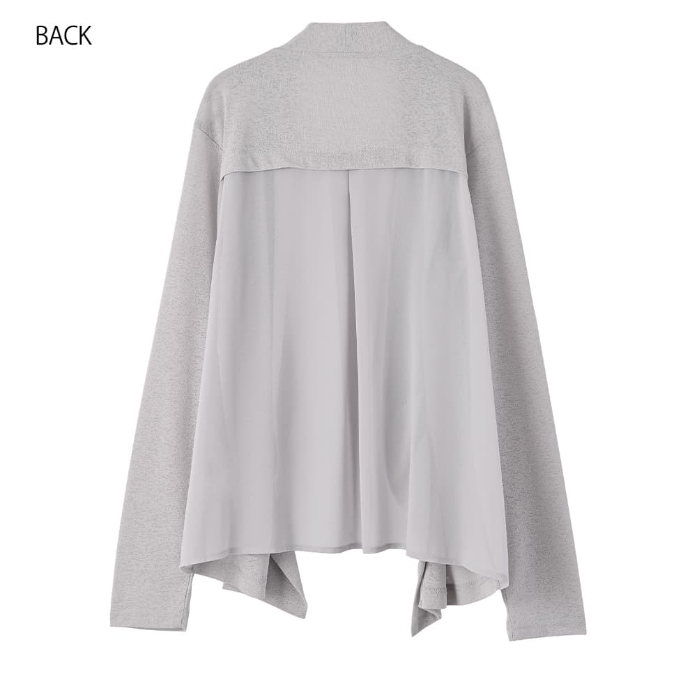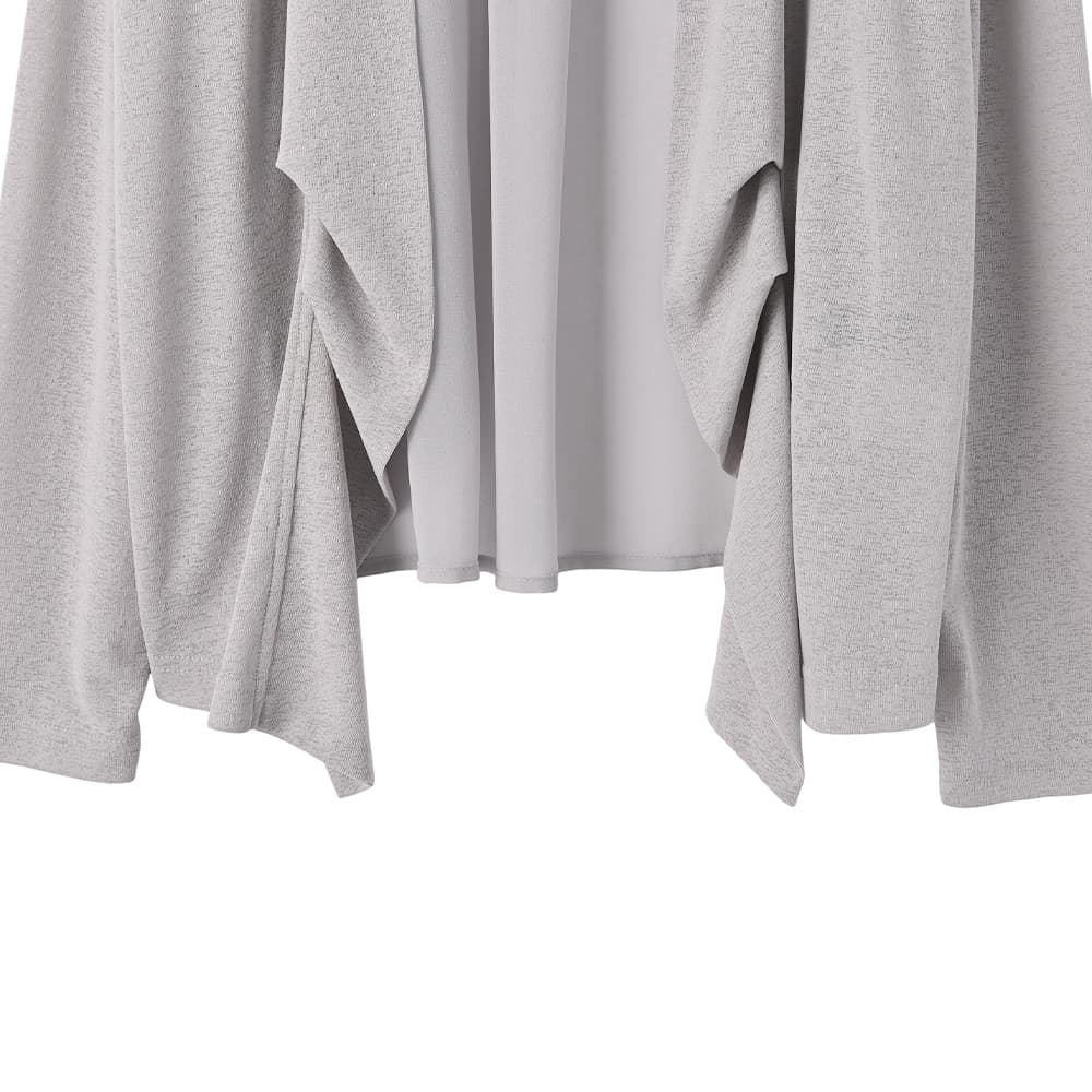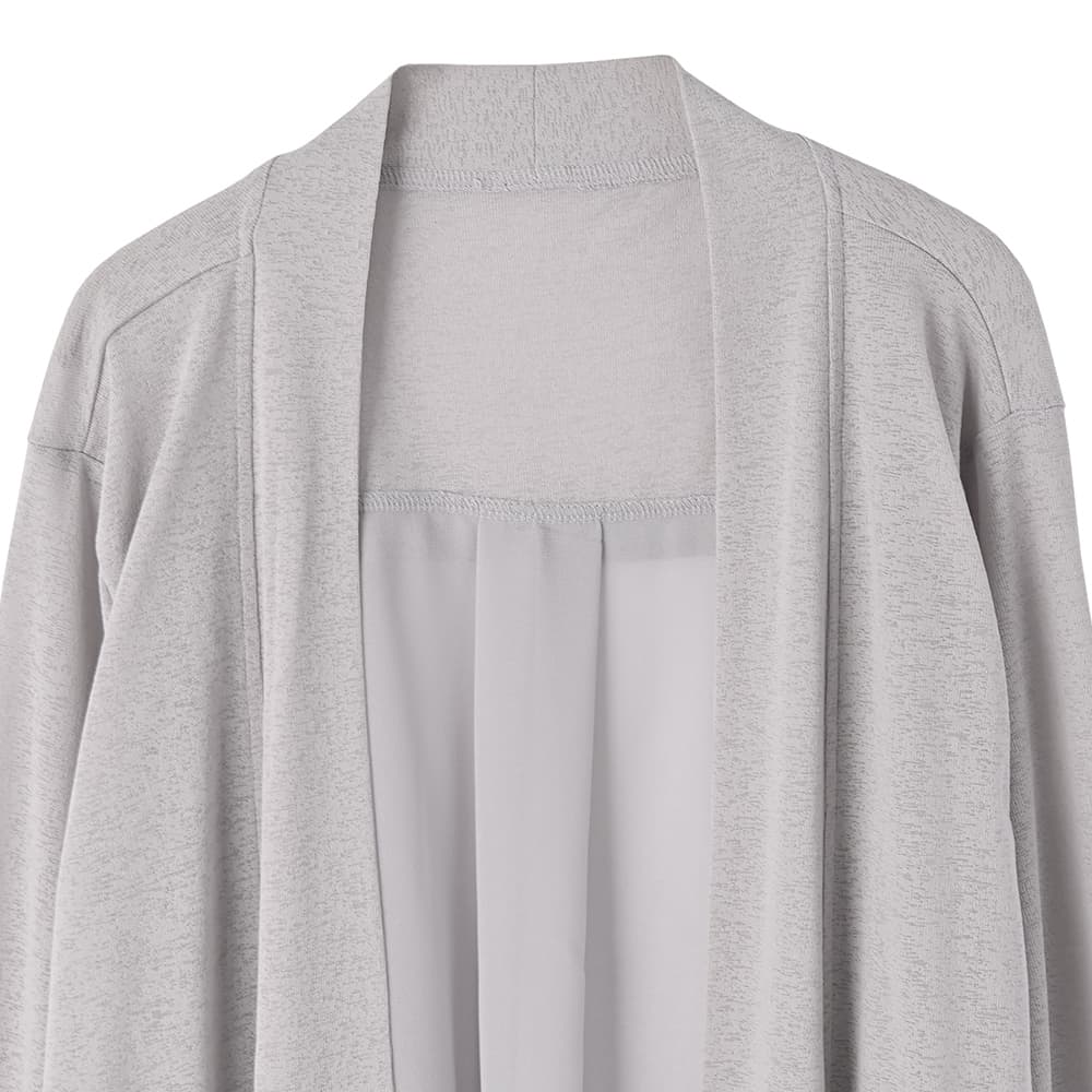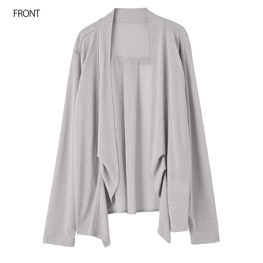 サラサラの限界を超えたサラサラ感!とても薄いのにハリ感もあって美しい背面がシフォンの涼しさ特級カーデ【selectionシリーズが始動】国内のメジャーな大人ブランドやショップのアイテム制作を手掛けている、老舗メーカーさんが企画生産するアイテムをSTYLE DELI視点でセレクトしたnewシリーズ。ネットショップならではの買いやすい価格帯とは少し異なりますが、優れた品質で大人に相応しい雰囲気を持つアイテムを好む方に向けてご用意したシリーズです。その中でも、店頭で試着をしなくても失敗しにくく、着やすくてお薦めできるもの・高額過ぎないものを厳選。そうすることでオシャレの幅が広がって良いかなと考えましたので、STYLE DELIのアイテムとMIXして、大人ならではのオシャレをお楽しみいただければと思います。※こちらはセレクト商品になりますので、STYLE DELIのネームタグは付いておりません。また、他店や他ブランドでも取り扱いがあることがございます。【このカーディガンの概要】背面の生地がシフォンになっている、素材MIXのトッパー型カーディガン。ニット部分は非常に細い糸で編まれており、ちょっと他では見かけないほどにキメが細かな美しい質感になっています。例えればタイツやストッキングのようなキメの細かさなのですが、それらとは段違いの高級感があるのはもちろん、もっとなめらかで・もっとパウダリーで、肌の一部となるような新感覚の肌触り。フワリと背面を飾るシフォンの質感にも品があり、実物を見られたときにきっと「ステキ…!」と感じていただけると思います。【この商品の特徴】◆アイテム:気温が高い時期に、ちょっとした寒さ避けになるようなカーディガン。涼しさもそれなりにあるので、夏に長袖を着たい方にもお薦めです。◆温度感:極薄のサマーストールを腕にくるんと巻きつけたときを想像していただいて、そのときに感じるような温度感。涼しいけど寒さ避けにはなる、みたいなイメージです。◆サイズ感:一般的なMサイズのカーディガン。その方の体型に合わせて、自然なゆるフィット感とふんわり感が箇所によりミックスされる感じです。ニットなので伸びますから、市販のMサイズカーディガンが着れる方なら問題はないと思います。◆雰囲気:大人の女性によく合う、品がありノーブルな雰囲気。でもクールに・カッコいい感じのスタイリングにも使えるスタイリッシュさもあり、フェミニン過ぎないさじ加減が絶妙です。とにかく質感が美しいためキレイめ感があり、あまりカジュアルな感じには寄せることができません。【生地や素材について】◆肌触り:ストッキングのサラサラ感に近しいですが、そこに強いシャリ感が加わるためさらに強力。なめらかなのに肌離れが良いという、不思議な感じの素材です。◆厚み:肌の一部のように薄く、とても軽量。かなり薄いながらもシャリ感の強さでハリがあり、着ていて安心感があります。◆柔らかさ:柔らかいのですが、これまたシャリ感の効果でフニャフニャとはしないのが優秀。柔和なのに芯がある凛とした人。みたいな美しさを感じます。◆シワ:そんなに気になることは無いかと思いますが、目に付く場合はスチーマーをサッとかけると美しくなります。【デザインについて】◆全体:ボタンなどの留め具は無い、トッパー型の羽織りです。前を隠すというよりは、腕をカバーしたり露出を抑えたりしながら、肌寒さを回避するのに向いています。◆ポイント:ただのトッパーではなく、フロントに2段タックで出した立体ディテールあり。これによりジャケットのようなオシャレ感やスタイリッシュさもプラスされています。◆背面:後ろは本体と同色のシフォン生地。中央のタックによる効果でベタっと背中にはり付かず、フワリと美しいドレープや動きを作ります。◆編み地:ハイゲージという言葉では足りないほどに、キメが細かく品のある編み地。糸をところどころ抜かしてムラ感を出し、柄のように見せているオシャレな表面感です。黒はそれがあまり見えませんが、明るい2色は柄感がわかります。※ですが、それが悪目立ちすることはありません。あくまで自然に・さりげない感じです。【その他の仕様などの情報】◆着用時期:4-10月頃が目安◆サイズ感:ゆとりのあるサイズ感(Lサイズ体型にも対応)◆丈感:前は脚の付け根が隠れる丈感/背面はヒップの大部分が隠れる長さ◆シルエット:Iライン◆前留め金具など:なし◆肩幅:広め◆アームホール:普通(とくに狭くも広くもない一般的な開き加減)◆袖幅:普通◆袖丈:長袖(指の付け根が隠れる長さ)◆袖口:何もなし◆袖のたくし上げ:可能◆厚み:薄手◆柔らかさ:柔らかさとシャリ感によるハリ感が共存◆肌触り:サラサラ・シュワシュワ(=キメの細かいシャリ感)◆着用ジワ:できにくい◆毛羽立ち:できにくい◆伸縮性:あり◆光沢感:なし◆透け感:ニットはなんとなくあり/背面シフォン生地はあり◆スリット:なし◆ボタンやファスナー:なし◆ポケ