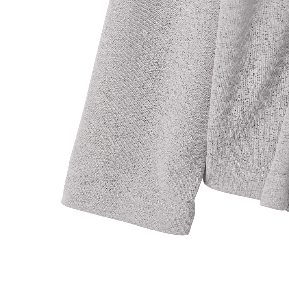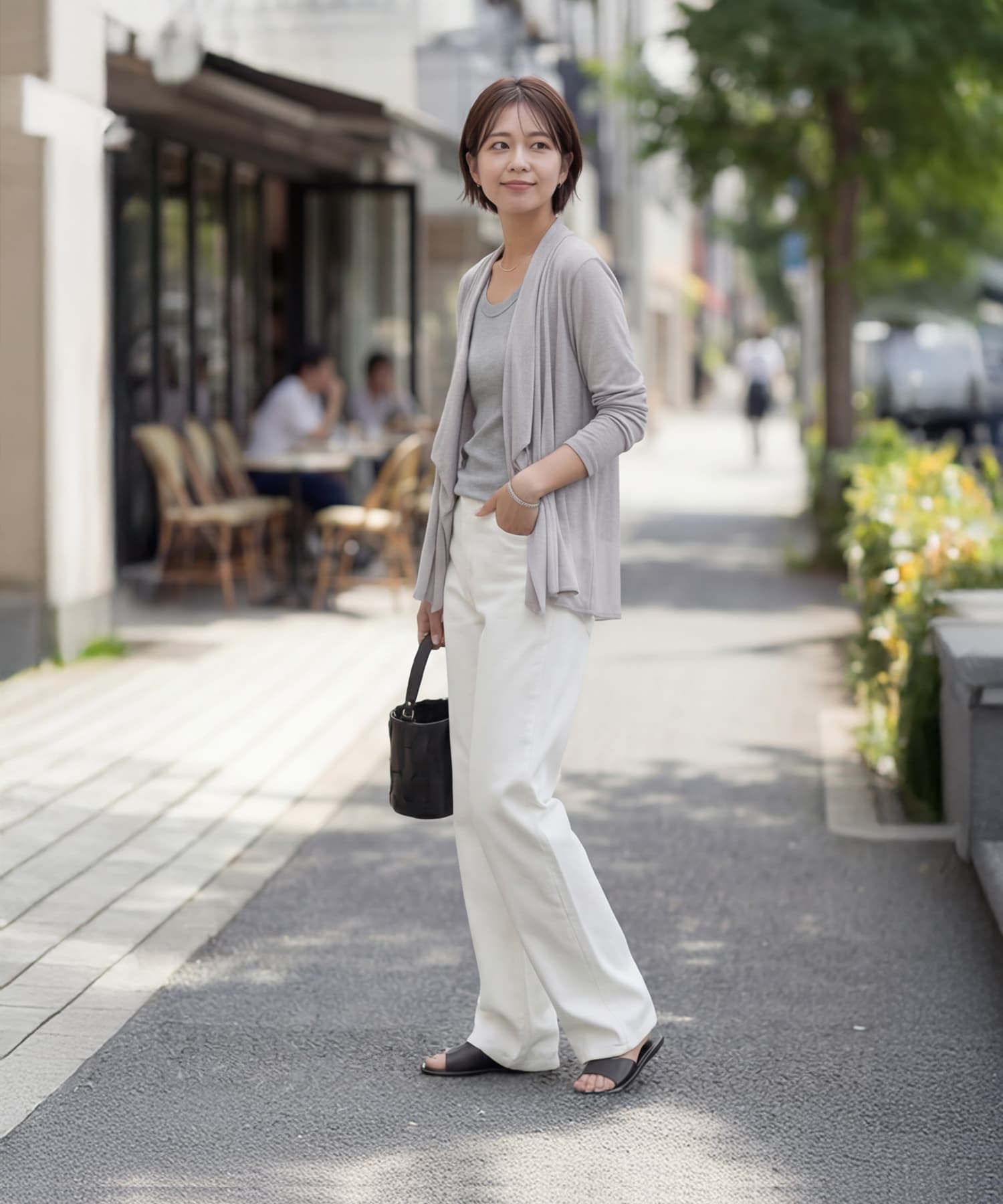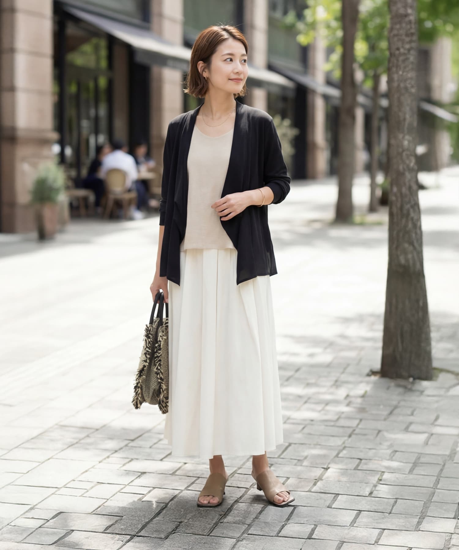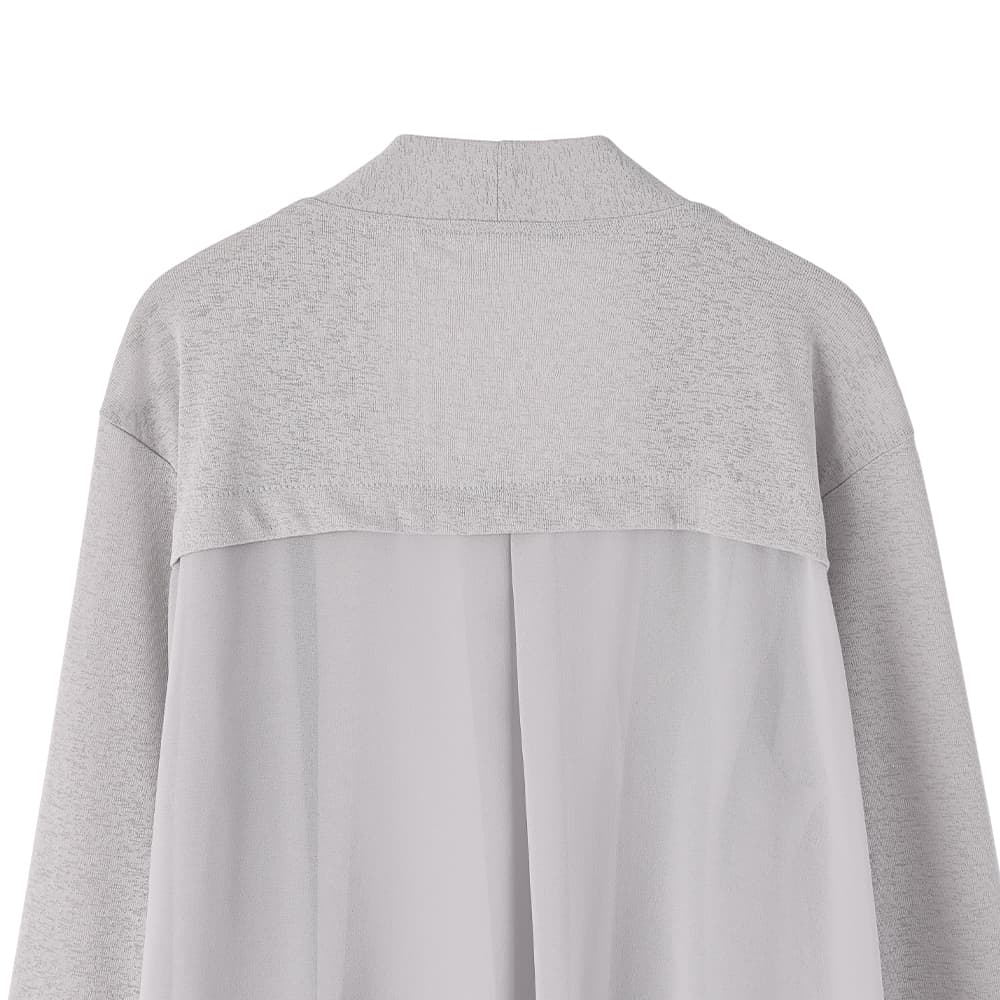 サラサラの限界を超えたサラサラ感!とても薄いのにハリ感もあって美しい背面がシフォンの涼しさ特級カーデ【selectionシリーズが始動】国内のメジャーな大人ブランドやショップのアイテム制作を手掛けている、老舗メーカーさんが企画生産するアイテムをSTYLE DELI視点でセレクトしたnewシリーズ。ネットショップならではの買いやすい価格帯とは少し異なりますが、優れた品質で大人に相応しい雰囲気を持つアイテムを好む方に向けてご用意したシリーズです。その中でも、店頭で試着をしなくても失敗しにくく、着やすくてお薦めできるもの・高額過ぎないものを厳選。そうすることでオシャレの幅が広がって良いかなと考えましたので、STYLE DELIのアイテムとMIXして、大人ならではのオシャレをお楽しみいただければと思います。※こちらはセレクト商品になりますので、STYLE DELIのネームタグは付いておりません。また、他店や他ブランドでも取り扱いがあることがございます。【このカーディガンの概要】背面の生地がシフォンになっている、素材MIXのトッパー型カーディガン。ニット部分は非常に細い糸で編まれており、ちょっと他では見かけないほどにキメが細かな美しい質感になっています。例えればタイツやストッキングのようなキメの細かさなのですが、それらとは段違いの高級感があるのはもちろん、もっとなめらかで・もっとパウダリーで、肌の一部となるような新感覚の肌触り。フワリと背面を飾るシフォンの質感にも品があり、実物を見られたときにきっと「ステキ…!」と感じていただけると思います。【この商品の特徴】◆アイテム:気温が高い時期に、ちょっとした寒さ避けになるようなカーディガン。涼しさもそれなりにあるので、夏に長袖を着たい方にもお薦めです。◆温度感:極薄のサマーストールを腕にくるんと巻きつけたときを想像していただいて、そのときに感じるような温度感。涼しいけど寒さ避けにはなる、みたいなイメージです。◆サイズ感:一般的なMサイズのカーディガン。その方の体型に合わせて、自然なゆるフィット感とふんわり感が箇所によりミックスされる感じです。ニットなので伸びますから、市販のMサイズカーディガンが着れる方なら問題はないと思います。◆雰囲気:大人の女性によく合う、品がありノーブルな雰囲気。でもクールに・カッコいい感じのスタイリングにも使えるスタイリッシュさもあり、フェミニン過ぎないさじ加減が絶妙です。とにかく質感が美しいためキレイめ感があり、あまりカジュアルな感じには寄せることができません。【生地や素材について】◆肌触り:ストッキングのサラサラ感に近しいですが、そこに強いシャリ感が加わるためさらに強力。なめらかなのに肌離れが良いという、不思議な感じの素材です。◆厚み:肌の一部のように薄く、とても軽量。かなり薄いながらもシャリ感の強さでハリがあり、着ていて安心感があります。◆柔らかさ:柔らかいのですが、これまたシャリ感の効果でフニャフニャとはしないのが優秀。柔和なのに芯がある凛とした人。みたいな美しさを感じます。◆シワ:そんなに気になることは無いかと思いますが、目に付く場合はスチーマーをサッとかけると美しくなります。【デザインについて】◆全体:ボタンなどの留め具は無い、トッパー型の羽織りです。前を隠すというよりは、腕をカバーしたり露出を抑えたりしながら、肌寒さを回避するのに向いています。◆ポイント:ただのトッパーではなく、フロントに2段タックで出した立体ディテールあり。これによりジャケットのようなオシャレ感やスタイリッシュさもプラスされています。◆背面:後ろは本体と同色のシフォン生地。中央のタックによる効果でベタっと背中にはり付かず、フワリと美しいドレープや動きを作ります。◆編み地:ハイゲージという言葉では足りないほどに、キメが細かく品のある編み地。糸をところどころ抜かしてムラ感を出し、柄のように見せているオシャレな表面感です。黒はそれがあまり見えませんが、明るい2色は柄感がわかります。※ですが、それが悪目立ちすることはありません。あくまで自然に・さりげない感じです。【その他の仕様などの情報】◆着用時期:4-10月頃が目安◆サイズ感:ゆとりのあるサイズ感(Lサイズ体型にも対応)◆丈感:前は脚の付け根が隠れる丈感/背面はヒップの大部分が隠れる長さ◆シルエット:Iライン◆前留め金具など:なし◆肩幅:広め◆アームホール:普通(とくに狭くも広くもない一般的な開き加減)◆袖幅:普通◆袖丈:長袖(指の付け根が隠れる長さ)◆袖口:何もなし◆袖のたくし上げ:可能◆厚み:薄手◆柔らかさ:柔らかさとシャリ感によるハリ感が共存◆肌触り:サラサラ・シュワシュワ(=キメの細かいシャリ感)◆着用ジワ:できにくい◆毛羽立ち:できにくい◆伸縮性:あり◆光沢感:なし◆透け感:ニットはなんとなくあり/背面シフォン生地はあり◆スリット:なし◆ボタンやファスナー:なし◆ポケ