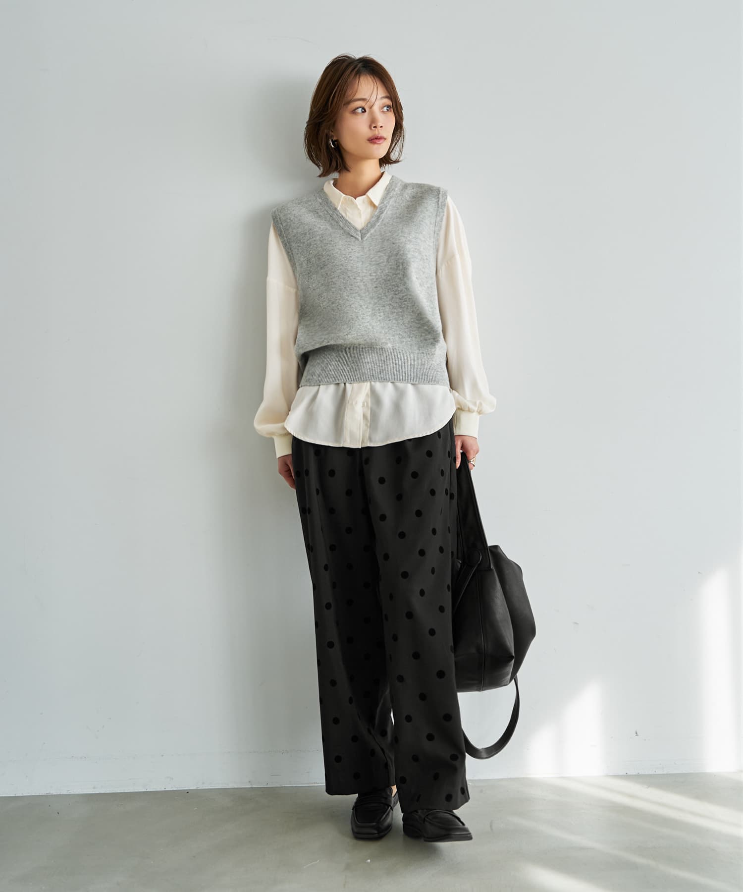 オーバーサイズが続いた数年、このフォルムが新鮮チクチクしないウール100%春素材の明色ベスト◆1/22インスタライブご紹介商品◆アーカイブのご視聴はこちらから→【2026/1/22ライブ】【この商品の特徴】◆ウール100%の上質素材ながらも、冬っぽくないスッキリ質感◆チクチク感のないスムースな肌触り◆薄くも厚くもなく、しっかりとコシがある生地◆正統派にシンプルなデザインが新鮮◆ノースリーブニットにもなる形◆ジャケットのインナーにしてもカワイイ◆フレアスカートやボリュームスカートとも相性◎◆キレイめにもカジュアルにも使えるデザイン◆ブラウジング可能で丈感調節ができる◆春らしさのある明るい色合い【この商品の詳細】余分なゆったり感がなく、スッキリとしたフォルムで着るサイズ感が新鮮なニットベスト。潔くシンプルな正統派デザインもまた良く、それが逆に最旬な雰囲気を感じさせてオシャレに見える一枚です。シンプルなだけにウールを100%で使用した贅沢な素材を使い、その良さを味わえるところもまた魅力。ウールも100%になるとチクチク感などは無く、この素材ならではのしっかり感を楽しむことができます。◆厚みは無いのに程よく暖かなところがさすが、という感じで素材の良さを感じます。◆見た目はスッキリとしており、起毛感やウールっぽさといった「冬の感じ」が無い春用のウールです(もちろん冬でも使えます)。◆裾のリブが締め付けるのとは違う感じに自然なフィットがあり、ウエストの好きな位置で留められる仕様。丈感がいじれるので全身バランスがとりやすくなっています。◆ジャケットのインナーにしても素敵。タンクトップやベアトップ等を中に着て、ノースリーブニットとしても使えます。そのように着ても胸元が露出しない開き加減のVネックです。【さらにプラス情報】◆サイズ感:一般的なMサイズという感じです。ジャストサイズ系でゆったり感はありませんが、バスト周り(身幅)はゆとりがあります。◆インナー:ピッタリめの長袖カットソーやシアートップスが一番スッキリと見えてお薦め。そのほかTシャツやシャツ、ブラウスなども合わせられます。◆静電気:とくに発生しやすい生地ではありませんが、程度の差はその方の帯電体質具合や合わせアイテムなどによりますのと、冬場は乾燥でどうしても…というところはありますので、もしも気になる場合はエレガードなどの静電気防止スプレー等でご対処ください。◆毛羽立ち:毛羽立ちにくい生地ですが、その方の動作グセやバッグとの摩擦具合、着用頻度やお洗濯方法により個人差がありますので、できることもあるかもしれません。できた場合は毛玉取りクリーナー等でお手入れをしてください。◆お手入れ:高級素材になりますので、ウール用の洗剤などを使用するとより良いと思います。【その他の仕様などの情報】◆着用時期:10-5月頃が目安◆サイズ感:一般的なMサイズ◆丈感:前はおヘソ程度の丈感/背面は腰が隠れる程度の長さ◆ウエスト:裾リブ編み仕様(伸縮性あり)◆肩幅:問わないタイプ◆アームホール:広め◆厚み:普通-ややしっかりめ◆柔らかさ:柔らかい系ではない/しっかりめ◆肌触り:少しドライタッチでサラッと感がありつつ、僅かなふんわり感を含有◆着用ジワ:できにくい◆毛羽立ち:できにくい◆伸縮性:あり◆光沢感:なし◆透け感:なし◆スリット:なし◆ボタンやファスナー:なし(かぶり着タイプ)◆裏地:なし◆手洗い:可能◆アイロン:不要◆スチーマー:使用OK【お色について】◆ライトグレー:ミドルグレーから白までの4段階濃淡で組まれた、グレーのグラデーションメランジ。明るく軽やかな印象のグレーです。◆クリーム:レアチーズケーキ(白ではないタイプ)のような、ほんのりとイエロー味のある優しいクリームホワイト。今季のトレンド感がある色合いです。【SNS用ハッシュタグ】#236129ベーシックvネックニットベスト(このハッシュタグでInstagramなどSNS内で検索をしますと、こちらをお持ちのお客様のご投稿があれば、簡単に見つけてご覧いただくことができます)