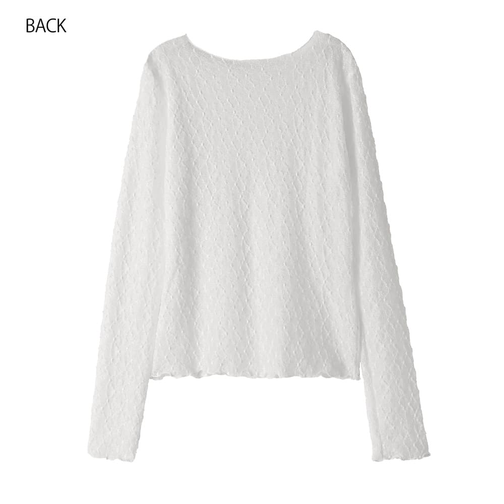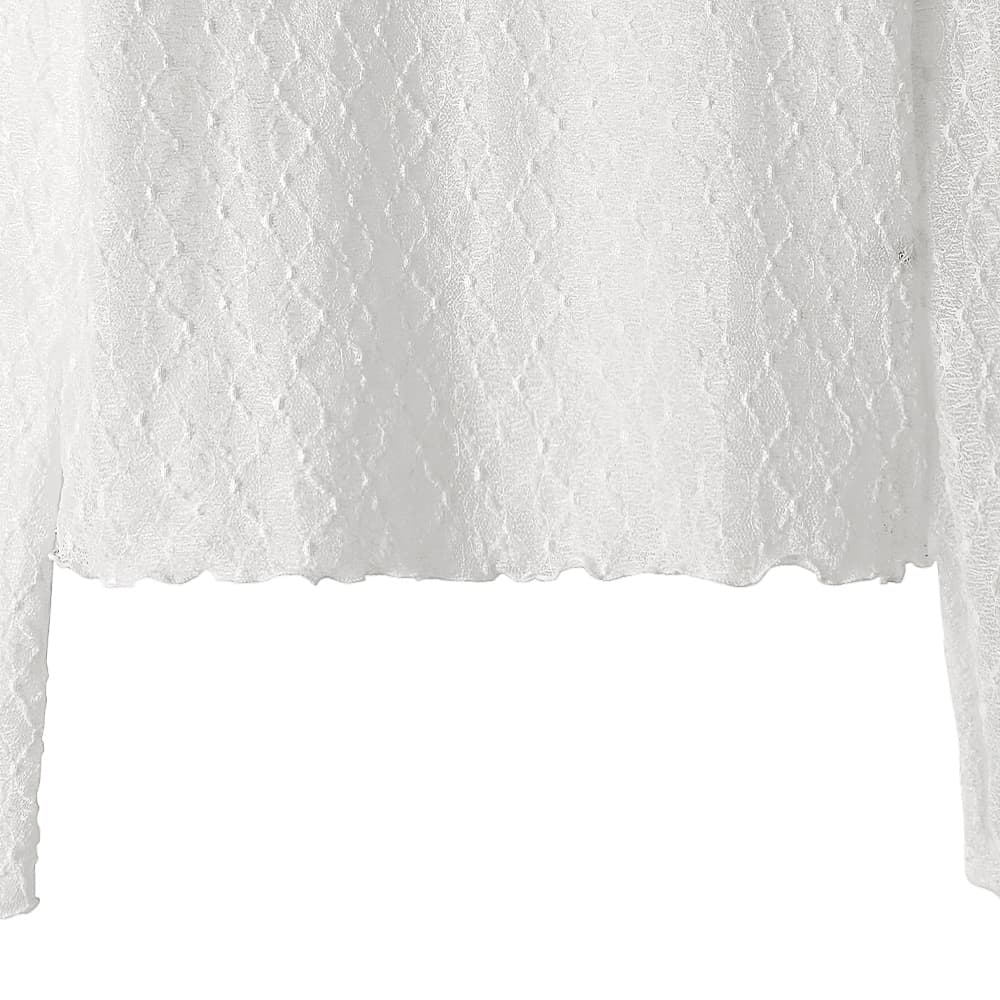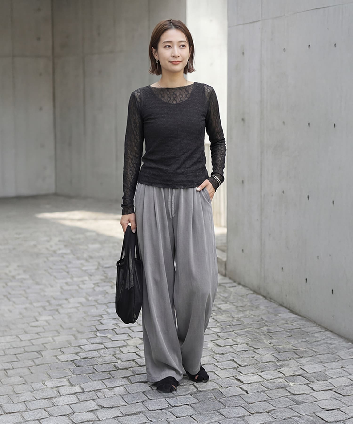 重ね着コーデをメインになにかと役立つ、ストレッチレース生地のシアー素材トップス。花柄などとは異なるテーマの無い柄感で、甘さや古臭さが出ないところがポイントです。