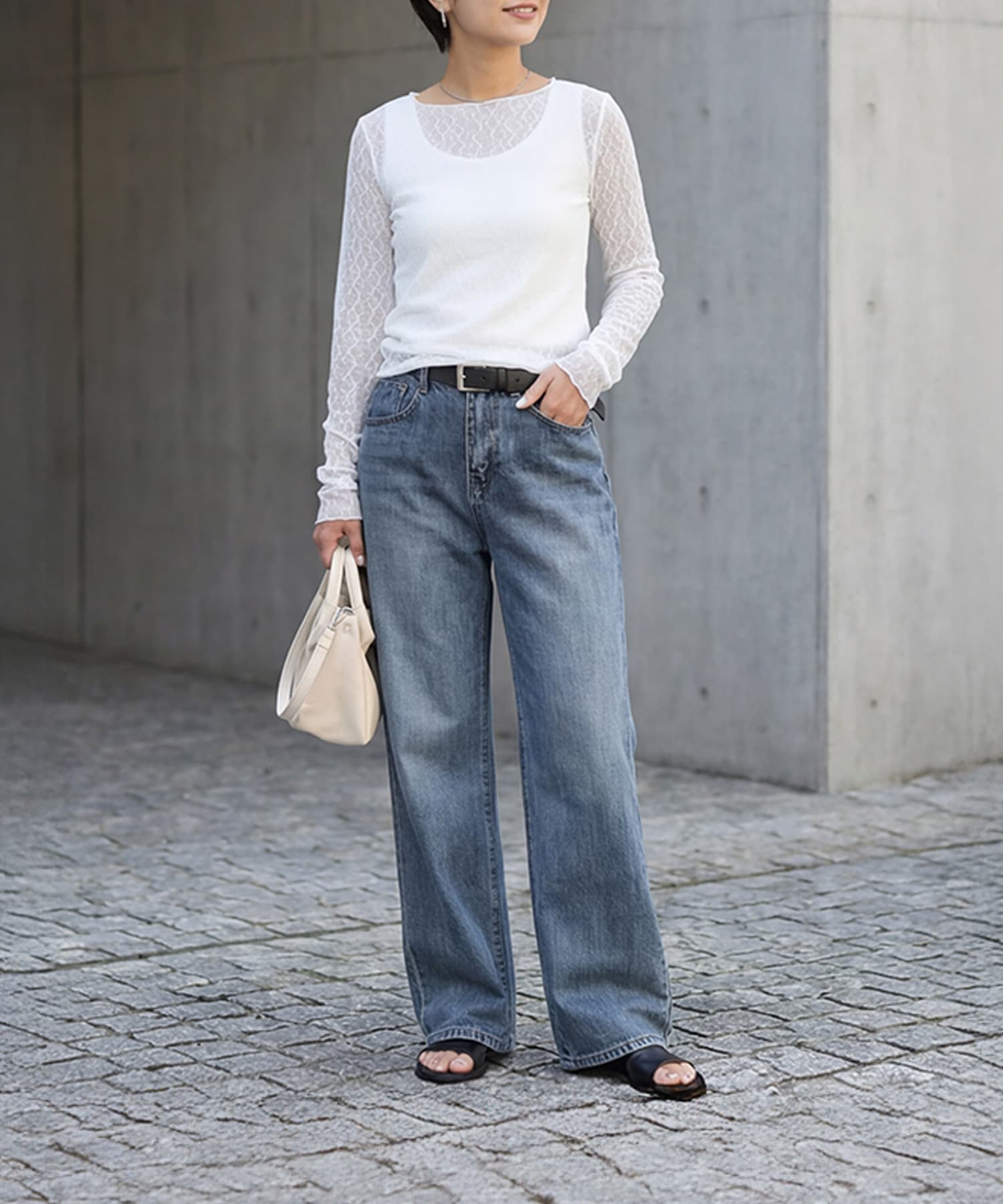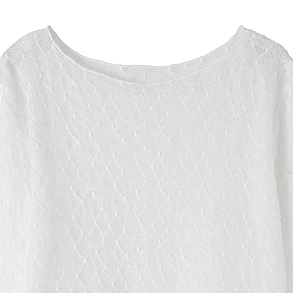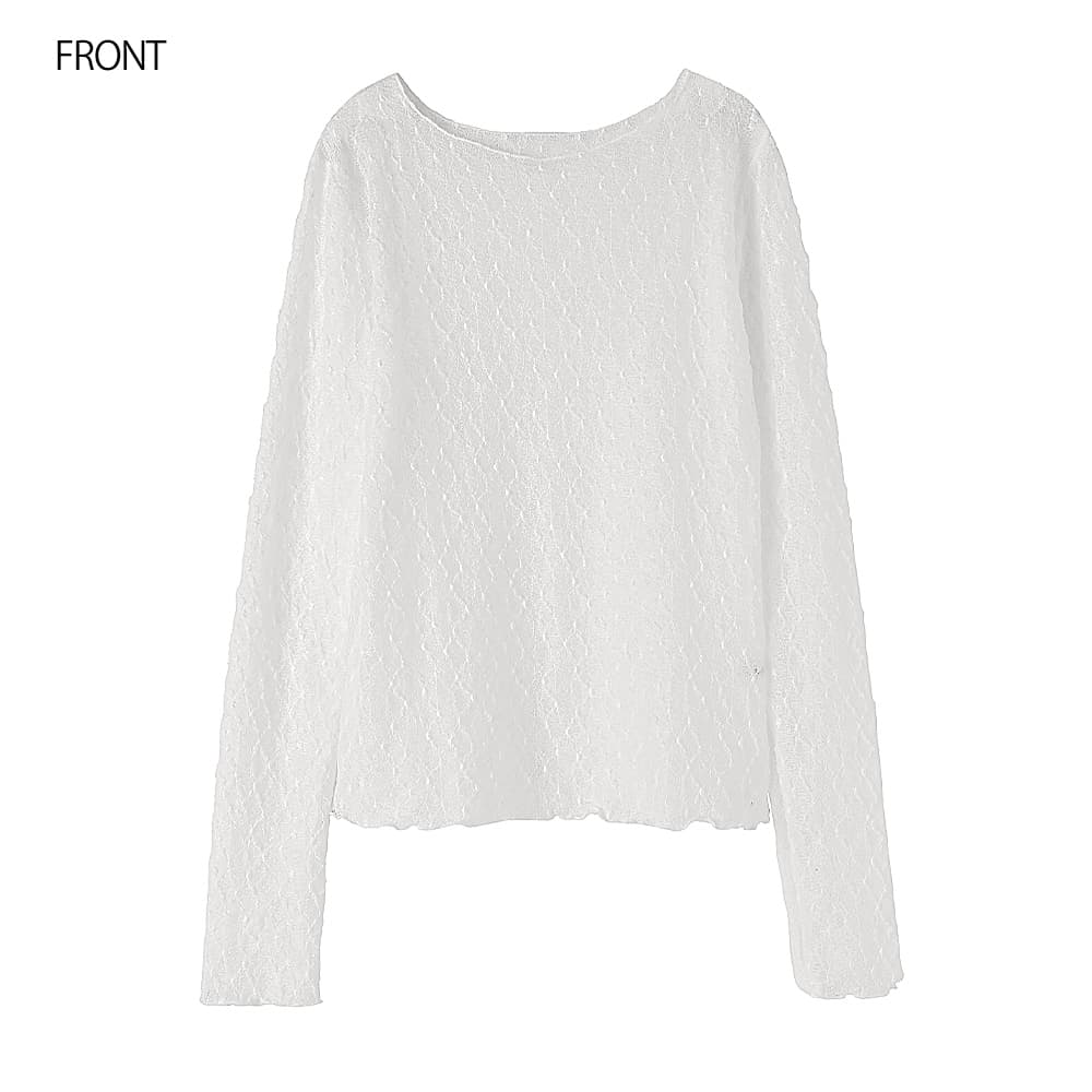 重ね着コーデをメインになにかと役立つ、ストレッチレース生地のシアー素材トップス。花柄などとは異なるテーマの無い柄感で、甘さや古臭さが出ないところがポイントです。