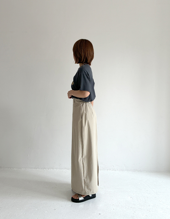 その名の通りに薄くてハリ感のある、スッキリとした生地で仕立てたロング丈スカート。構造的にはAラインですが、穿くとほぼストレートになる控えめなAラインです。