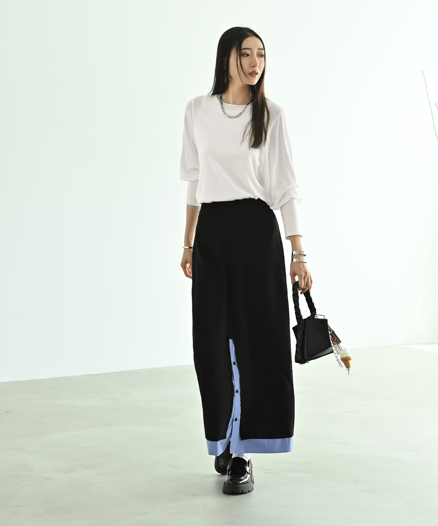 =スタイルに奥行きをつくる、シャツドッキングスカート=穿くだけでコーデが締まり、こなれたモード感が完成するブラックのドッキングスカート。タイトすぎず広がらないIラインに、ブルーのシャツ生地をレイヤードしたデザインで、動くたびに軽やかな抜け感が生まれます。着丈93cmのロング丈は、高身長の方でも物足りなさが出ず、Lサイズ以上の方も安心のバランス。前スリットから覗くブルーが縦ラインを強調し、ブラック特有の重さを感じさせません。スカート部分は柔らかく落ち感のあるニットタッチ素材、シャツ部分はハリのあるポリエステル×コットン。異素材のコントラストが大人の余裕を演出し、シンプルなトップスでも絵になる仕上がりに。[こんな方におすすめ]・黒スカートでも重く見えないデザインが欲しい・甘さ控えめ・かっこよく穿けるスカートを探している・高身長でもしっかりロング丈を確保したい・ベーシックカラー中心でもマンネリしたくない[スタイリング提案]・白ニット×ローファーでモードに・黒タートル×ショート丈アウターでシャツ部分を活かした縦ライン強調・スウェット合わせのカジュアルミックスもOK・ロングブーツと合わせて冬仕様にアップデート[着用時期]秋・冬・春先[透け感]なし[生地の厚み]中厚地[伸縮性]スカート部分あり[光沢感]なし(マット)[裏地]なし[素材感]柔らかいニットタッチ×ハリのあるシャツ地[お手入れ]手洗い可[ポケット]なし[お色について]ブラック:マットで上品な黒。シャツレイヤードの淡いブルーが重さを軽減し、辛口になりすぎず清潔感のある雰囲気に。[お知らせ事項]海外縫製のため、縫い目のわずかな粗さや糸残りが見られる場合がございますが、着用には問題ございません。実際にお召しいただくと、軽さ・シルエット・デザイン性のバランスの良さをご実感いただけます。