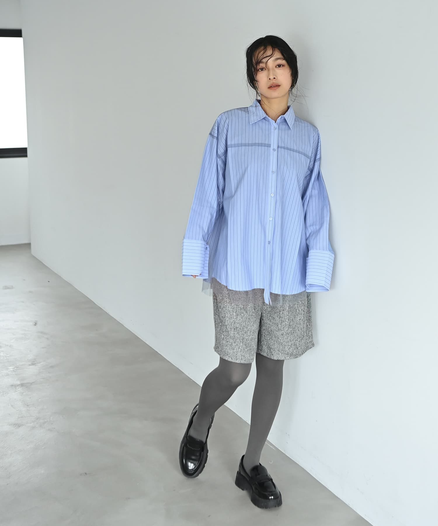 =重ねるだけで、こなれて見える。大人のためのレイヤードシャツ=一枚でも羽織りでもサマになる、レイヤードデザインシャツ。きちんと感のあるブルーのブロードシャツに、ストライプチュールを重ねた、シンプルながら奥行きのある一枚です。チュールはシャープなストライプ柄と直線的なシルエットで、甘さ控えめの大人仕様。かわいさよりも“かっこよさ”が引き立ちます。ハリがあり軽やかなブロード素材で、体のラインを拾いにくいゆったり設計。高身長さんやLサイズ以上の方でも、肩・身幅・着丈に余裕を感じられるサイズ感です。前を閉じても開けてもバランスが良く、迷った日に頼れる一枚。[こんな方におすすめ]・ベーシックだけど、少しデザイン性のあるシャツが欲しい・レイヤードは苦手だが、洒落感は取り入れたい・体型を拾わず、すっきり見せたい・高身長/Lサイズ以上でも安心して着られるシャツを探している・甘さ控えめの、モード寄りな服が好き[スタイリング提案]・ワイドパンツ合わせでマニッシュに・タイトスカートと合わせて縦ラインを強調・前を開けて、インナーを見せた軽やかな羽織スタイルに・足元はローファーやレザーシューズで大人バランス[商品について][着用時期]:春・秋(インナー次第でロングシーズン着用可)[伸縮性]:なし[生地の厚み]:やや薄手[光沢感]:なし[透け感]:チュール部分のみややあり[裏地]:なし[お手入れ]:手洗い可[お色について]ブルー×ストライプ:爽やかで落ち着きのあるブルーのブロードシャツに、ストライプ柄チュールを重ねた配色。[お知らせ事項]こちらは海外縫製商品となります。縫製や糸処理、チュールの重なり方には若干の個体差が見られる場合がございますが、いずれも着用には問題なく、品質基準を満たしたもののみをお届けしております。実際に袖を通すと、レイヤードならではの立体感と着映え力を感じていただける一枚です。