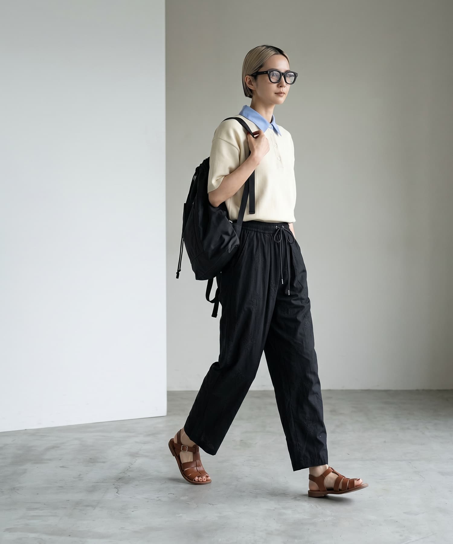 リラックス感がありながらも、フロントのタックが縦のラインを強調し、すっきりとした印象に仕上げています。