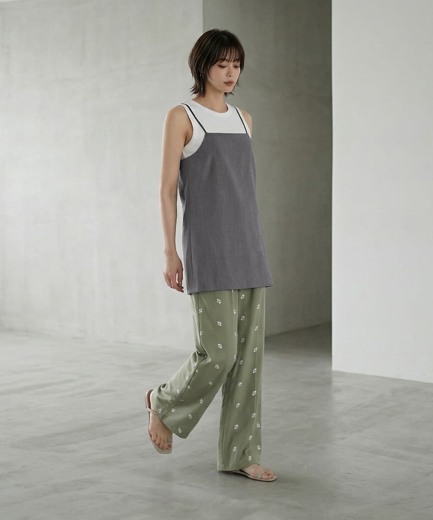 ・タンクトップやリブカットソーを合わせて、抜け感のあるレイヤードに