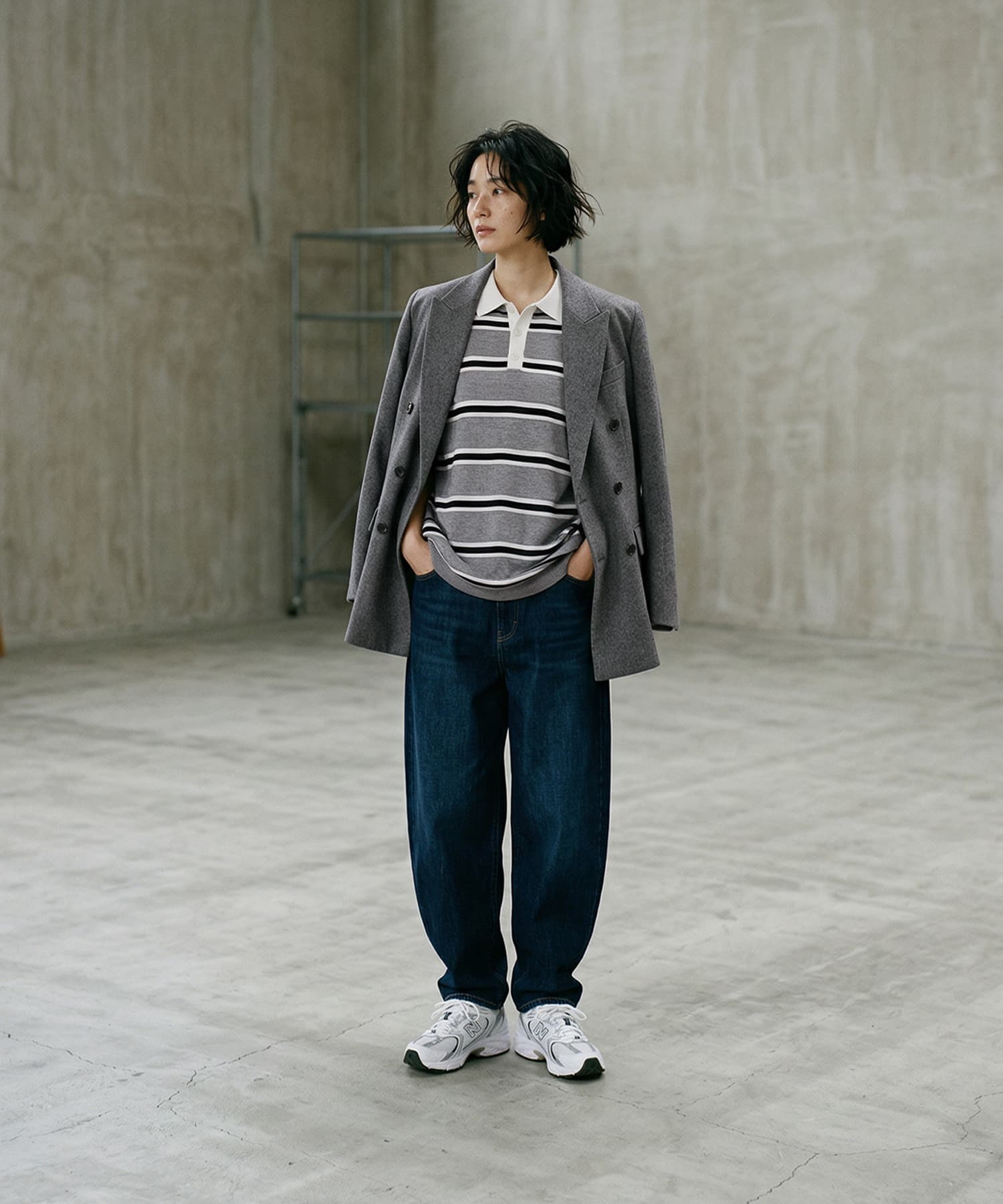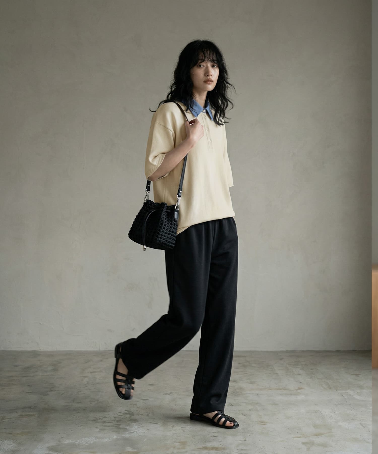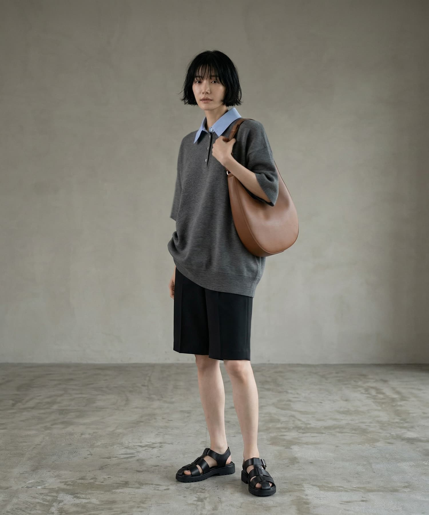 抜けすぎない、きちんと感。大人のためのシャツ襟ポロニット。高身長・がっちり体型の方にもバランスよく着ていただける一枚です。■ Designシャツ襟をドッキングしたデザインで、ラフになりがちなポロニットをきれいめに一段上の完成度に引き上げ。きちんと感を保ちながらも、ほどよく力の抜けた大人のバランスに仕上げています。ゆとりのあるシルエットで体のラインを拾わず、自然にカバー。肘にかかる長めの半袖が、気になる腕まわりもすっきり見せてくれます。シンプル無地とボーダー展開で、スタイリングの幅も広がる一枚。一枚でサマになり、レイヤードいらずで着こなしが決まります。■ Fabricさらっとしたドライタッチのニット素材を使用。軽やかな着心地で、暑い季節でも快適に着用可能。型崩れしにくく、きれいなシルエットをキープします。シャツ部分はハリ感のある素材で、顔まわりをシャープに演出。■ Coordinate・スラックス合わせで、クリーンで都会的なスタイルに・デニムと合わせて、程よく力の抜けた大人カジュアルに・タイトスカートと合わせて、すっきりとした女性らしいバランスにきちんと感と抜け感を両立できるから、オンオフ問わず活躍。シンプルながら着こなしに差がつく、大人のためのポロニットです。===================================裏地:なし透け感:なし光沢感:なし伸縮:ありケア方法:手洗い推奨===================================■ Noticeこちらは海外縫製商品となります。多少の個体差が生じる場合がございますが、品質基準を満たした良品のみをお届けしております。