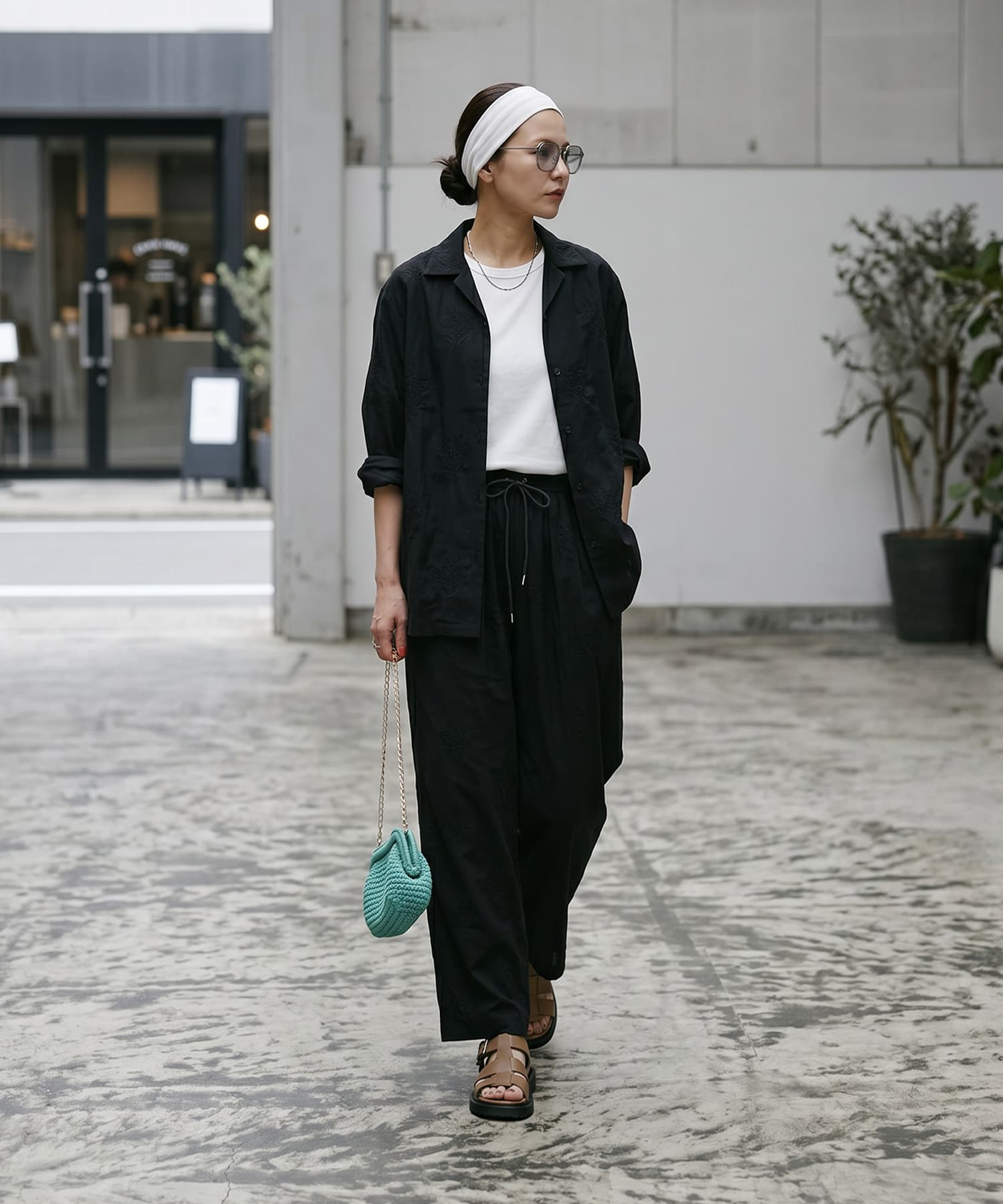 【SET price!! 19,400円⇒16,000円(税込)】※こちらはセット特別価格の商品です。返品等で単品購入となった場合は、単品価格へ変更となりますのでご了承ください。■ Designオープンカラーシャツとタック入りイージーパンツを組み合わせた、洗練されたセットアップ。シャツはゆったりとしたシルエットで、体のラインを拾わず自然にカバー。顔まわりをすっきり見せるオープンカラーが、抜け感ときちんと感を両立します。パンツはウエスト総ゴム+ドローストリング仕様で、ストレスフリーな穿き心地。タック入りのワイドシルエットが縦のラインを強調し、すっきりとした印象に。上下ともに同色のフラワー刺繍をさりげなく施し、シンプルなブラックに奥行きと品の良さをプラスしています。セットで着るだけで完成し、それぞれ単品使いでも着回し力の高い優秀アイテムです。■ Fabric基布は綿100%素材を使用。コットンならではのさらりとした肌あたりで、ロングシーズン快適に着用いただけます。軽やかで程よいハリ感があり、ラフになりすぎず上品な印象に。パンツは裏地付きで安心感があり、透けを気にせず着用できるのも嬉しいポイントです。同色刺繍でまとめることで、華やかすぎず大人らしい落ち着いた雰囲気に仕上げています。■ Coordinate・セットアップで着て、こなれ感のある洗練スタイルに・シャツはデニム合わせで、大人の抜け感カジュアルに・パンツはシンプルなTシャツ合わせで、上品なリラックススタイルに頑張りすぎないのに、きちんと見える。そんな理想を叶えてくれる、大人のためのセットアップです。【単品販売はこちら】 850200【BLK001】刺繍オープンカラーシャツ850201【BLK001】刺繍タックイージーパンツ===================================裏地:パンツのみあり透け感:ややあり(シャツ)光沢感:なし伸縮:なしケア方法:手洗い推奨===================================■ Noticeこちらは海外縫製商品となります。多少の個体差が生じる場合がございますが、品質基準を満たした良品のみをお届けしております。
