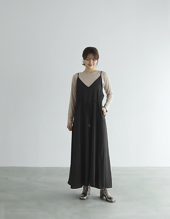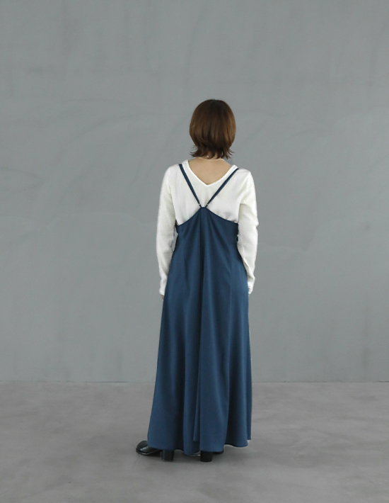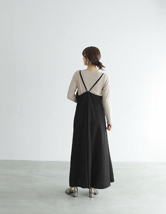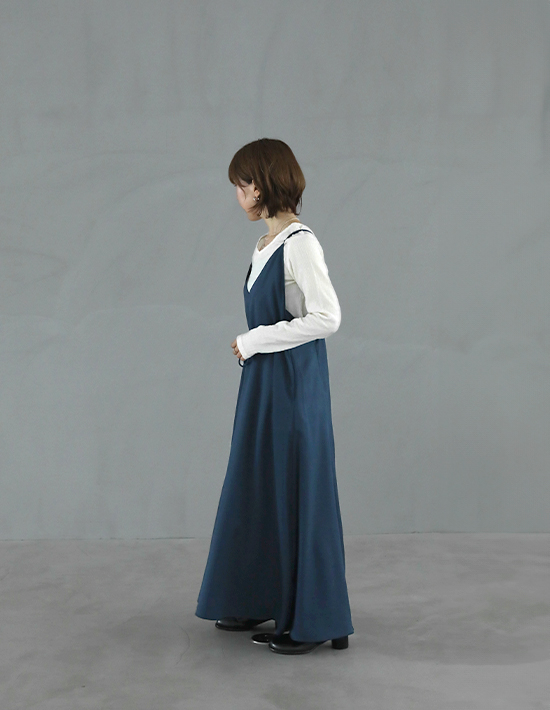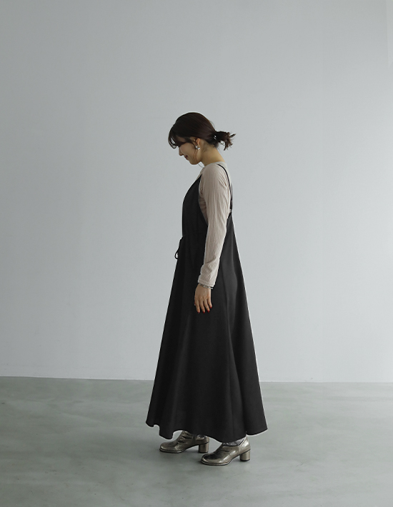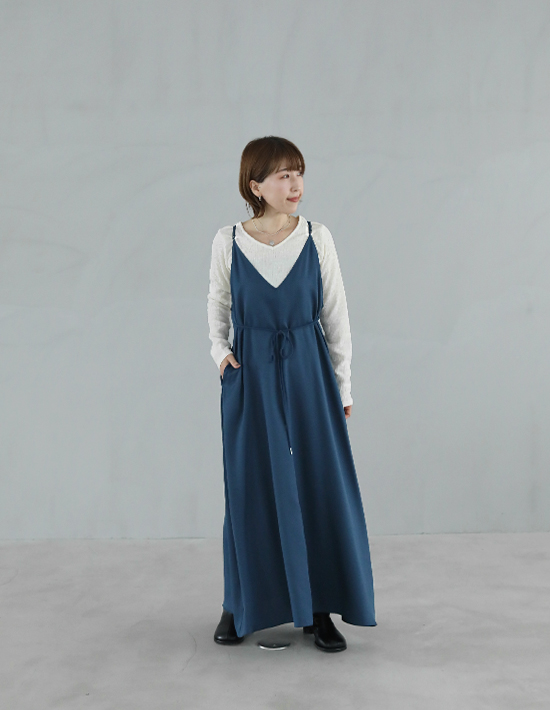 V字ジャンスカでウエストマークが新しい紐のアレンジも丈感調節も可能で便利な、ご支持が厚いジョーゼット生地ジャンスカ◆10/2インスタライブご紹介商品◆アーカイブのご視聴はこちらから→【10/2ライブ】【このアイテムの特徴】◆人気のジョーゼット生地◆スッキリと見える質感◆軽量な着心地◆ウエストマーク可能/好みで選べる◆肩紐の長さ調節が可能◆ズリ落ちにくいよう配慮された肩紐◆体型カバー効果◎◆Lサイズ体型にも対応◆手洗い可能でアイロン不要◆季節を問わずに使用可能◆スニーカー合わせもカワイイ◆キレイめにもカジュアルめにも使える◆流行りと関係がないデザイン【このアイテムの詳細】◆フロントの美しいV字開きが印象的な、ジョーゼット生地のジャンパースカート。ボディの内側に紐を通してあり、お好みでウエストマークをする/背面で結ぶ/紐を取り外すという3パターンのセレクトができます。◆肩紐は長さの調節が自在に可能で、背面の中央で寄せたデザイン。こうすることで肩紐に内側方向の力がかかり、肩紐がズリ落ちにくくなります。◆ウエストからなだらかなラインで広がる、スカートのフォルムもキレイでこだわりのポイント。タックやギャザーの無いスッキリとしたデザインですが、生地量により自然なドレープが生まれます。◆生地は扱いやすさが人気のジョーゼットを使用。サラサラと薄手で軽く、落ち感に優れた着心地の良い生地です。◆中に合わせるものはカットソーや薄手のニットなどがお薦め。ジャンパースカートの生地がブラウス系なので、生地の質感を離すのがカッコよくキメる秘訣です。その上からシャツを羽織ったり、ニットガウンなどを合わせても素敵です。◆雰囲気的にはキレイめ感やスタイリッシュさを持ちつつ、気取りの無いラフさや僅かな可愛さも入ったニュートラルなデザイン。クール過ぎない感じや甘さが無いところなど、クセを外した使いやすいデザインになっています。◆気分に合わせて思いきり長いマキシ丈で着たり、丈を短めにして軽快なバランスを楽しんだりと、調節のきくところが便利。ヒール付きのブーツを履く日とスニーカーを履く日で丈感を変えるなど、靴に合わせて長さを変えたりもできる使い勝手の良さが自慢です。【さらにプラス情報】◆季節感:とくに季節を問う生地ではなく、年間を通しての使用が可能。中に合わせるインナーやアウターを変えながら、気温に応じた着こなしを楽しめます。◆暖かさ:とくに暖かさは無く、素脚で着るベストシーズンは秋・春という感じ。冬は厚地タイツやレギンスを合わせたり、上からヒップが隠れるニットガウンなどで防寒対策をして着る感じです。◆紐の構造:ボディの左右側面に紐サイズの小さな穴が開いており、紐をワンピースの前面裏側に通して、その穴から紐を出して使用します。紐はその穴から完全に抜くことができ、また通すことも可能です。◆紐のデザイン:パーカーの首元から垂れているような、丸形断面の編み紐を使用。ここにさりげなくカジュアル感を入れることで、スニーカーやロゴT合わせなどもカワイイ『雰囲気的な振り幅』が生まれます(=着こなしがキレイめに限定されない)。紐の先端エンドパーツはブラックメッキ金具。アクセサリーや小物の金具の色を選ばず便利です。◆裏地:肩凝りに負担をかけない軽量な造りにしたかったため、裏地は付けずに軽やかに仕上げました。一枚でもキレイに着れるサラサラと肌離れの良い生地ですが、お好みでペチコート類を入れるのも良いと思います。◆シワ:シワができやすい生地ではなく、アイロン掛けは不要です。もしも気になる場合はアイロンよりもスチーマーの方が向いており、ササッと伸ばすことができます。◆静電気:その方の帯電体質具合や合わせアイテムなどに左右されますが、冬場は乾燥でどうしても…というところはありますので、もしも気になる場合はエレガードなどの静電気防止スプレー等でご対処ください。ペチコート類を入れるのも脚へのはり付き防止に有効です。【その他の仕様などの情報】◆着用時期:通年(12-2月の真冬はお好みによる)◆サイズ感:ゆったりめのサイズ感(Lサイズ体型にも対応)◆丈感:くるぶし程度の丈感◆シルエット:Aライン(フレア)◆肩幅:問わないタイプ◆アームホール:広い◆厚み:やや薄手◆柔らかさ:しなやかさの中に僅かなハリ感が共存◆肌触り:サラサラとしてスムースな感じ◆着用ジワ:できにくい◆毛羽立ち:できにくい◆伸縮性:なし◆光沢感:なし◆透け感:少しあり◆スリット:なし◆ボタンやファスナー:なし(かぶり着タイプ)◆ポケット:両サイドにあり◆裏地:なし◆手洗い:可能◆裾上げ:お直しに出していただけます◆アイロン:不要◆スチーマー:使用OK【お色について】◆ブラック:通常の定番的なブラックです。◆コバルトブルー:ネイビーを明るくしたような、またはロイヤルブルーの彩度をどんどん落として明度を下げたようか、落ち着きのあ
