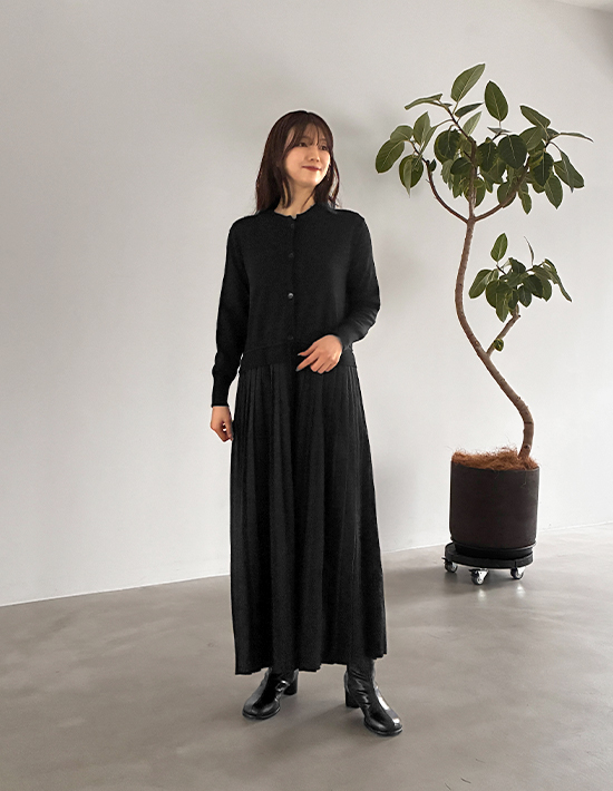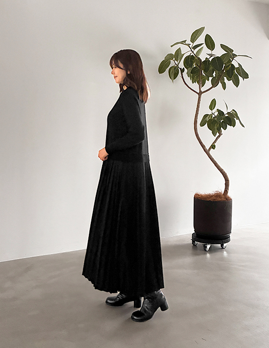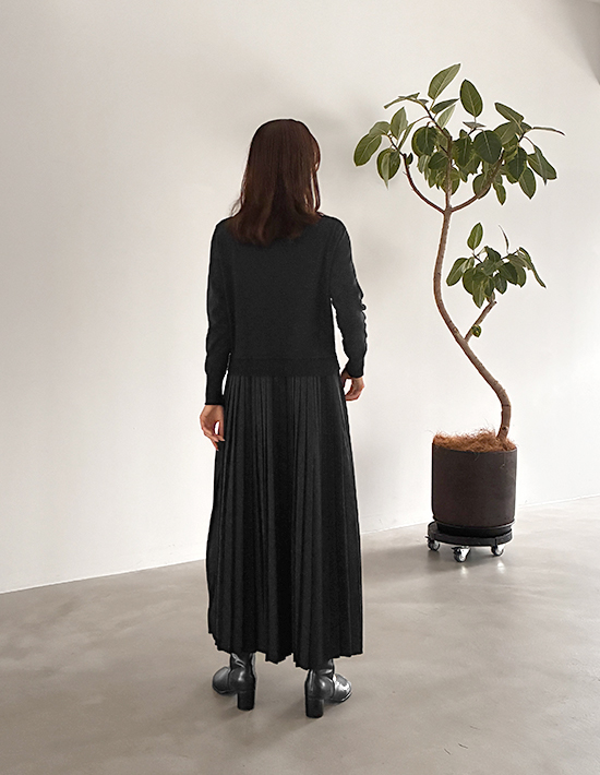 着るだけでバランスが良い時短アイテム加えて着こなしのアレンジも作りやすい前開きボタンの異素材MIXワンピース◆11/27インスタライブご紹介商品◆アーカイブのご視聴はこちらから→【11/27ライブ】【この商品の特徴】上はニット、下がプリーツスカートになっているロング丈のワンピース。前はボタン開きだったり、ウエストマークができる紐が付いていたりと、自分に似合う着こなしのバランスがとりやすいデザインになっています。◆全体的にゆったりめのサイズ感で、身体のラインを出さずに体型カバーが可能。だけどダボっとしないメリハリ感があるデザインになっています。◆丈感は割と長めになっており、身長156cm以上から168cm以下の方にお薦めです(丈詰めのお直しに出していただくことは可能です)。◆前はボタンで開けることができ、中にインナーを着て見せる着こなしもヌケ感が出て素敵。前を閉じてジャケットなどを合わせるのもお薦めです。◆過剰な厚みはありませんが、冬服として普通に暖かく着れる着用感。「いかにも冬限定」という質感ではなく、春先まで使うことができます。【さらにプラス情報】◆ウエストの紐は好きな具合に締められますが、丈感を短くするほどの強い固定力はありません。◆ニット部分はサラリとしたハイゲージ編み。スカート部分はシャツを作るようなサラッとした生地で、少しコットン含有ライクな手触りを持っています。◆とくにシワができやすい生地ではありませんが、気になる場合はその部分を中心に霧吹きでしっかりと湿らせて、ハンガーに掛けておけばOKです。足りなければスチーマーをプラスしても◎。アイロン掛けの必要はありません。◆ハンガー掛けで保管をする際は、ニットの肩が伸びないよう、厚みのあるハンガーを使用するようにしてください。【その他の仕様などの情報】◆着用時期:10-4月上旬が目安◆サイズ感:ゆったりめのサイズ感(Lサイズ体型にも対応)◆丈感:普通身長(160-163cm)でくるぶし上程度◆シルエット:スカート部分はフレア◆ウエスト:紐入り(ある程度は絞れる)◆首元:クルーネック◆肩幅:やや広め◆アームホール:普通◆袖幅:普通◆袖丈:長袖(手の甲が隠れる長さ)◆袖口:リブ(伸縮します)◆袖のたくし上げ:可能◆厚み:普通(厚くも薄くもない)◆重さ:普通(重くも軽量でもない)◆柔らかさ:柔らかさの中にハリ感が共存◆肌触り:ニットはふんわりとスムースでサラサラ感となめらかさが共存/スカートはサラッとしてハリ感がある感じ◆着用ジワ:多少はできることもあり(気にならない程度)◆毛羽立ち:できやすくはないが摩擦度などによりできる可能性もあり◆伸縮性:ニットあり/スカートなし◆光沢感:なし◆透け感:なし◆スリット:なし◆着脱:フロントボタン開き◆ボタン:生地色と馴染んだ染めボタン◆ポケット:なし◆裏地:なし◆手洗い:可能◆丈詰め:お直しに出していただけます◆アイロン:不要◆スチーマー:使用OK【お色について】◆ブラック:上下ともに定番的な通常のブラックです。◆グレー:上はほぼライトグレーという感じの明るいグレー。スカート部分はそれよりも少し濃い(暗い)グレーの組み合わせです。【SNS用ハッシュタグ】#236003プリーツスカートドッキングワンピース(このハッシュタグでInstagramなどSNS内で検索をしますと、こちらをお持ちのお客様のご投稿があれば、簡単に見つけてご覧いただくことができます)
