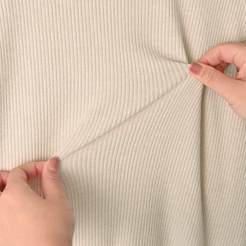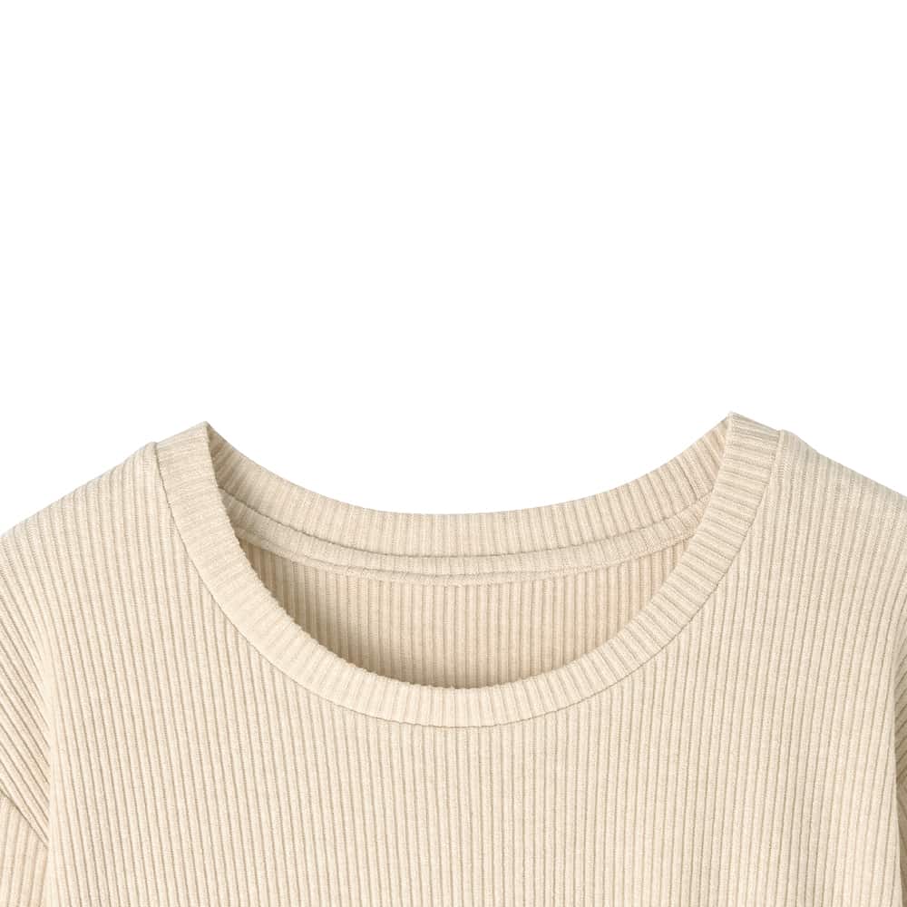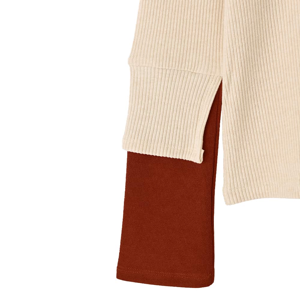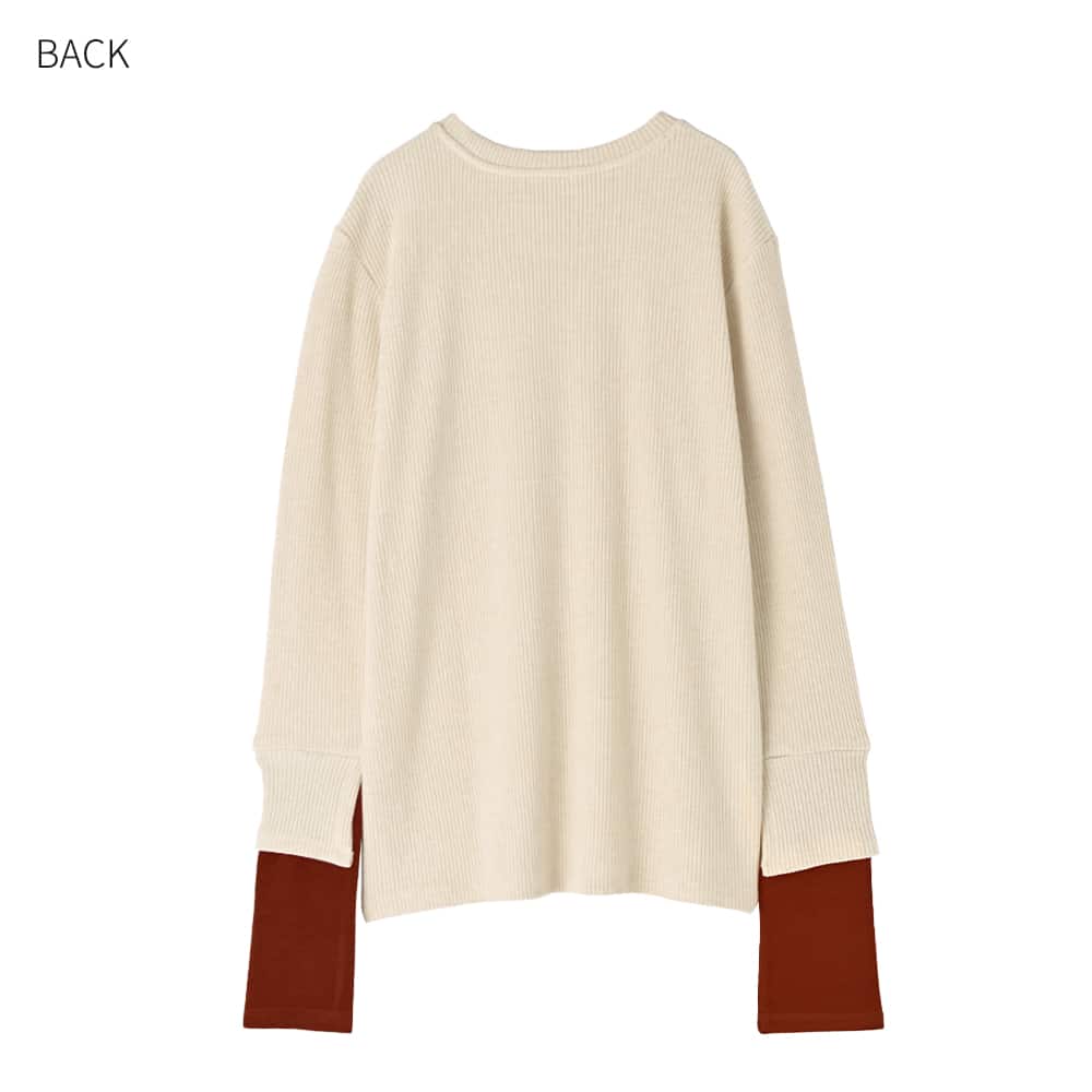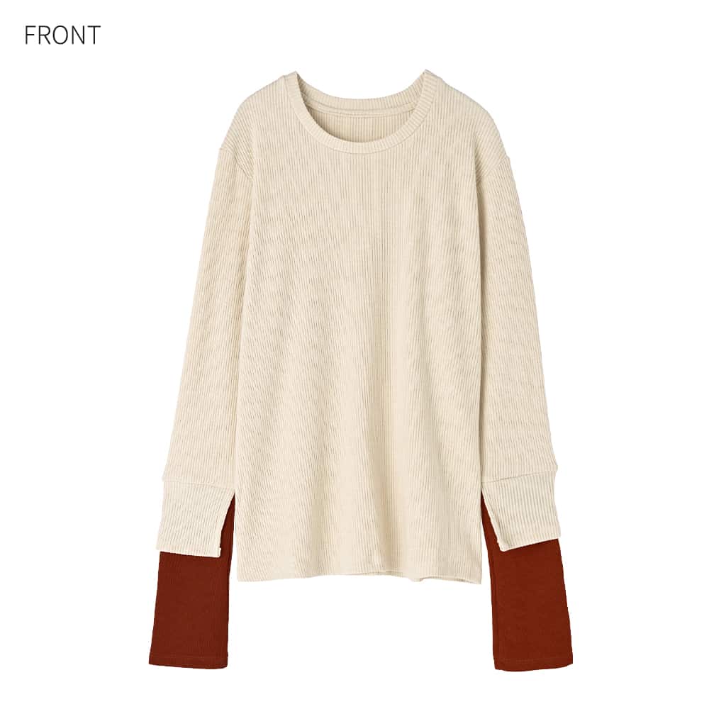 重ね着をさらに可愛く・もっとオシャレに袖口に厳選のアクセントカラーを効かせたレイヤードコーデを向上するカットソー◆12/11インスタライブご紹介商品◆アーカイブのご視聴はこちらから→【2025/12/11ライブ】【この商品の概要】重ね着のトレンドが来てからだいぶ経ち、より凝ったレイヤードや新鮮さが欲しくなってきているかな、という最近のおしゃれシーン。シンプルな白カットソーと重ねてもイイけれど、なんか物足りないような…?というような時に、ビシッとコーデを盛り上げてくれるアイテムを作りました。一見すると白や黒じゃないから使いづらそう(※)…にも見えますが、シュミレーションを重ねて使いやすい色味を厳選。ベストやサロペット、半端な袖丈のアイテム等と重ね着をする際、新鮮な印象を作り出してくれます。袖口からは別生地のアクセントカラーを出し、着こなしの邪魔にならない程度にポイントをプラス。手を動かす度にチラチラと見えて、とてもオシャレな印象になります。※白や黒でも試作をしましたが意外と可愛くなく、白や黒の場合は余計な色を加えない方がインナーとして優秀であると判断し、オシャレで使いやすい色を検証の結果これらの色になりました。【この商品の特徴】◆カットソーとしてはやや厚地で、一枚で着ても安心感のある着心地。本体は中太のリブ生地で、袖口にはなめらかでハリのある細かなリブテレコ生地を使用しています。◆全体的にゆったりとしており、ピチピチしないサイズ感。腹部周りにもゆとりがあり、裾をアウトで着ても下腹にはり付きません。◆全体的によく伸びる気持ちの良い生地。肌触りはサラッとしながら適度に柔らかく、肉感をカバーするために必要なハリ感も共存している感じです。◆首開きはそこまで詰まり感がなく、鎖骨程度の開き加減。広めのクルーネックやラウンドネックのものと首元の重ね着をすることも可能です。◆トップスとして使うのもアリですが、基本的にはベストやジレ、袖をまくったシャツジャケットやその他羽織り物など(=何かしらのインナーが必要なもの)と重ねて着ることを想定しています。◆袖口のアクセントカラーが邪魔なときは、カラー部分を内側に折り込んで隠し気味に着用することも可能。その際の袖丈は手の甲にかかる程度の長さになります。【さらにプラス情報】◆暖かさ:一般的な長袖Tシャツ(厚地ではない)よりも少し暖かいかな?程度です。◆透け感:基本的にはありませんが、ライトベージュは黒などの濃い下着の場合は、僅かに響くことがあるかもしれません。【その他の仕様などの情報】◆着用時期:10-4月が目安◆サイズ感:ゆとりのあるサイズ感(Lサイズ体型にも対応)◆丈感:前は太もも上部にかかる丈感/背面はヒップが隠れる程度の長さ◆シルエット:ストレート◆首元:適度に開いたクルーネック◆肩幅:広め◆アームホール:やや広め◆袖幅:やや広め◆袖丈:長袖(指先がちょこんと出る長さ)◆袖口:切替+別地レイヤード(伸びます)◆袖のたくし上げ:可能◆厚み:普通◆着用ジワ:できにくい◆毛羽立ち:できにくい◆伸縮性:あり◆光沢感:なし◆スリット:なし◆ボタンやファスナー:なし(かぶり着タイプ)◆手洗い:可能◆アイロン:不要◆スチーマー:使用OK【お色について】◆ライトベージュ(本体):エクリュが濃くなった感じの、かなり明るいベージュ色。イエロー味も赤味も半量ずつ入っていますが、色が淡いためそのどちらの印象も強くありません。肌色見えせずに明るく着れる絶妙なカラーになっています。◆カーキブラウン(本体):カーキ色にはグリーン系とブラウン系がある中で、後者にあたるタイプのニュアンスカラー。よく見ると同系色の濃淡糸を使用している、明るめのブラウンにほんのりとカーキ味が混ざったお色です。◆グリーン(袖口):僅かに青味のある、絵の具の『ビリジアン』系のグリーン。明るくも暗くもない明度です。◆ブラウン(袖口):カッパー系の赤味を持つ、オレンジがかったブラウン(というかブラウン味のある深いオレンジ)。オレンジの小物が幅広いコーデに合わせやすいのと同様、ポイントカラーとして使いやすいお色です。◆ベージュ(袖口):イエロー味も赤味も無く、かといってサンドベージュのようなグレーがかった感じでもない明るめのベージュ。きび砂糖の色に似ていてこの生地との相性が良く、上品でキレイなお色になっています。【SNS用ハッシュタグ】#236044カラーレイヤードリブカットソートップス(このハッシュタグでInstagramなどSNS内で検索をしますと、こちらをお持ちのお客様のご投稿があれば、簡単に見つけてご覧いただくことができます)