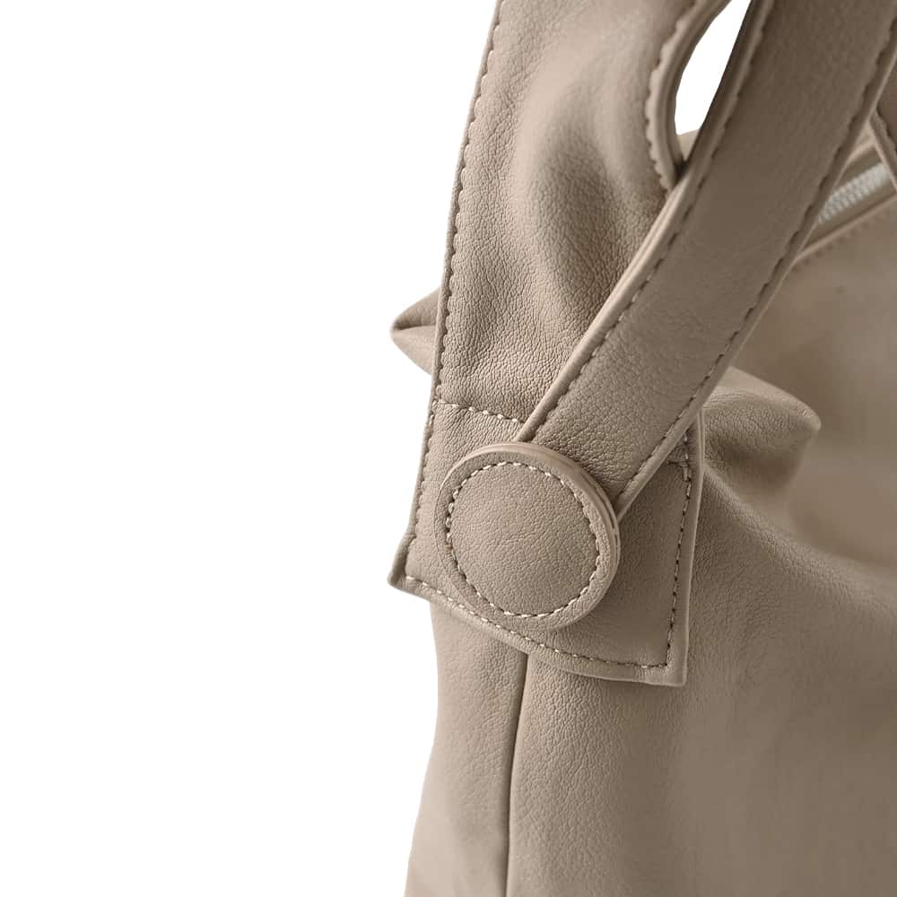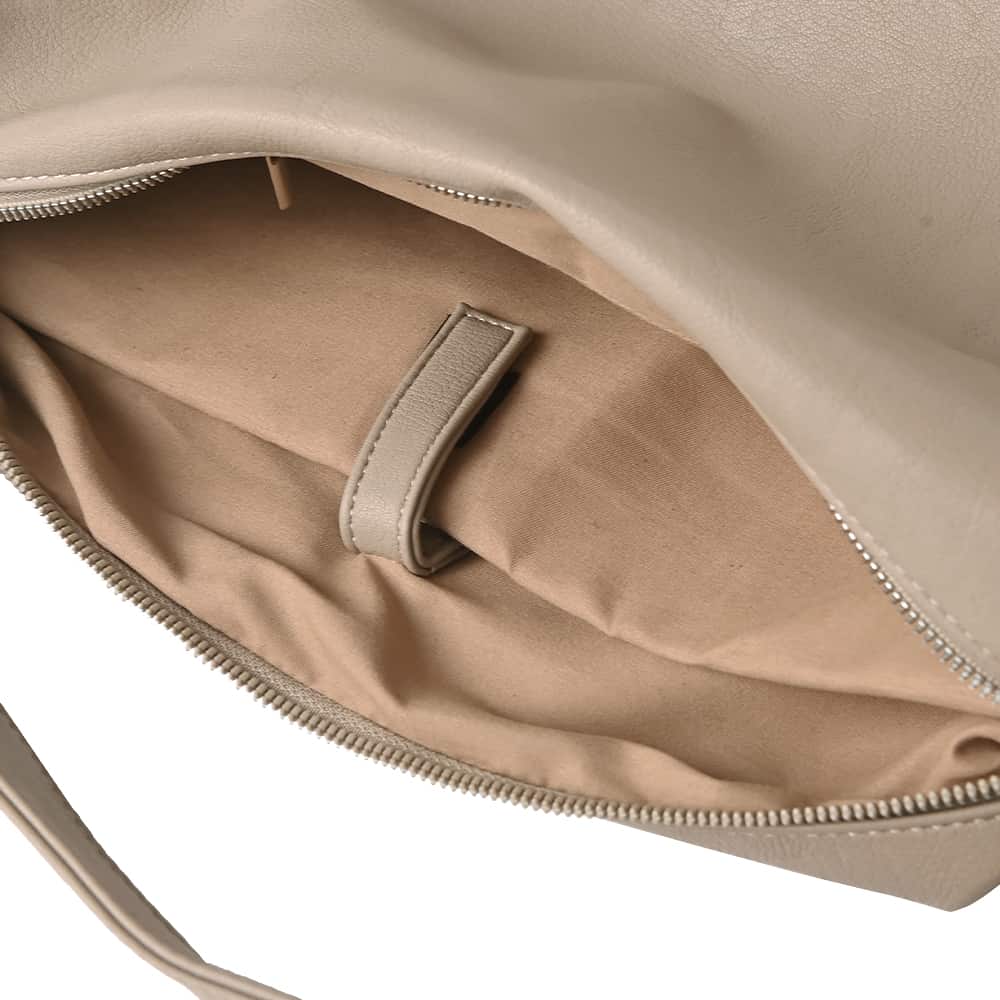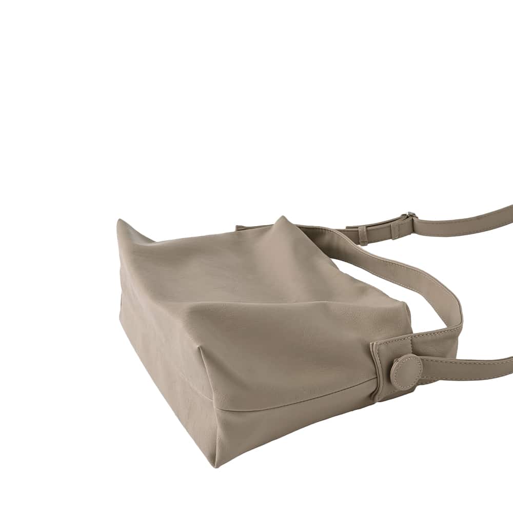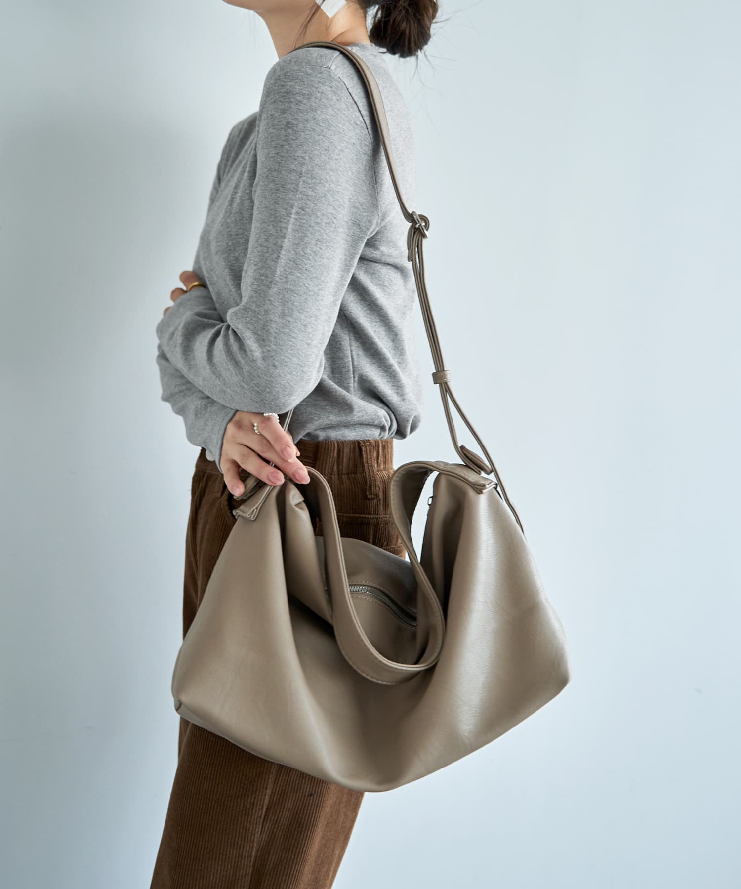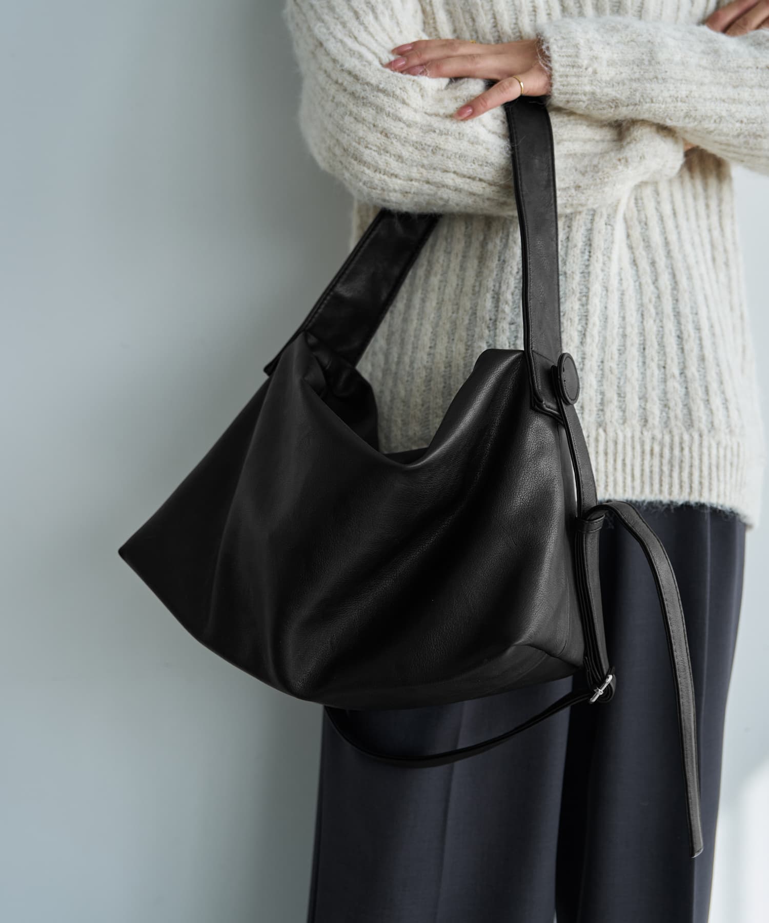 カッチリとしないレザー系というのがイイ軽さと容量、ストラップの長さも合格な、こなれた感じの大きめショルダーバッグ◆12/11インスタライブご紹介商品◆アーカイブのご視聴はこちらから→【2025/12/11ライブ】【このバッグの特徴】◆その名の通り、くったりとした質感と形状を持つこなれた雰囲気のバッグ。海外のファッショニスタがスナップで持っているようなデザインが素敵です。◆大人が持って違和感が無く、チープさの無い合皮を厳選しています。◆軽量でストレスにならない重さです(440-450グラム程度)。◆太い肩掛け用のストラップと、斜め掛けも可能な細くて長いストラップが付いています(取り外しはできません)。◆どちらも共にコートを着ていても肩掛けができる長めのストラップです。◆太いストラップは長さの調節ができませんが、細いストラップは自在に調節が可能です(最長時106cm程度)。◆ストラップはボタンのような大きく丸いパーツ(本体と同色・同素材)で留められており、肩に掛けたときなどにさりげないポイントになってカワイイです。◆多少の雨に濡れても拭けばOKという気軽さが良い、合成皮革素材。日常的な何気ないコーデにピッタリなデイリー向けバッグです。◆全体的に控えめなシワ加工を施した、細かいシボ革タイプです。シワ加工によりキズや汚れも目立ちにくくなっています。◆ツヤ(光沢)感はかなり控えめでマット寄りの質感。そのためカジュアルな格好やシンプル系ハンサムコーデなどにも合わせやすく、洗練されたオシャレ感があります。◆内側には大きなポケット付き。一つは文庫本サイズのファスナー付き。もう一つはバッグとほぼ同じサイズの大きなもので、マジックテープ式ベルトで開け口を固定できるデザインです。【お色について】◆ブラック:通常の定番的なブラックです。◆グレージュ:ベージュとライトグレーをブレンドした明るいお色。グレー味は感じますが、グレーよりはベージュの印象の方が強く、イエロー味や赤味はありません。【容量について】※基本的な荷物を入れて、さらにカーディガンなどの羽織り物を入れられるくらいに十分な容量があります。◆A4サイズ:OK◆ノートパソコン:大きさ的には入りますが、くったりとした形が無くなるためお薦めはできかねます。◆iPad:OK◆水筒、弁当箱、折りたたみ傘、500mlペットボトルなど:すべてOK【その他の仕様や情報】◆重さ:バッグとしてはかなり軽量な部類に入ります(440-450グラム程度)◆持ち手の長さ:太い方:53cm程度/細い方:最大106cm程度◆開け口の留め具:ファスナー◆ファスナーや金具の色:シルバー(ツヤあり)◆光沢感:控えめでマット寄り◆ポケット:内側に2つあり(詳細は上記に記載)◆底鋲:なし◆間仕切り:なし◆撥水加工:なし/ただし素材的に水は浸みにくく、多少の雨は弾く感じなのですぐに拭いていただければ問題は無いと思います。◆裏地の素材:綿ライクなサラサラとした同色系裏地です。◆お手入れ:一般的な合皮素材のバッグと同様に行ってください。【ご注意事項】◆洋服をはじめとする他アイテムとの摩擦や、汗やムレなどの湿気、雨の日などは色落ち・色移りに念の為ご注意ください。※この商品に限らず、バッグ全般に言える共通事項となります。過剰なご心配には及びませんが、万が一のトラブルが生じた際は恐れ入りますが免責とさせていただきますので、予めご理解をお願いいたします。◆合成皮革商品は染料などのニオイが気になることがあります。通常は時間とともにニオイが飛んでいきますが、敏感な方は予めご了承をお願いいたします。◆素材の特性上、小さなキズやスレなどが生じることがあります。見た目を損ねるほどのものではありませんので、ご理解をお願いいたします。【SNS用ハッシュタグ】#236076ダブルストラップ軽量くったりショルダーバッグ(このハッシュタグでInstagramなどSNS内で検索をしますと、こちらをお持ちのお客様のご投稿があれば、簡単に見つけてご覧いただくことができます)