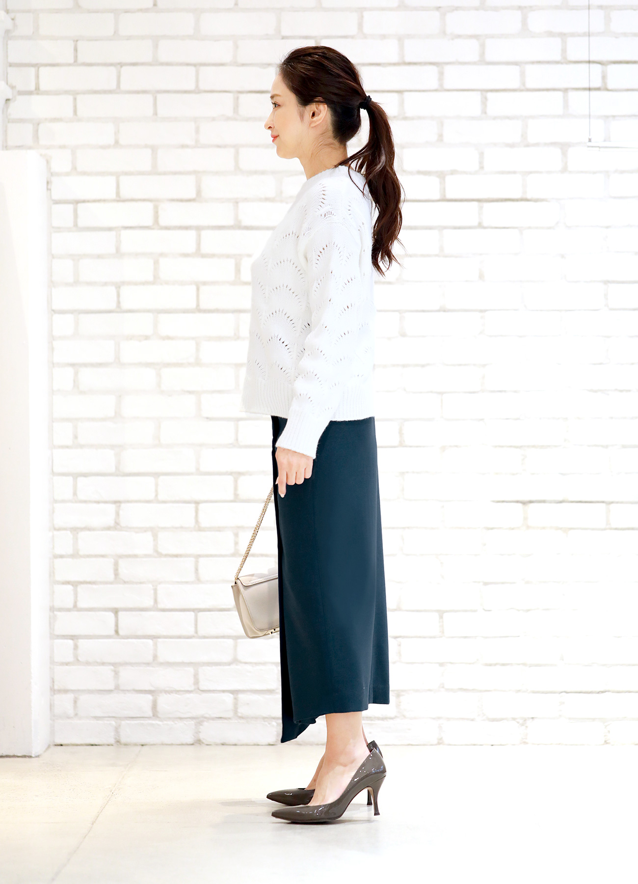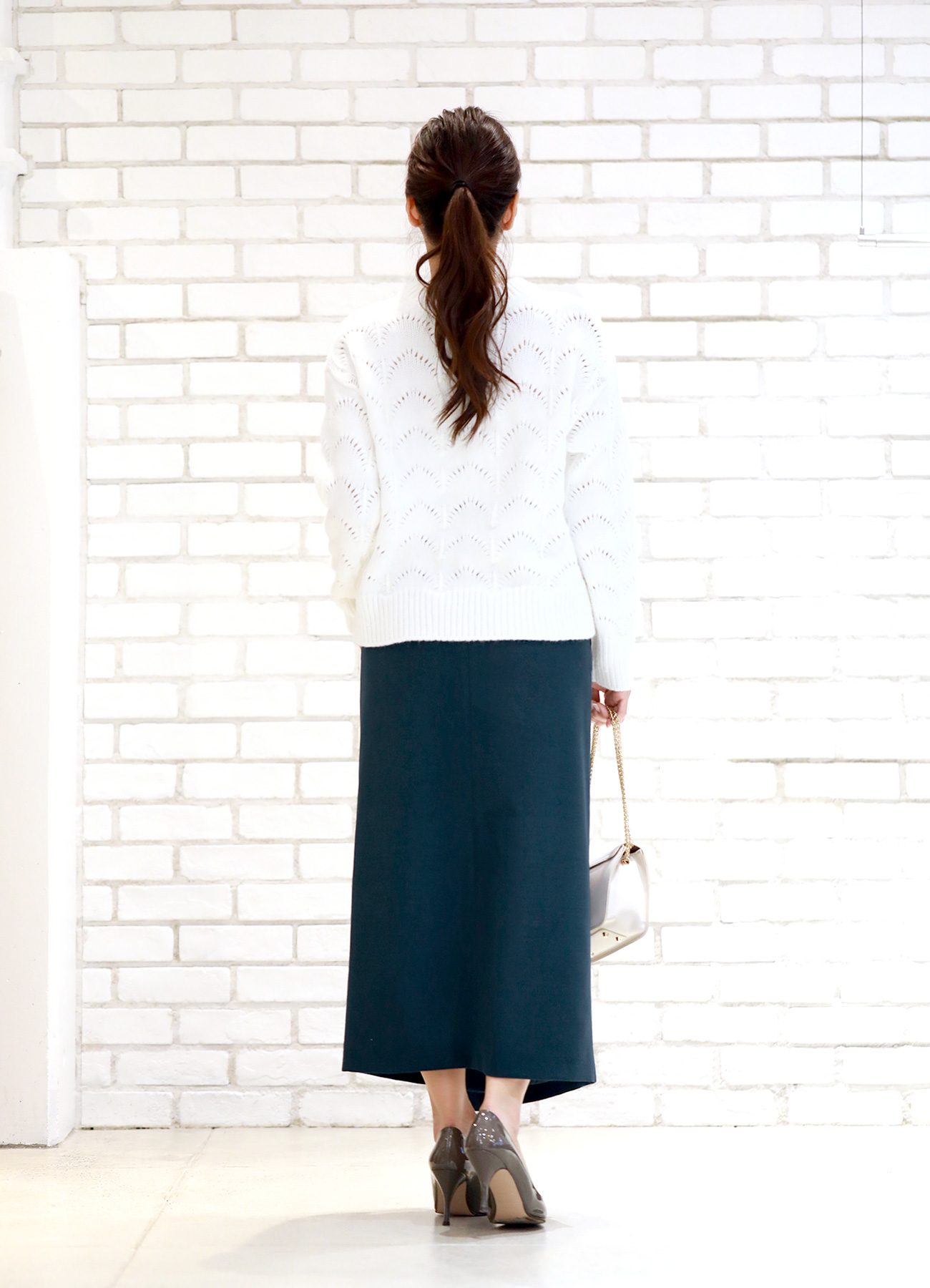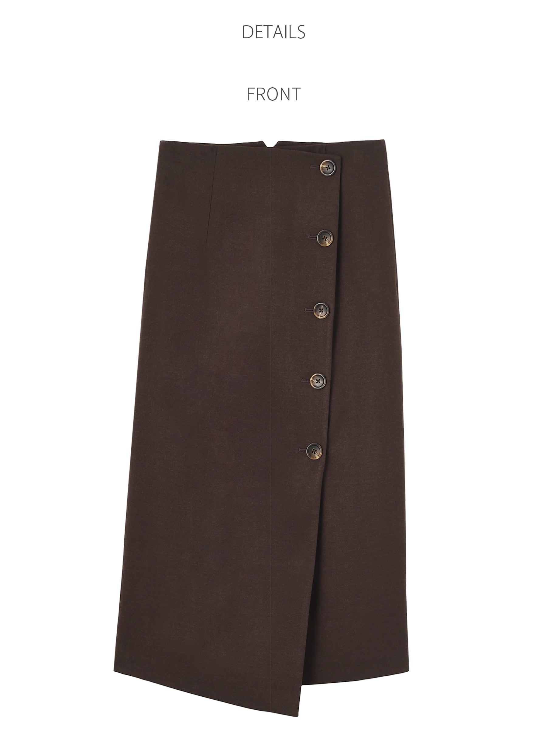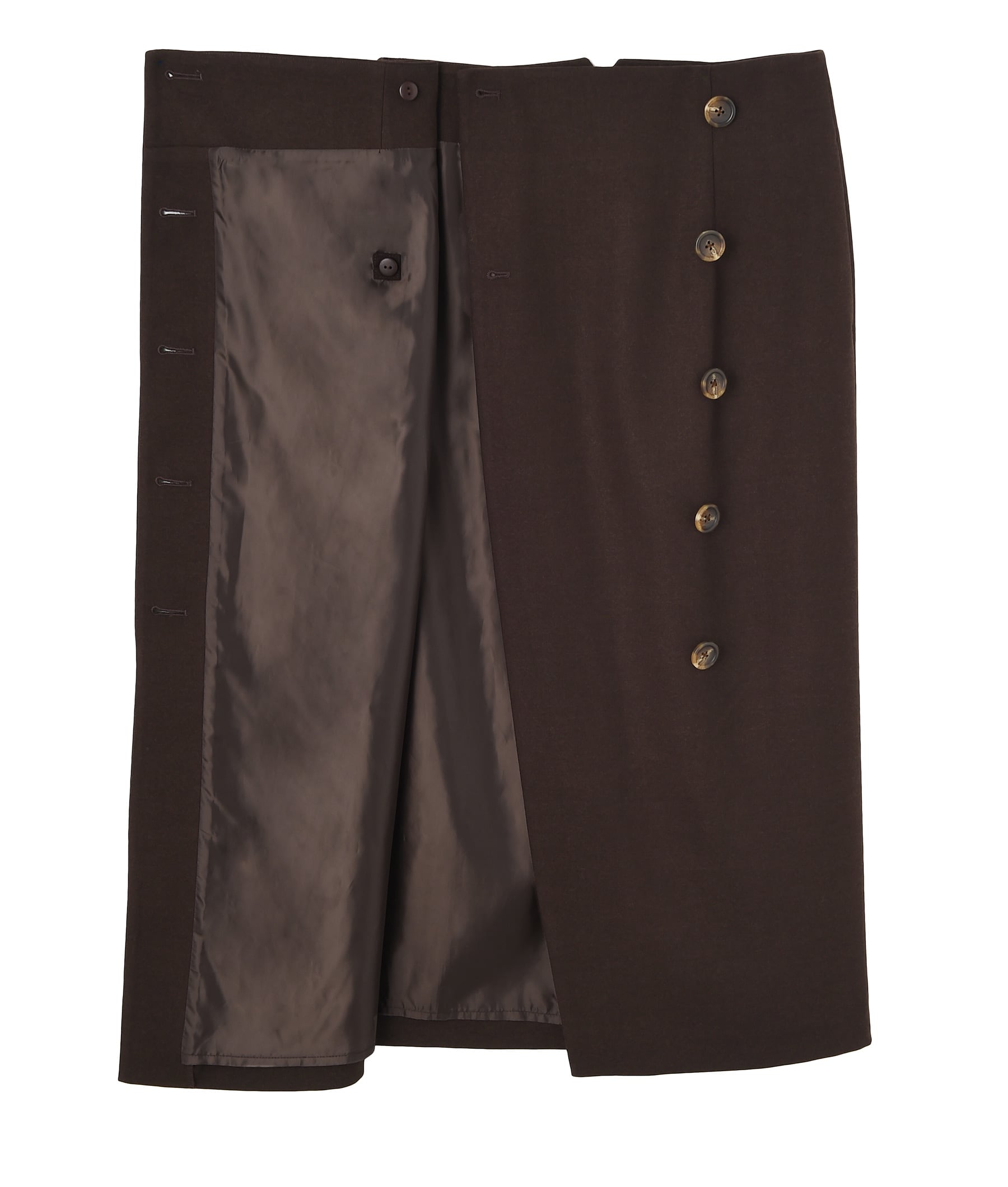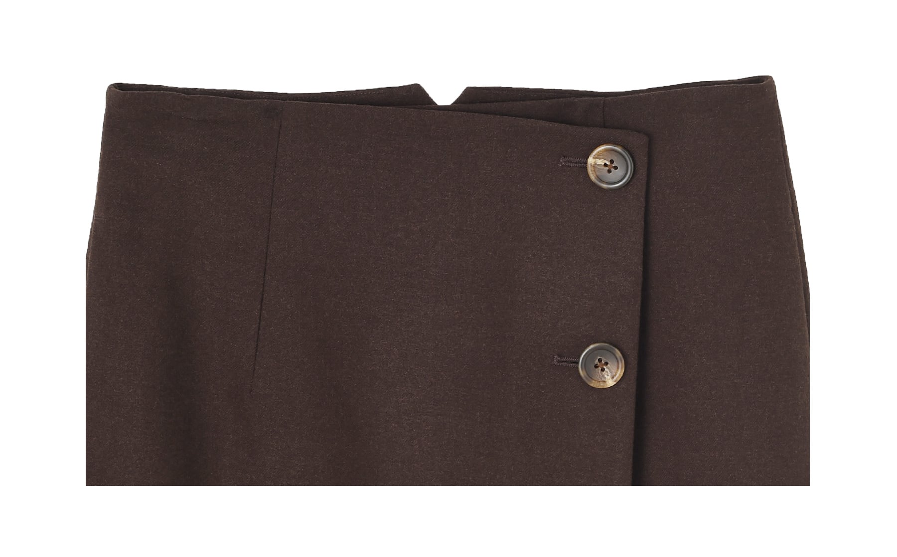【不良品以外の返品・交換不可商品となります】シンプルだけど、何故かオシャレに見える。絶妙カラーとお素材感が効く、美シルエットスカート。さりげないボタン使いで縦ラインを強調してくれる、Iラインのラップスカート。冬らしく温かみのある生地質感で、シンプルながらも雰囲気のある着こなしが作れます。丈感は今っぽく長めですが、段差を付けた裾デザインの角度で重たく見えないところもポイント。計算されたシルエットが美しく、お手持ちのニットと合わせるだけで洗練されたお出掛けスタイルになります。 【デザインについて】◆ウエストにゴムなどの無い、スッキリとした洗練デザイン。◆基本的な設定としては、ややハイウエスト仕様。でも↓◆ジャストウエストでも、腰位置で穿いてもOKなスカート(そのためウエストサイズがピッタリと合っていなくても大丈夫です)。◆普通身長でふくらはぎが完全に隠れる、長めのミディ丈感。◆ポイントになりつつ主張は強すぎない、ブラック系のシックなボタン使い。◆見た目のカッコ良さとスタイルUPの両立を叶える、ななめな裾ライン。◆背面には上部に切れ込みデザイン。ダーツ等のテクを配し、オシャレな印象のバックスタイルに仕上がります。【構造について】◆着脱は大きなボタンを2つ程度外し、行う仕様。◆内側の隠しボタンと外側のボタンを使って固定。◆生地は内側でしっかりと重ね、はだけて脚があらわにならないよう配慮。◆何かと嬉しいサイドポケット付き◆ファスナー:なし◆裏地:あり【生地について】合繊のウール調お素材。冬のジャケットやきちんと感のあるワンピースにも使われる、しっかりとして品のある生地を使用しています。厚みは適度でそれほど厚くはありませんが、見た目も穿き心地も暖か。とくにシワができやすい生地ではありませんが、できた場合はスチーマーで伸ばしていただけます。◆伸縮性:表地は僅かにあり/裏地はなし◆透け感:なし◆着用可能時期:9月~3月頃まで【お色について】◆ブラウン:普通の茶色とダークブラウンの間の明度を持つ、中間的な明るさのブラウン(印象としてはやや深め)。赤味が強いなどのクセを持たない、使いやすいチョコレートブラウンです。通常販売価格:9,240円【販売理由:販売終了商品】【お客様へのお願い】メルカリ等、個人および法人販売サイトにおける転売目的でのご購入は、ご遠慮いただきますようお願いいたします。