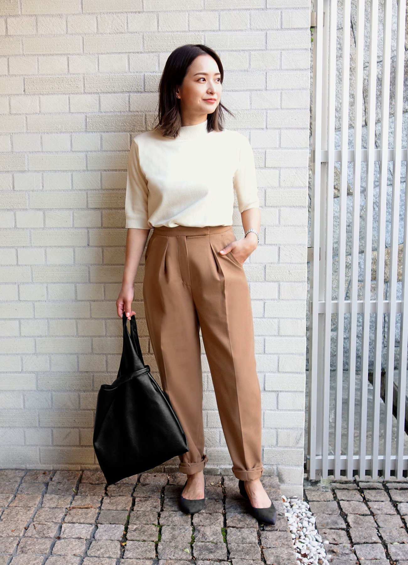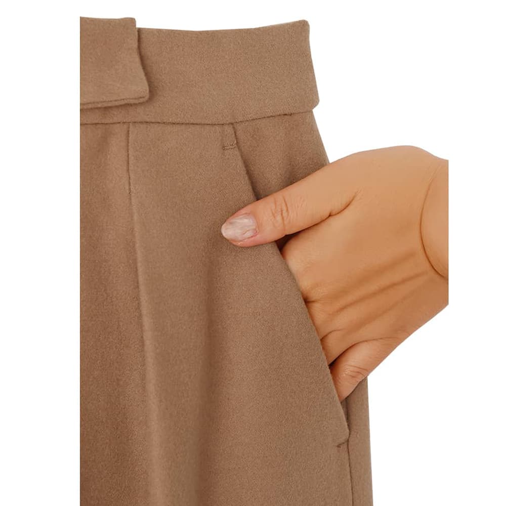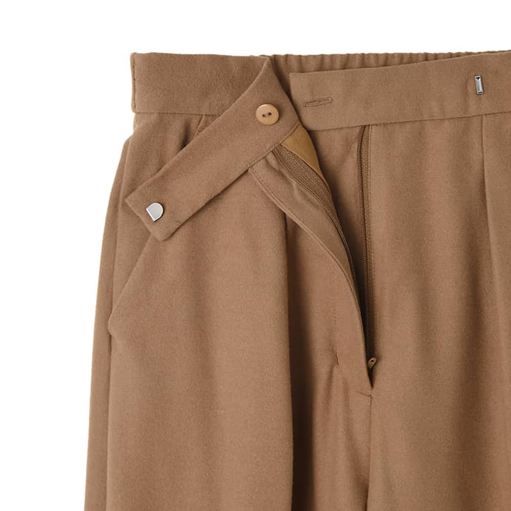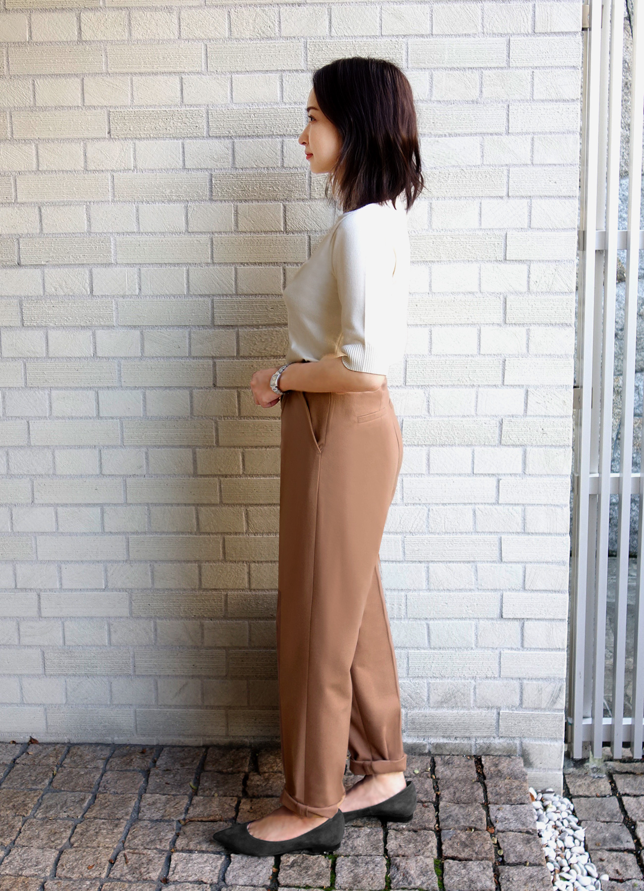【不良品以外の返品・交換不可商品となります】単品使いもモチロンOK-ファッション性のある非キャリア系-おしゃれなセットアップが作れるシリーズウールライクな暖か厚生地を使用した、季節感たっぷりな質感が素敵なゆったりテーパードパンツ。キャメルとチャコールグレーに関しては、同シリーズのジャケットと合わせてオシャレなセットアップが作れます。テーパードの中でも脚のラインはゆったりめなフォルムでスタイルを問わず、スニーカー合わせなどのカジュアル寄りにもコーデが可能な気取りのないデザイン。しっかりとした暖かい生地で、真冬でも強い味方となるパンツです。※シリーズの中で、ピンクはこちらのパンツだけでのみお作りしています。◆プラス情報◆そのままでも十分に暖かいパンツですが、中に滑りの良い裏地付きで、タイツやストッキングを穿きたい方にも使いやすいタイプです。【デザインや仕様について】◆ウールライクな厚生地を使用したテーパードパンツ。◆やや太めなシルエットで気負わずに穿けるカタチ。◆シリーズのジャケットとセットアップが作れるアイテム(※ピンクは除く)。◆フロントにタックを入れた立体的なデザイン。◆ごく定番的なフルレングス丈感。お好みで裾上げもOKな裾仕様。◆センタープレス入り。◆ウエスト背面ゴム仕様。◆真冬も快適な暖かい穿き心地。◆両サイドにポケットあり◆ヒップ部分に飾りポケットあり(使用不可)◆裏地あり【丈感について】モデル(166cm)が穿いてもフルレングスですが、身長163cmのスタッフ、身長157cm程度のスタッフ達が穿いても、問題なく穿けるパターンになっています。もっと小柄な方には裾上げが必要な場合も想定できますが、大体の方はそのまま普通にお使いいただけます。【生地について】フェルトに近いような感じの、冬っぽい質感がオシャレな生地。アウターにも使用される生地で、厚みもしっかりとしています(すごくぶ厚いわけではありません)。◆含有率が低いため『ウールライク』と表現しておりますが、実際に10%のウールが入ったお素材です。◆とくに毛羽立ちやすい生地ではありません。◆とくにシワになりやすい生地ではありません。◆伸縮性:なし(十分にゆとりがあり、動きづらさはとくに感じません)◆光沢感:なし◆透け感:なし【お色について】◆キャメル:濃いキャラメルのようなこっくりカラー。強くない程度にほんのりと赤味のあるタイプのキャメルです。◆チャコールグレー:ダークグレーよりもさらに深いグレーです。◆ピンク:くすみ感などは一切入れていない、明るい印象のピンク。ハッキリとしつつも強くはなく、気分が明るくなるような楽しい印象の発色です。ローズ感やパープル感などは一切ない、純粋なピンク系統のお色です。【お手入れについて】※こちらはアウターライクなオシャレ生地を使用しているためクリーニング商品となります。※スタッフでも手洗いをする生地ではありませんが、こういった生地の場合はよほど汚れなければ洗わないのが一般的で、シーズン中に1回&シーズンオフに1回クリーニングに出す程度で十分です。※日常的な消臭・殺菌等のお手入れにはスチーマーのご使用がお薦めです。※お洗濯やお手入れは自己責任でお願いいたします。お手入れにまつわるトラブルが生じましても、ご返品・ご交換・ご返金の対象外となりますので予めご了承くださいますようお願いいたします。仮に『書いてある通りにやった』ということでも、恐れ入りますがその事実確認が困難なことから保障はできかねます為、免責とさせていただきます。通常販売価格:9,900円【販売理由:販売終了商品】【お客様へのお願い】メルカリ等、個人および法人販売サイトにおける転売目的でのご購入は、ご遠慮いただきますようお願いいたします。